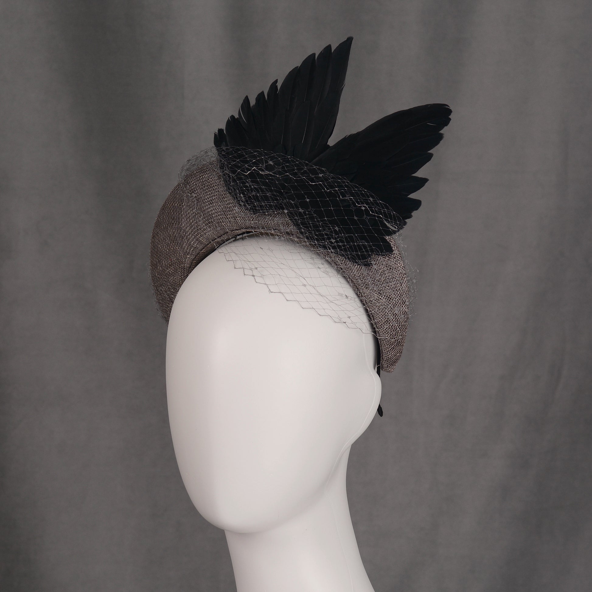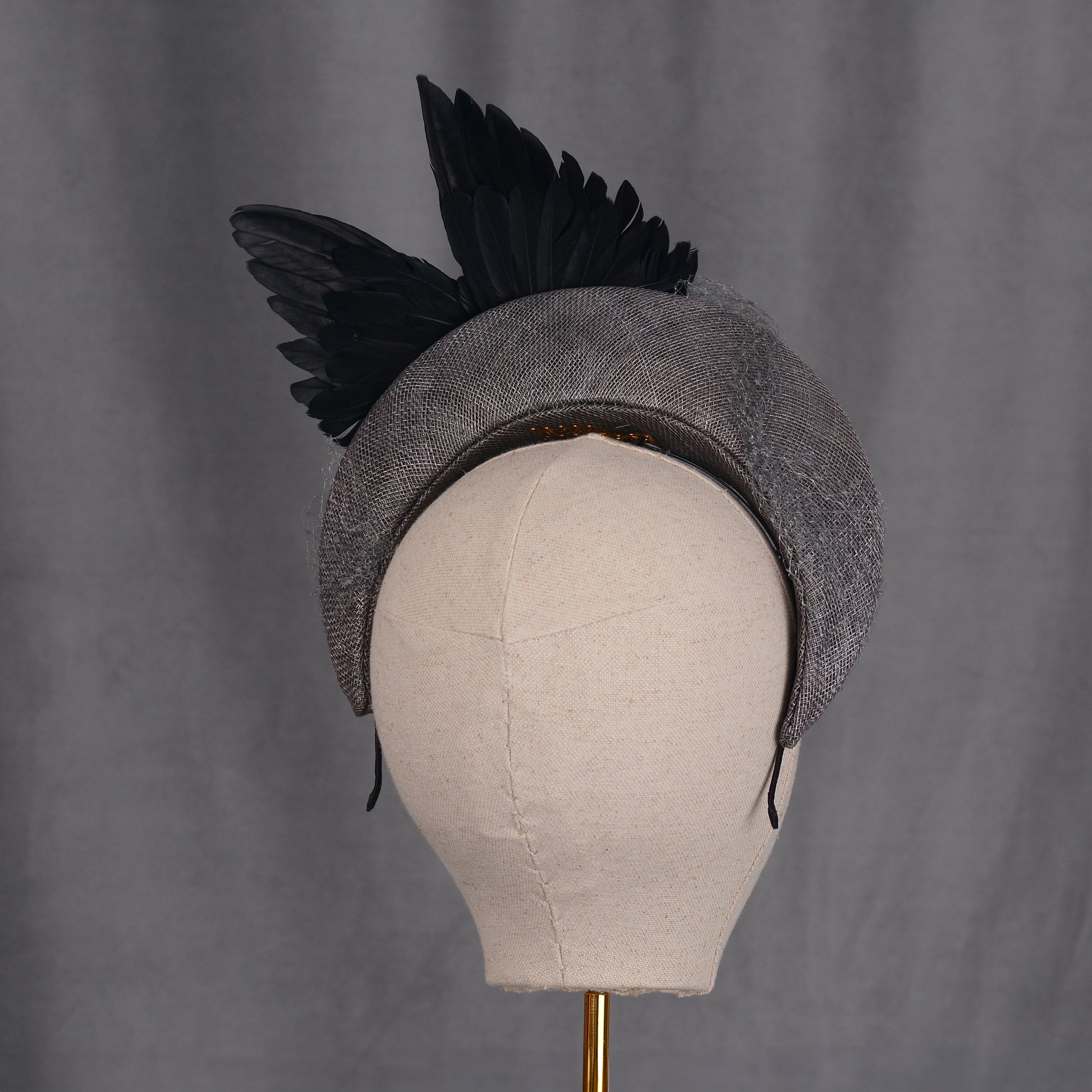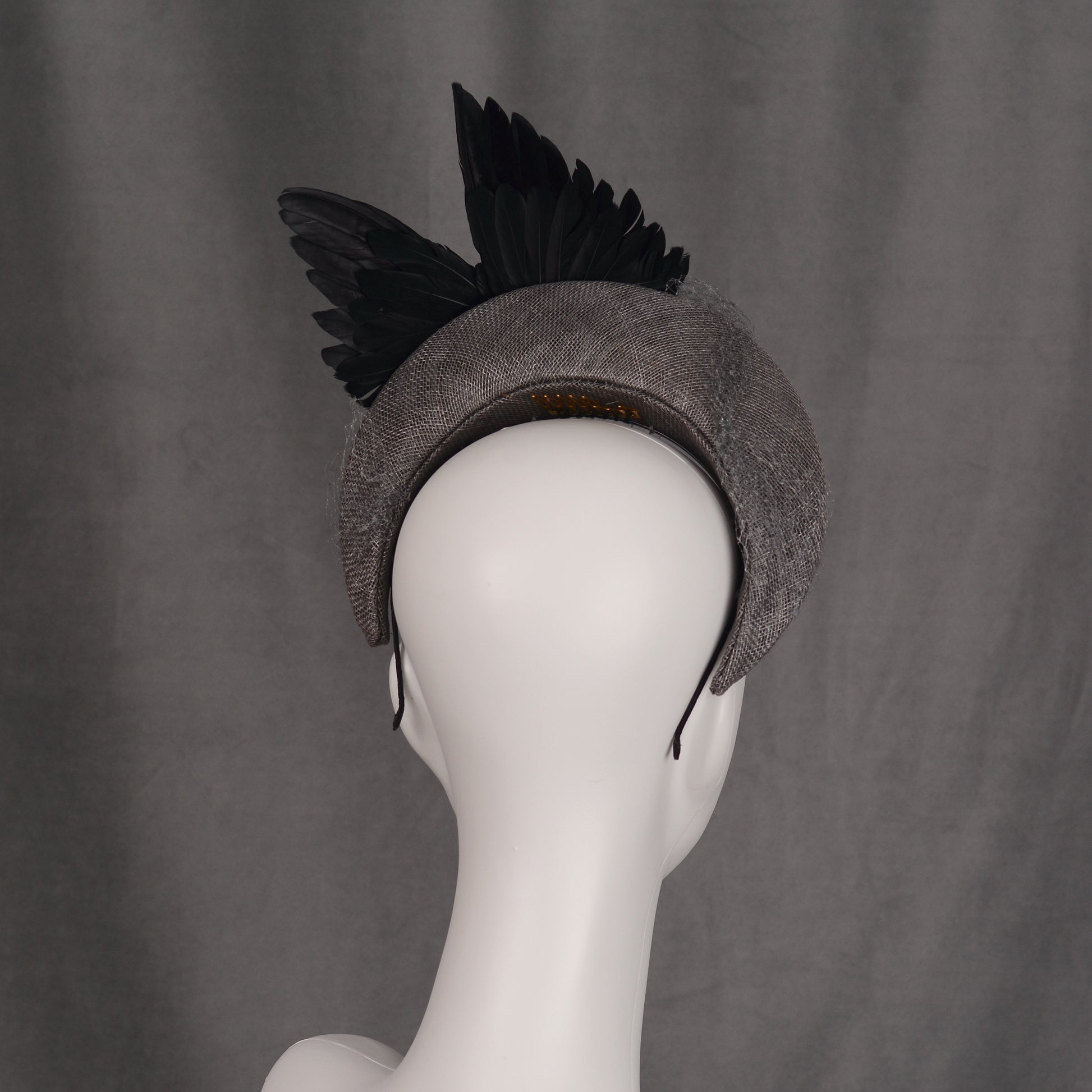 This classic and striking ready to wear fascinator in tonal shades of grey and black. Features a raised halo headband base that tapers to a pyramid point hand-blocked in graphite grey sinamay straw trimmed with a pair of black "bird wings" crafted in duck feathers wrapped in the most delicate vintage grey veiling that skims the forehead adding depth and texture.