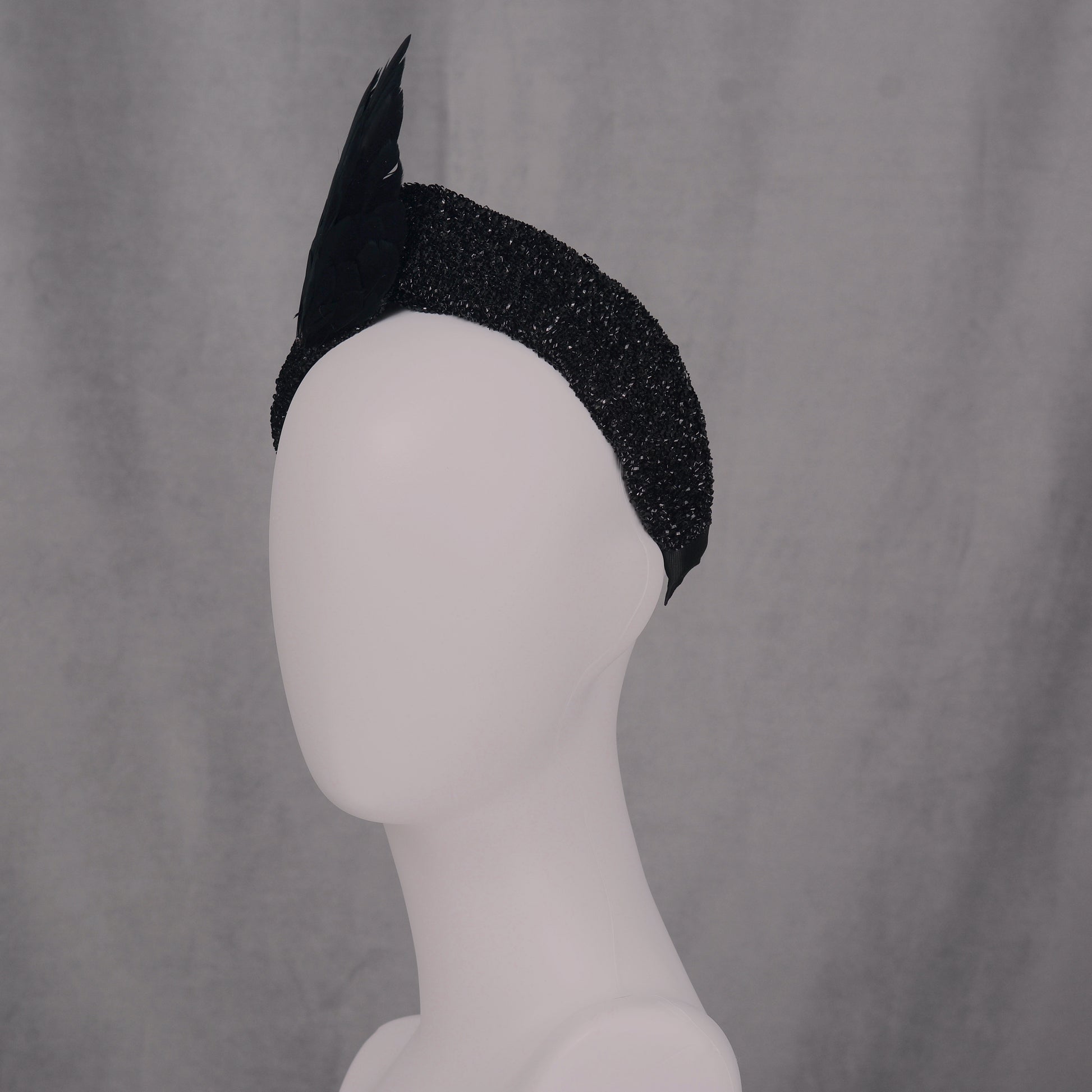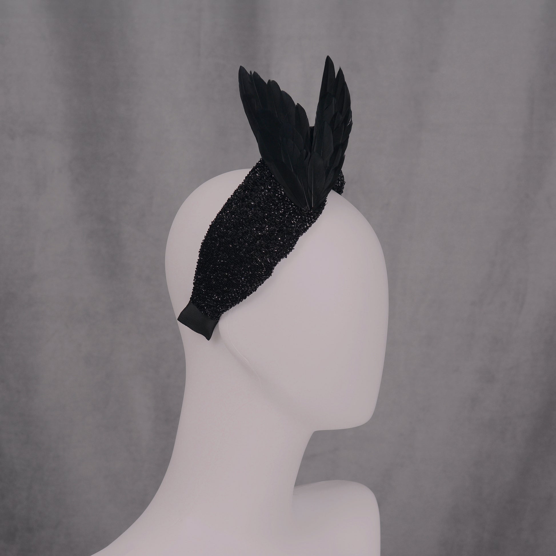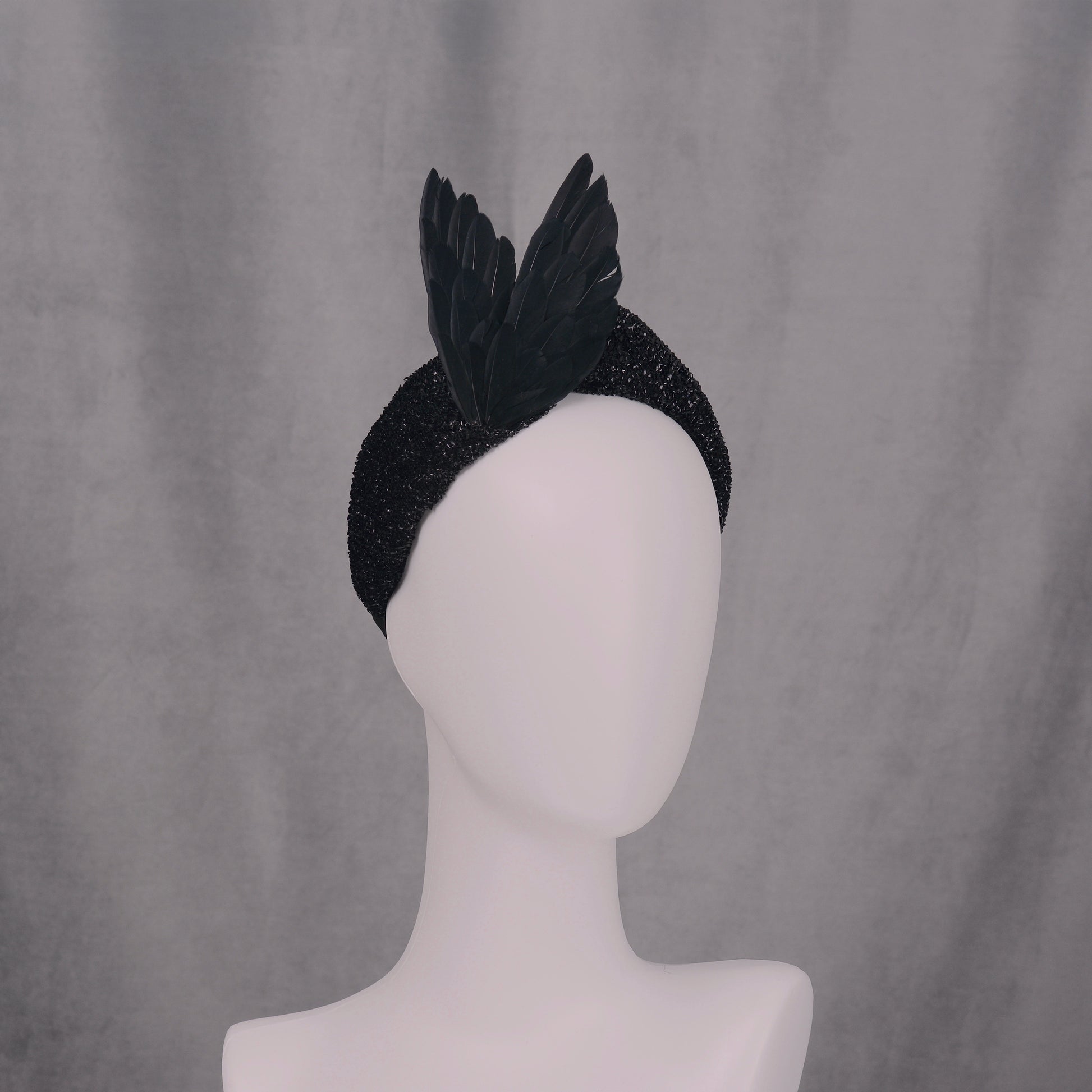 A classic twist turban in a sparkle knit fabric that subtly catches the light with a pair of jet black wings forming an elegant V at the crown. The perfect gothic couture headband to finish an Addams Family of Vampire look whether you are attending a party or a funeral.