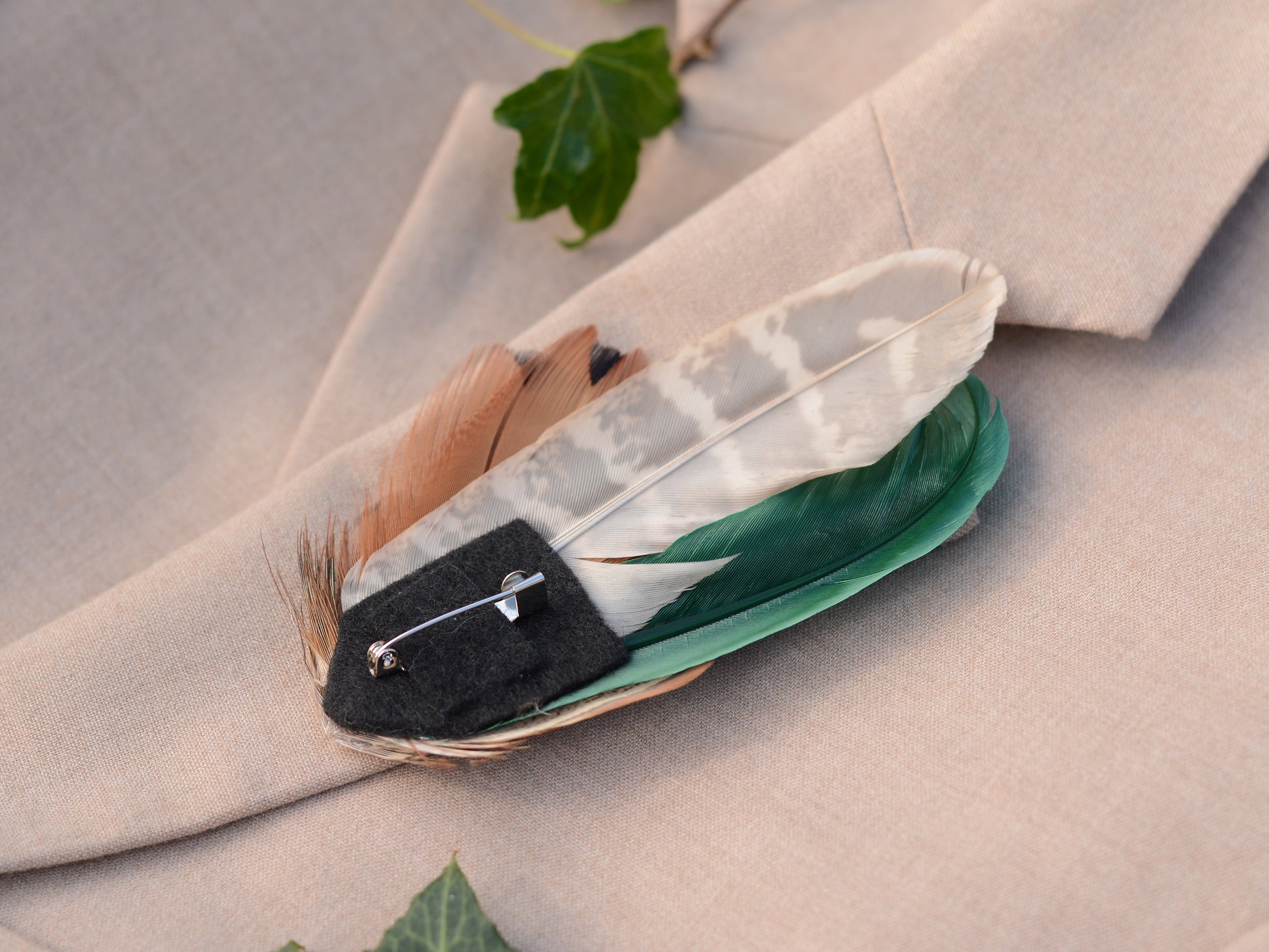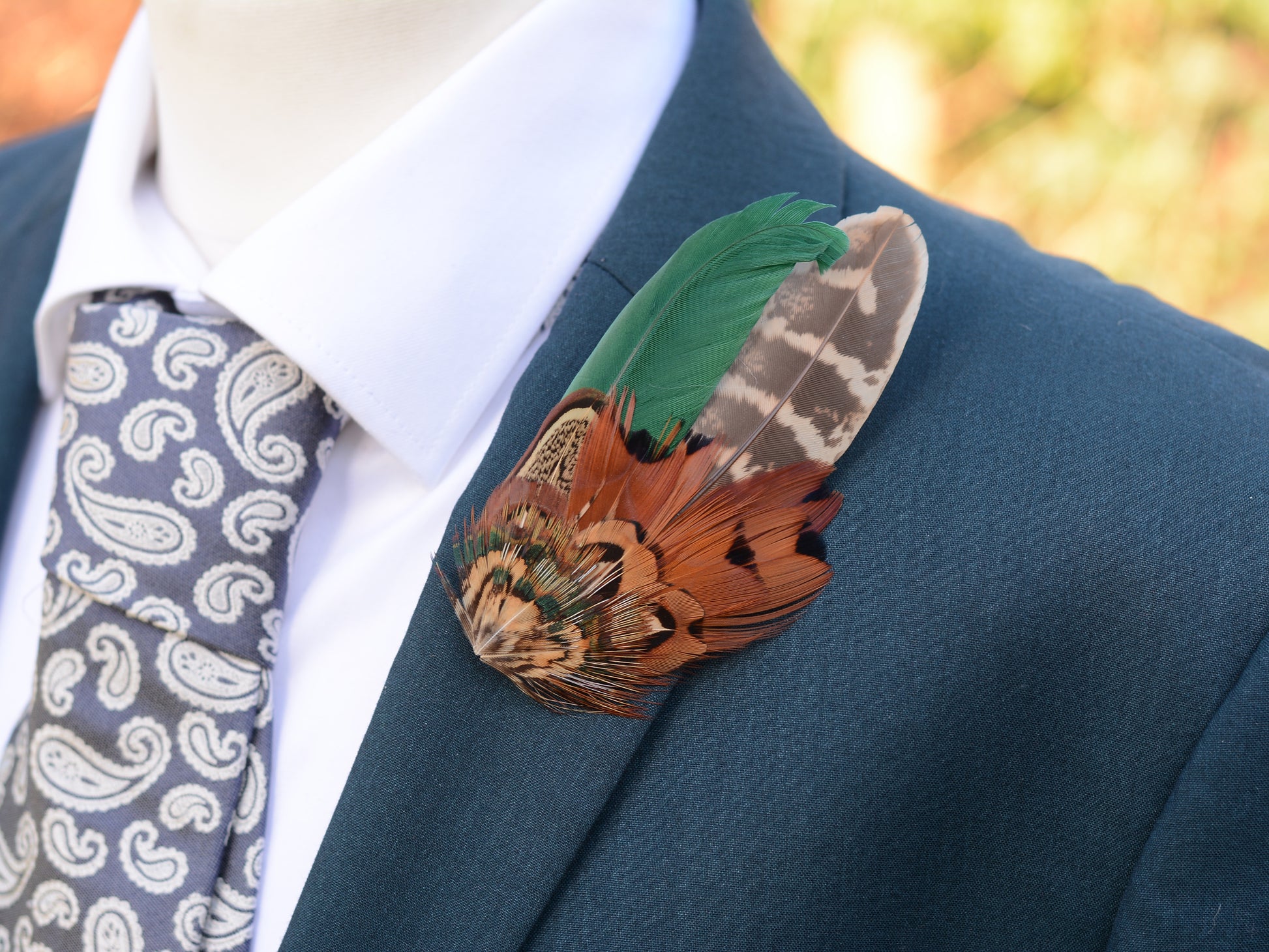 One of a kind feather lapel pin boutonniere featuring a mix of natural pheasant feathers in blacks, golden blondes, browns, coppers and greyish blues with beautiful natural markings and textures complimented with a dyed green duck feather.
