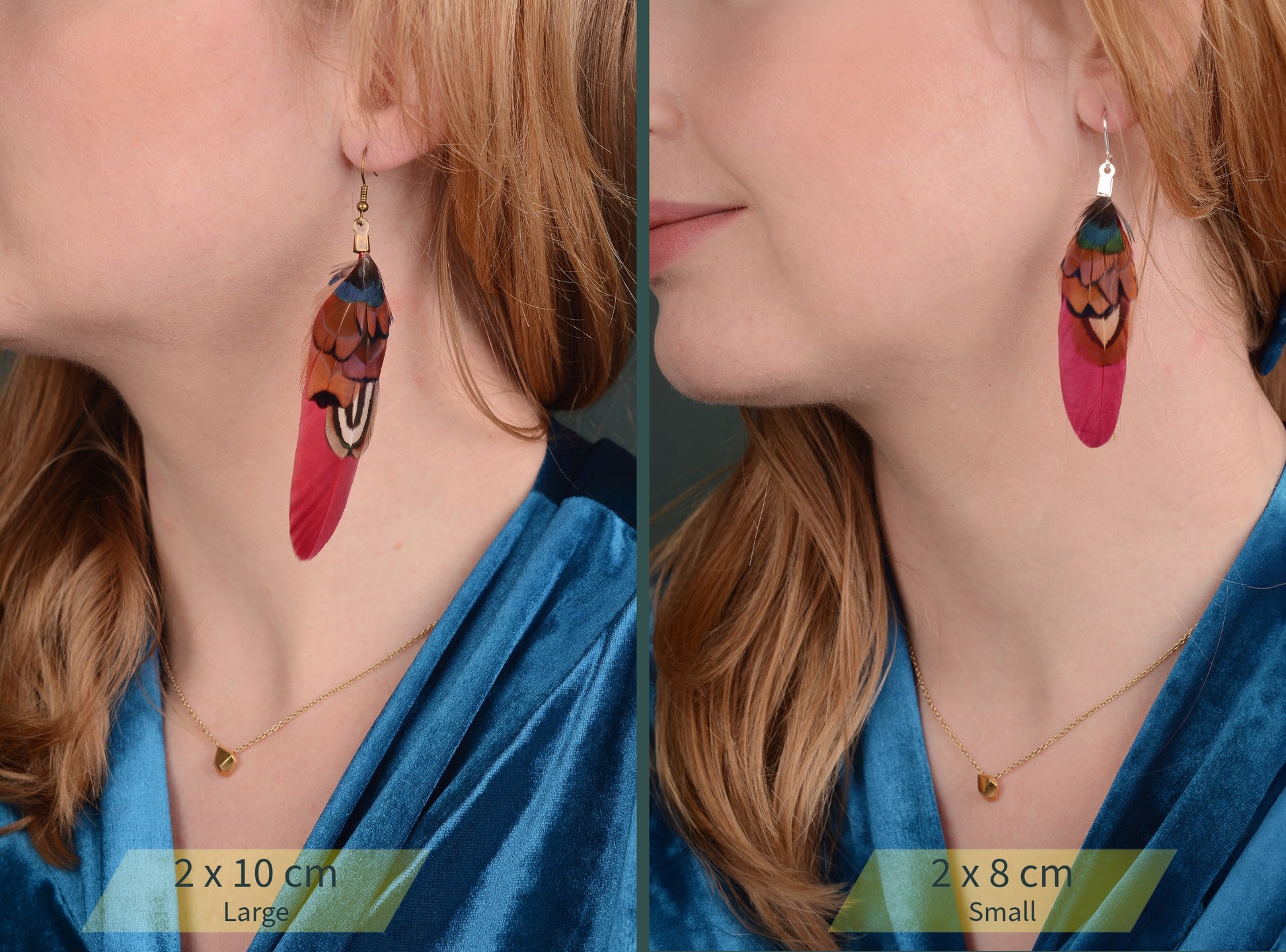 Feather drop earrings featuring burgundy duck wing feathers layered with crimson rooster feathers and iridescent pheasant feathers in rich coppers, burgundy, blue -greens and black. These earrings have beautiful movement and are best showcased fluttering in the summer breeze. The perfect boho accessory for summer festivals and events.