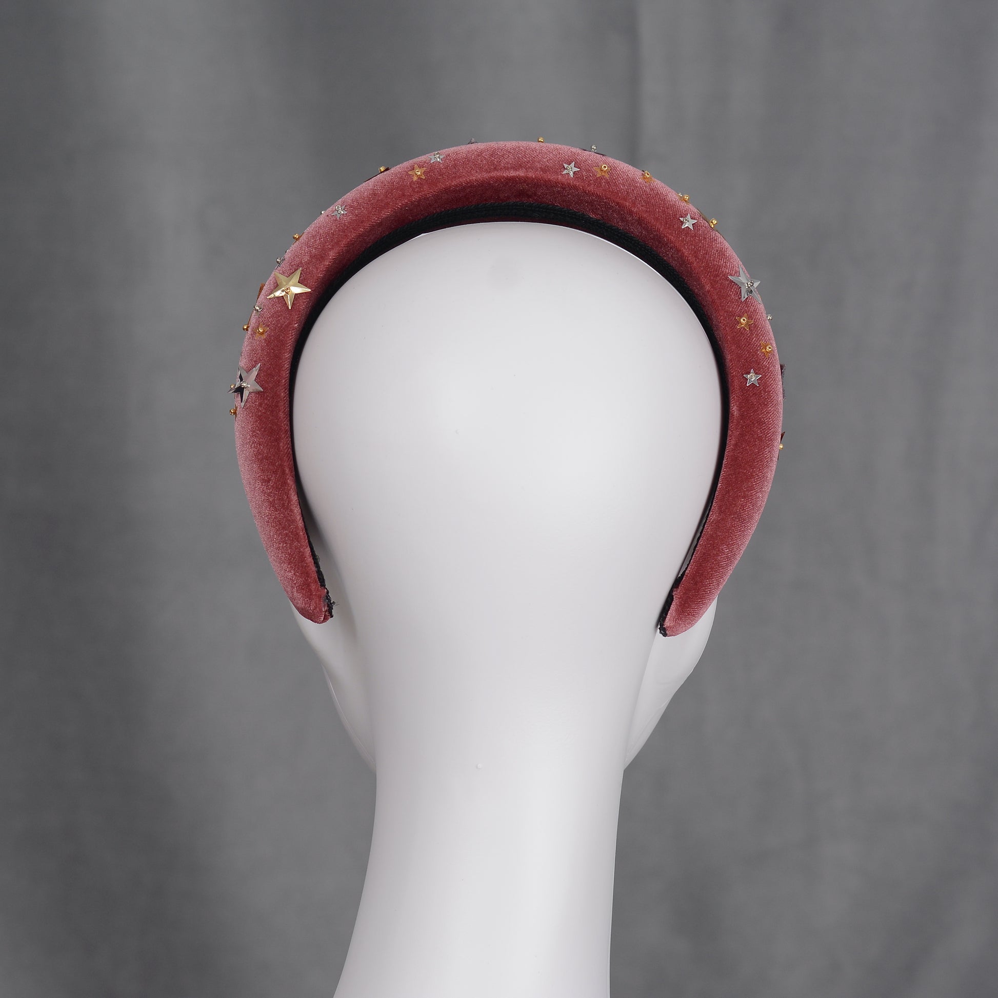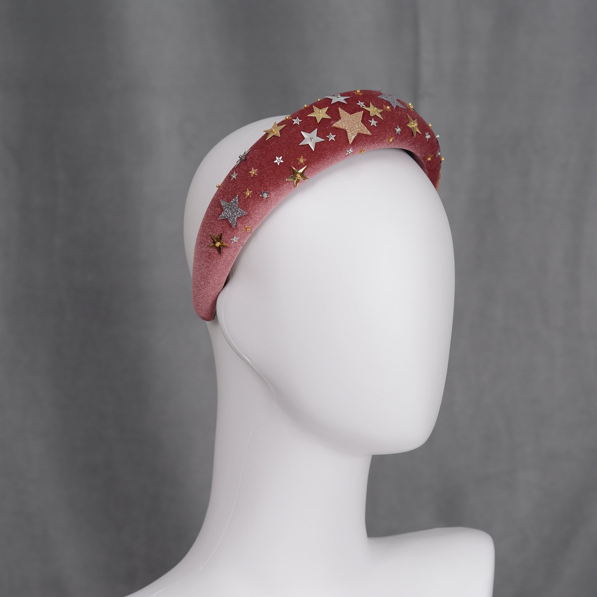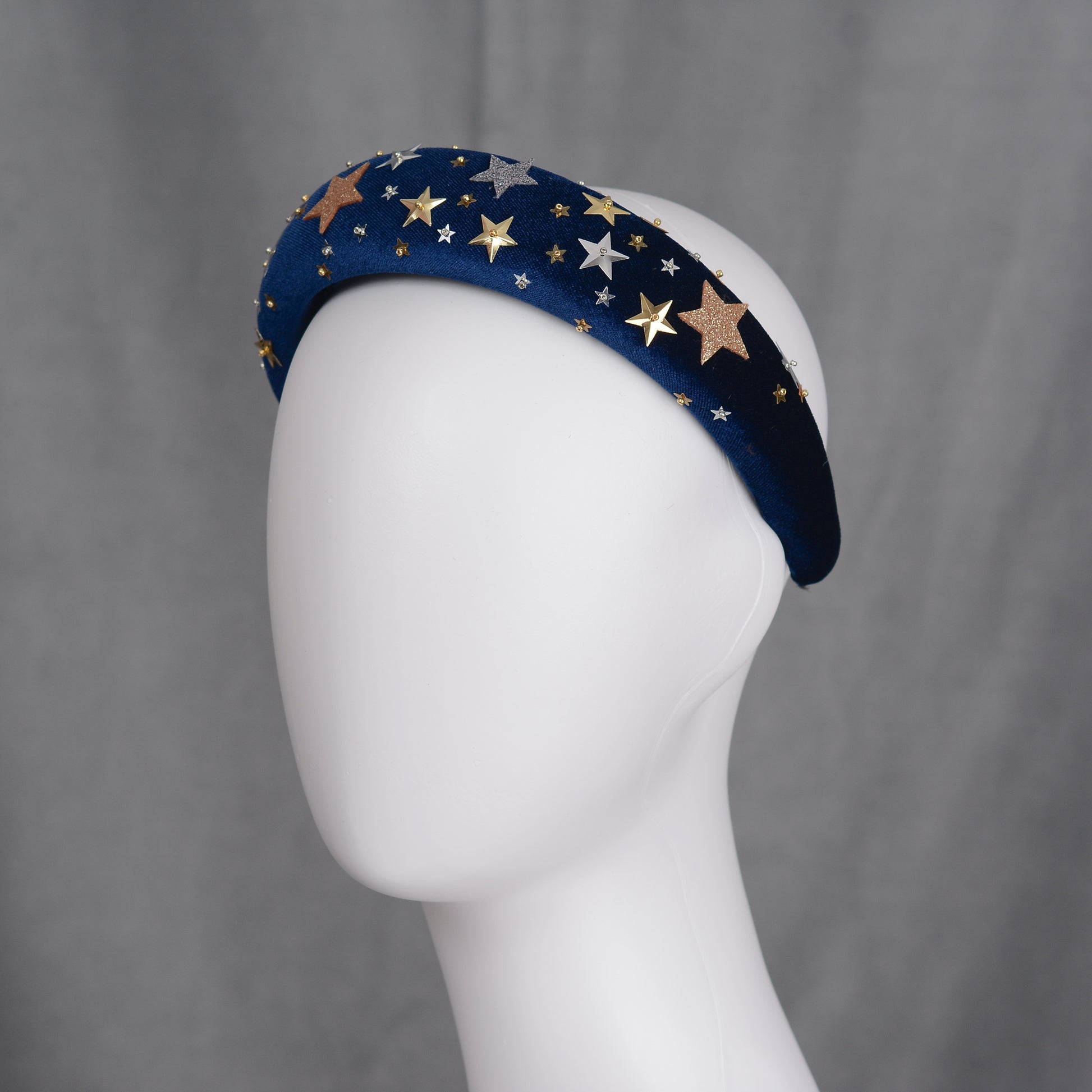 Celestial Padded Velvet Sequin Headband with Gold and Silver Stars in Navy Blue or Dusky Pink