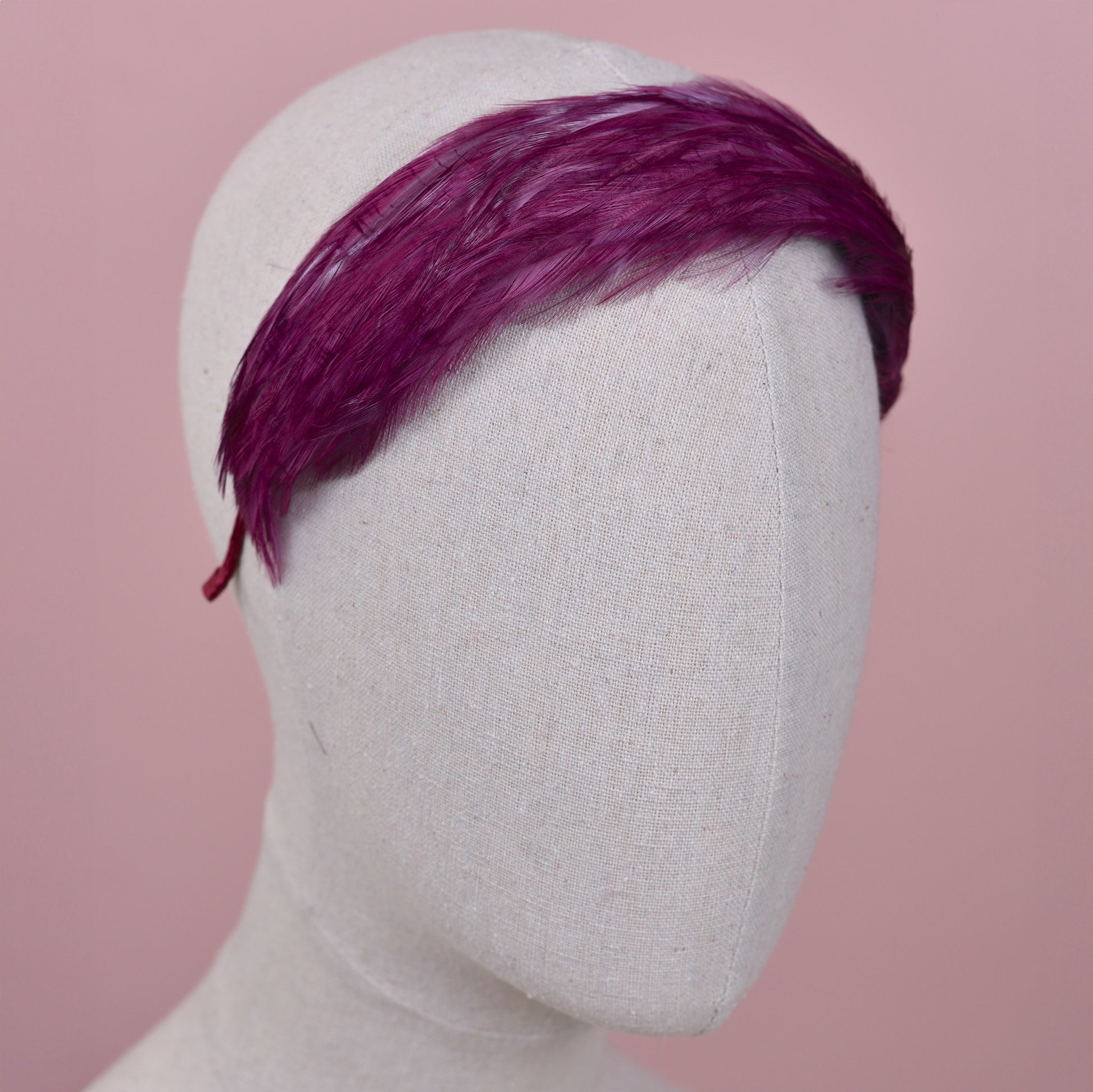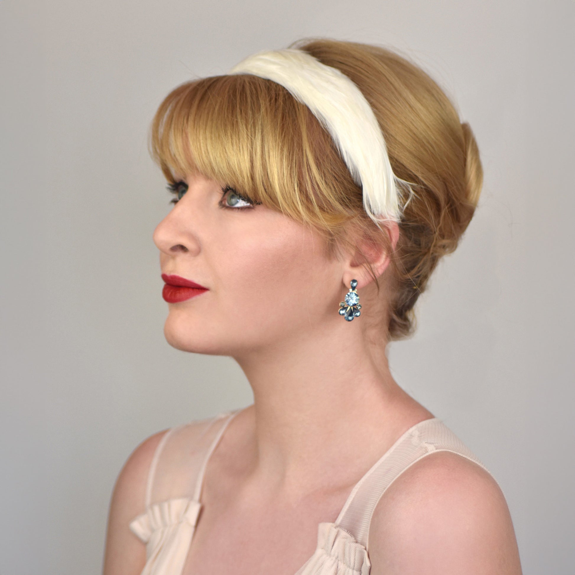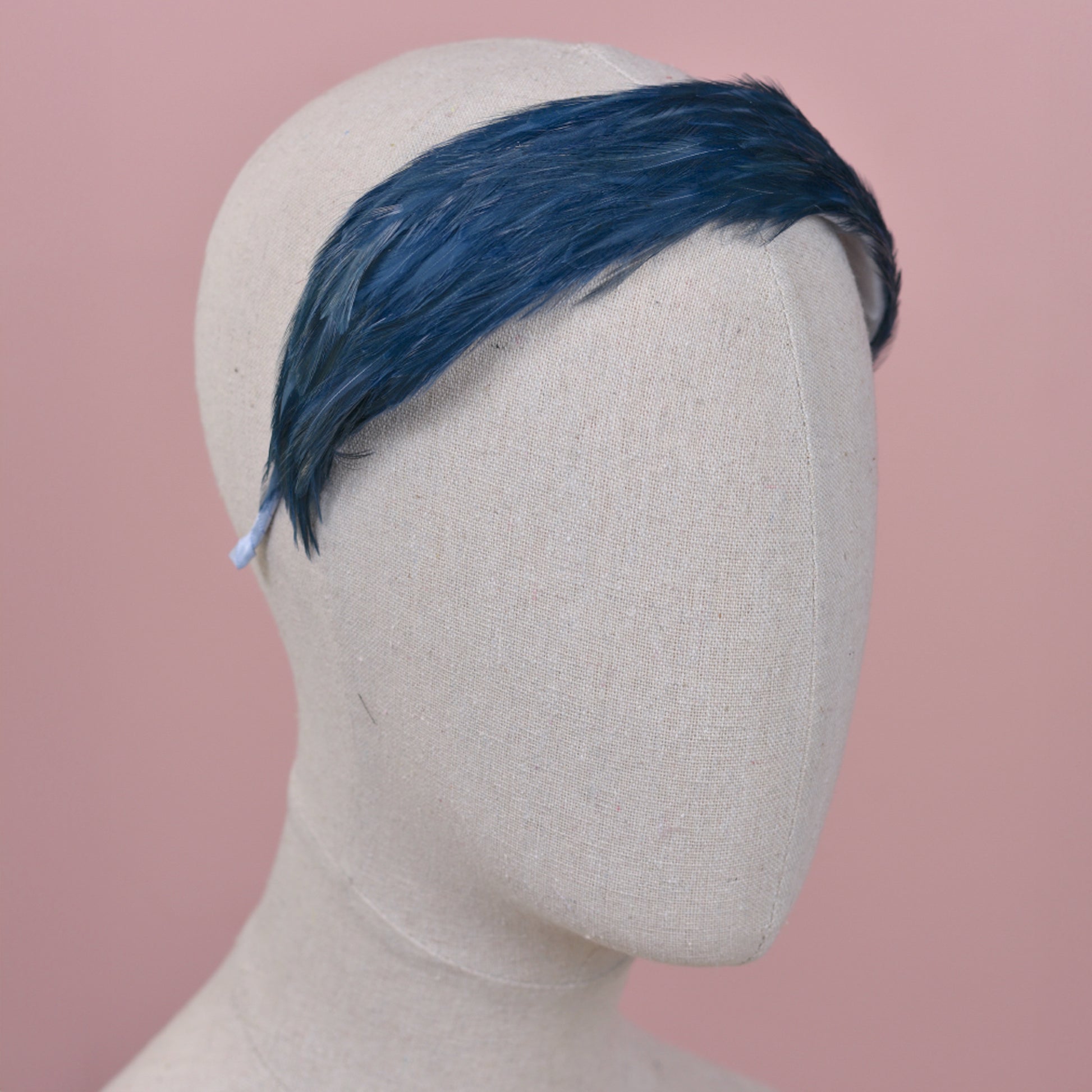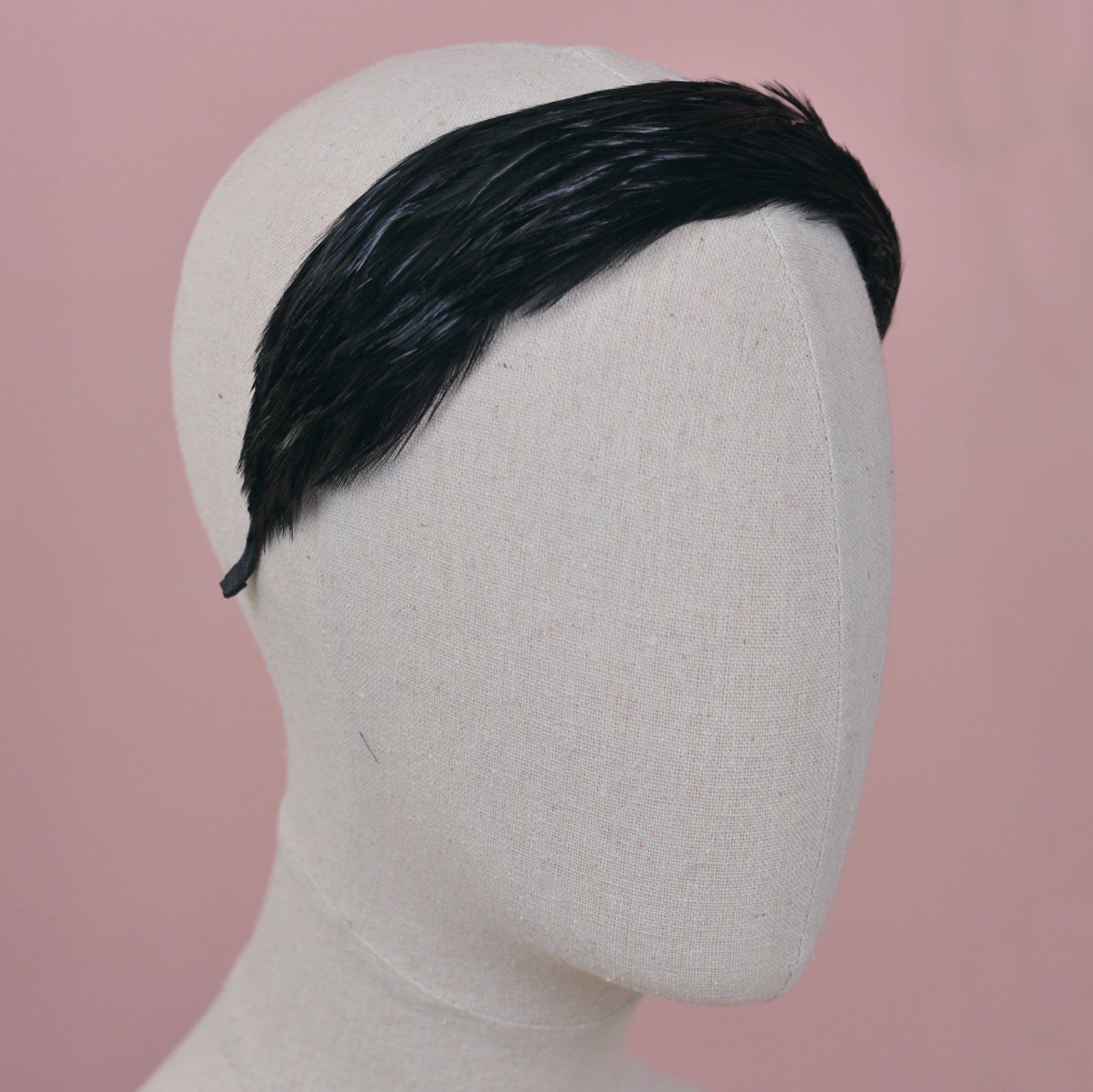 Elegant feather headband featuring hundreds of hand placed soft and sumptuous tiny rooster feathers wrapping across the crown of a narrow metal headband hand wrapped in matching satin ribbon.