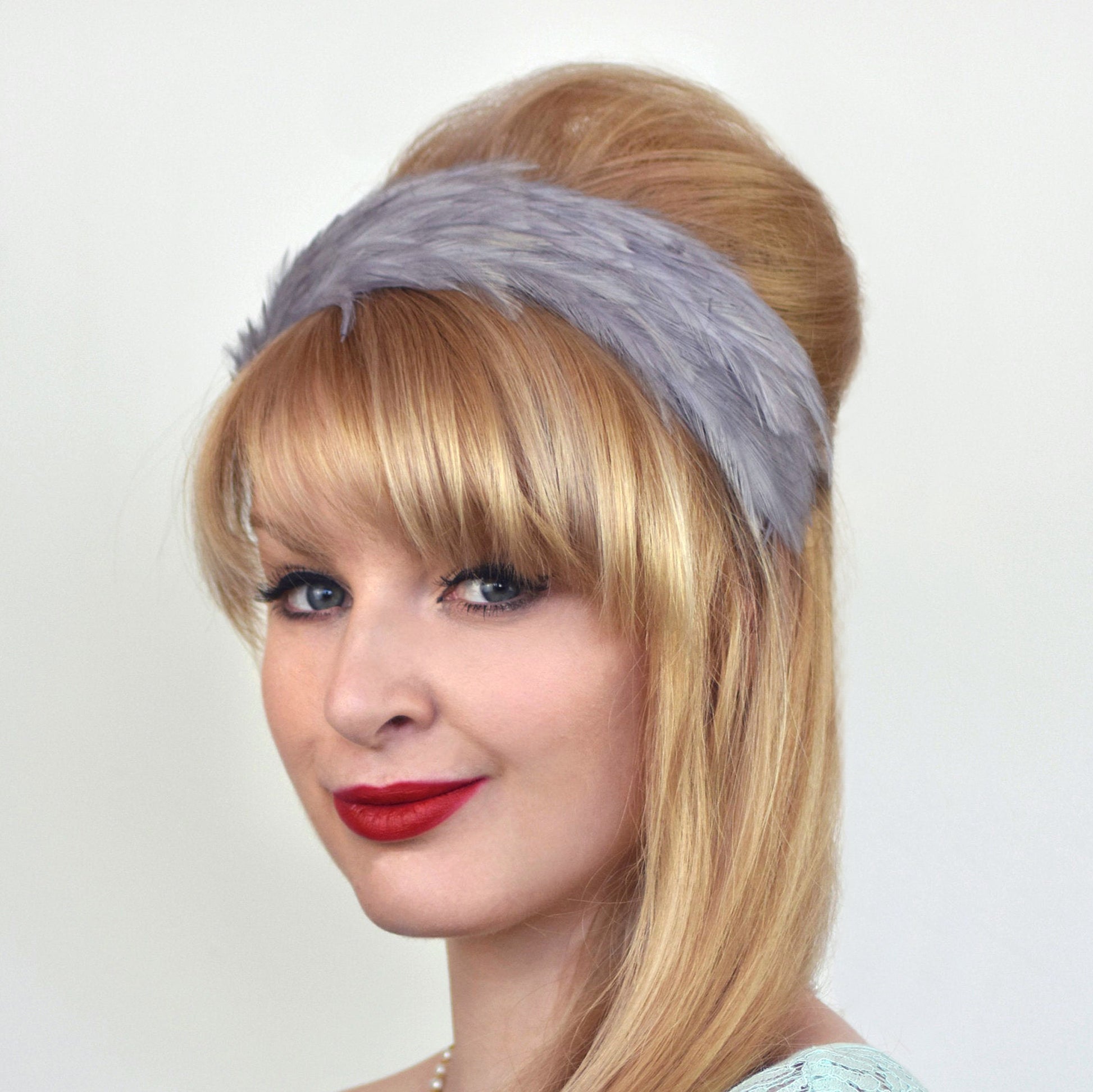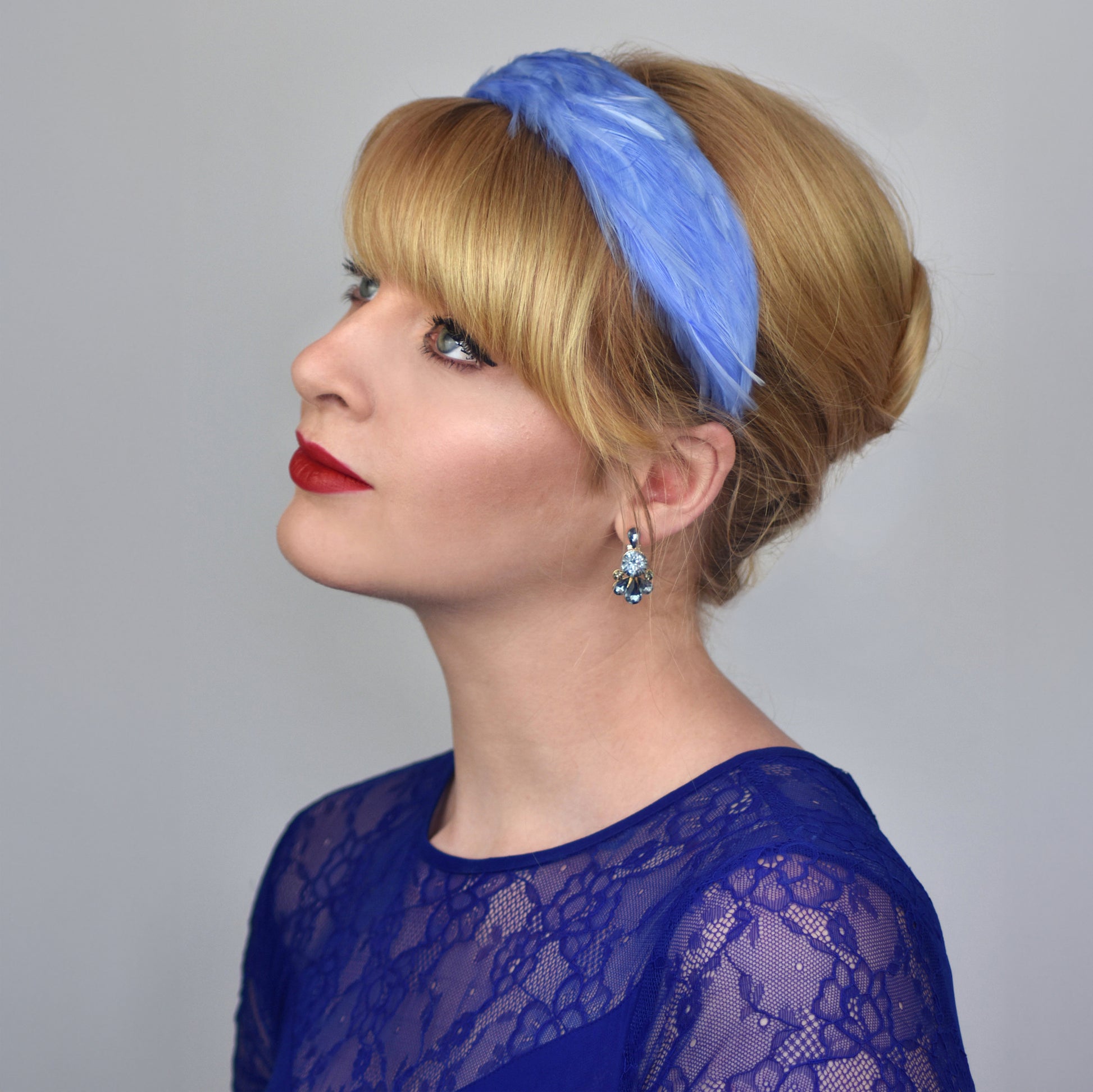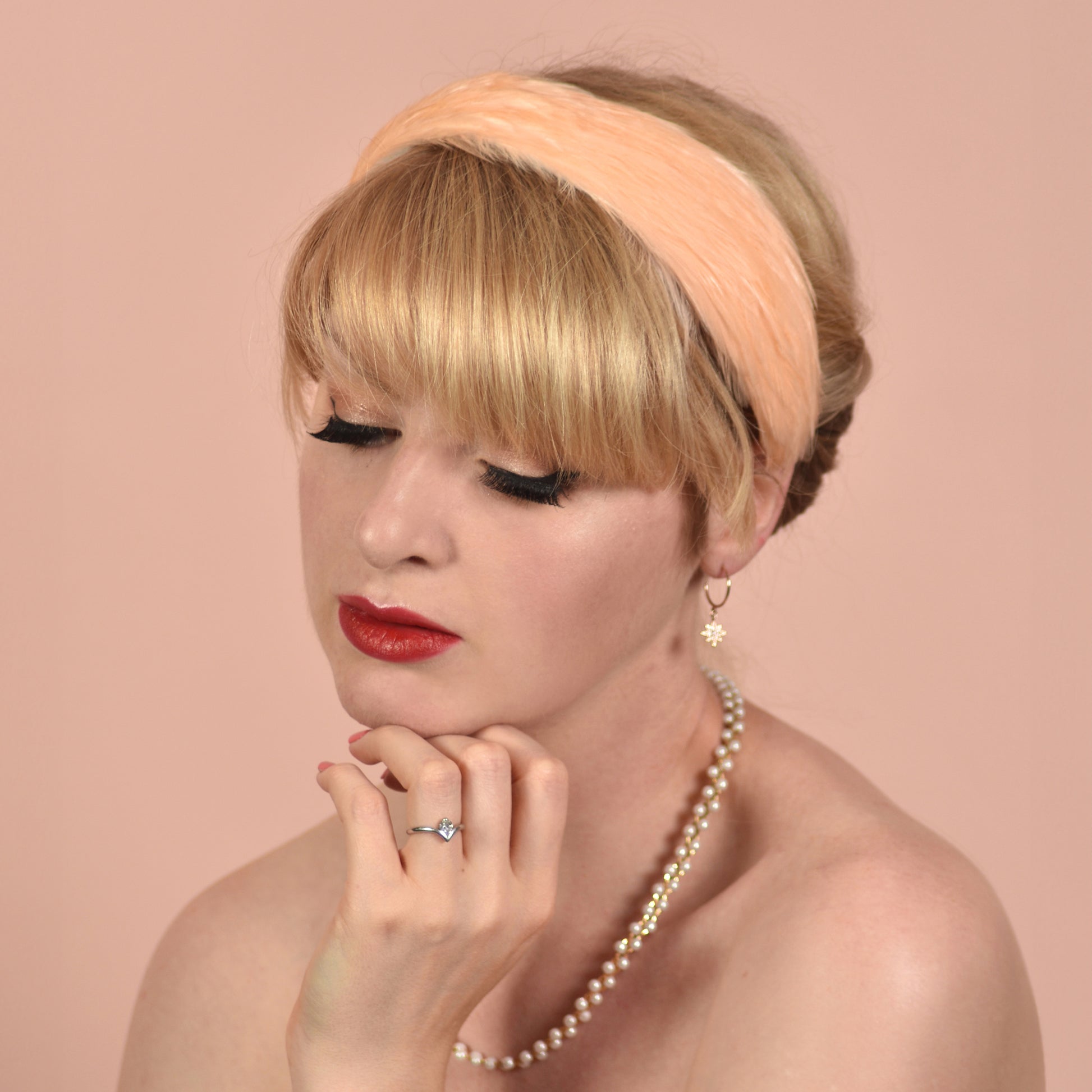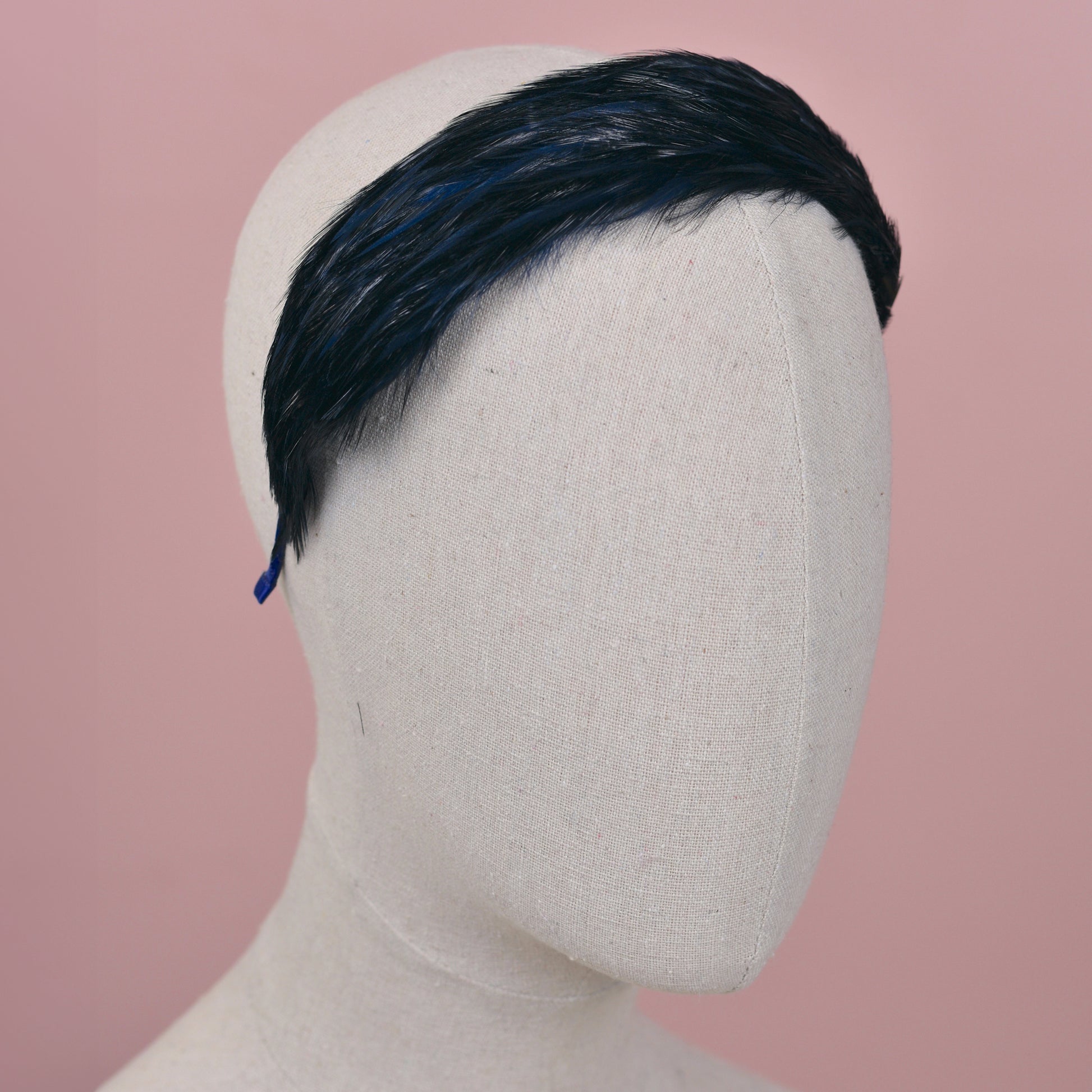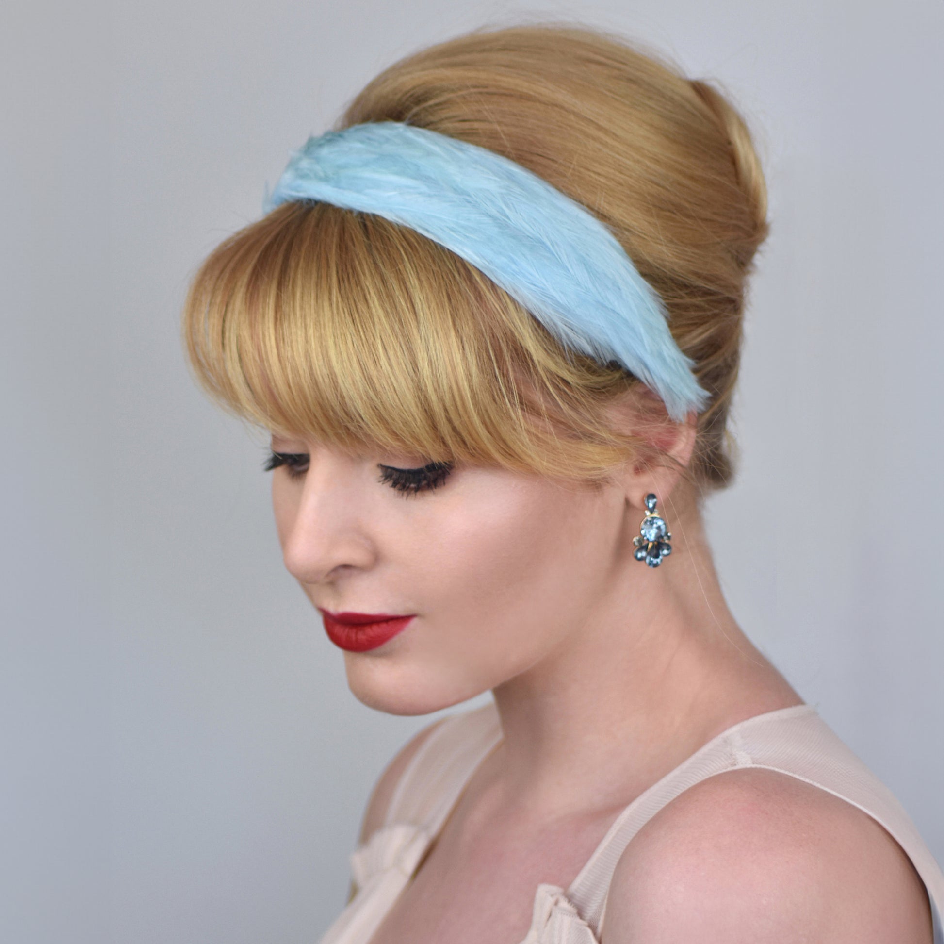 Elegant feather headband featuring hundreds of hand placed soft and sumptuous tiny rooster feathers wrapping across the crown of a narrow metal headband hand wrapped in matching satin ribbon.