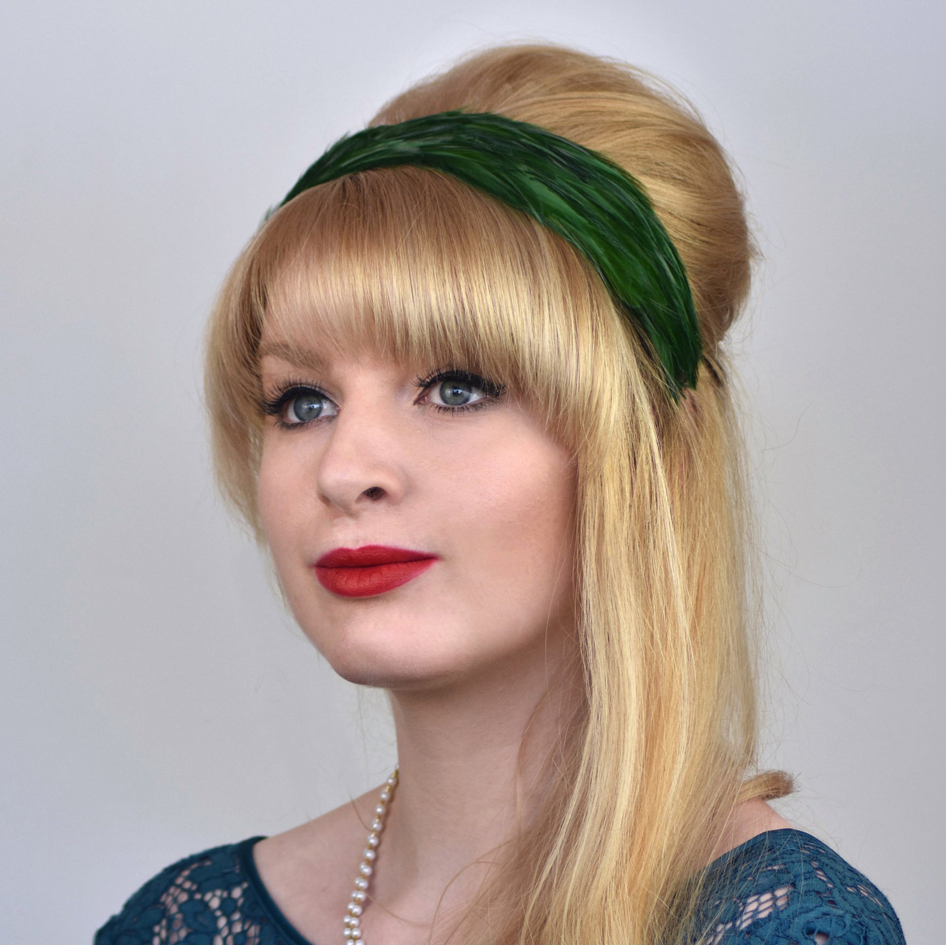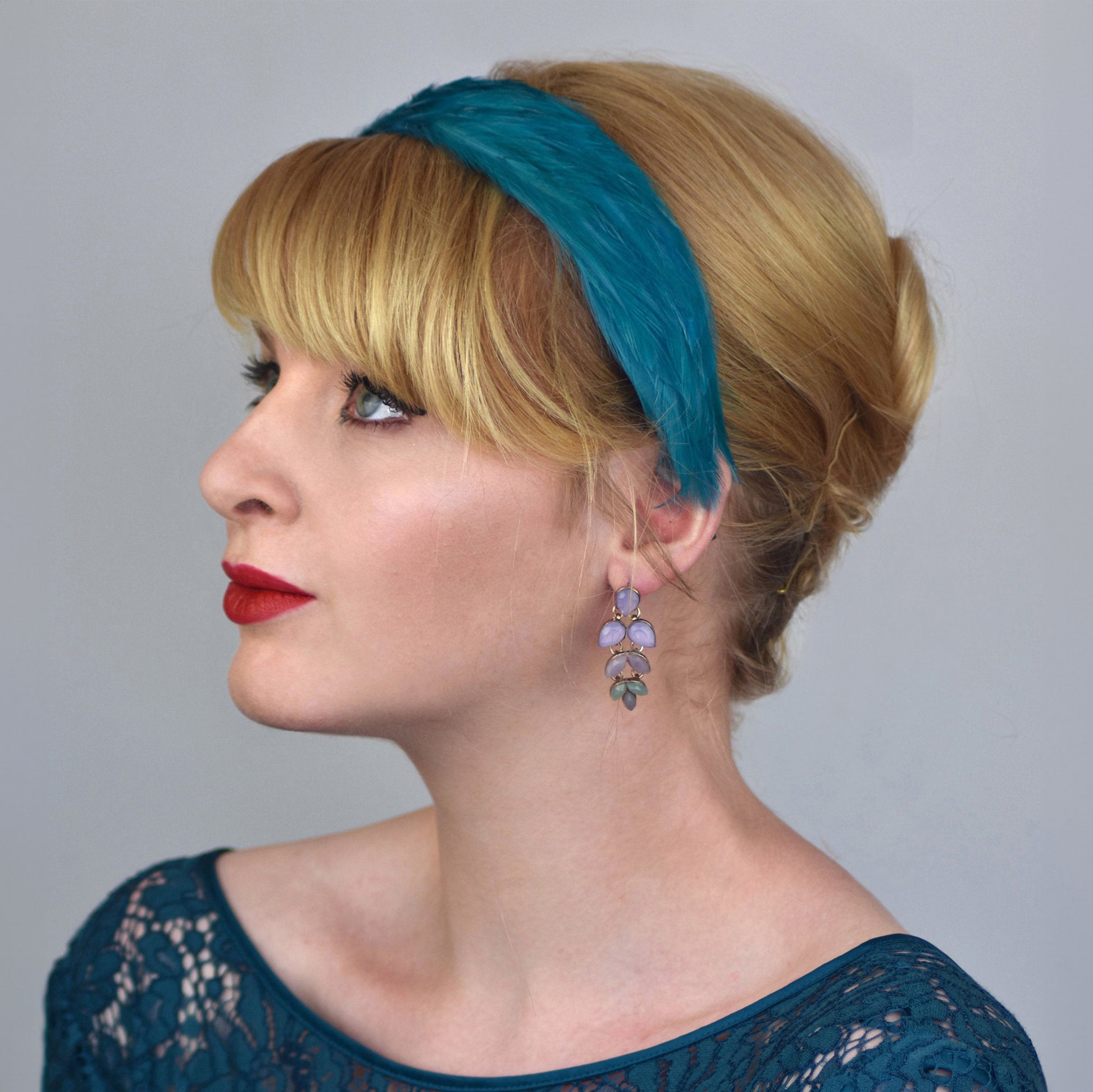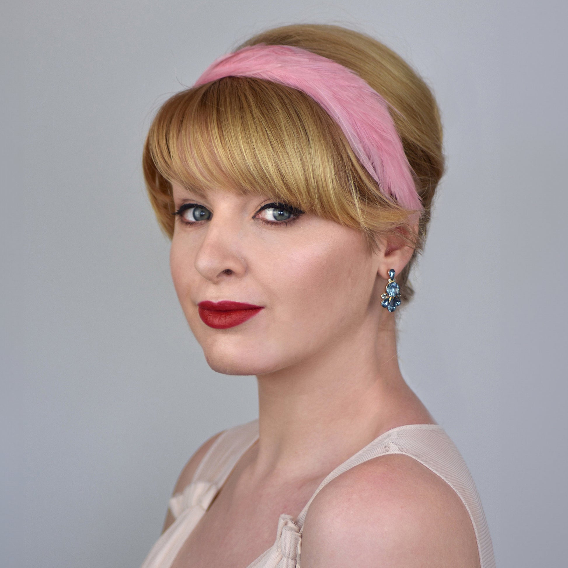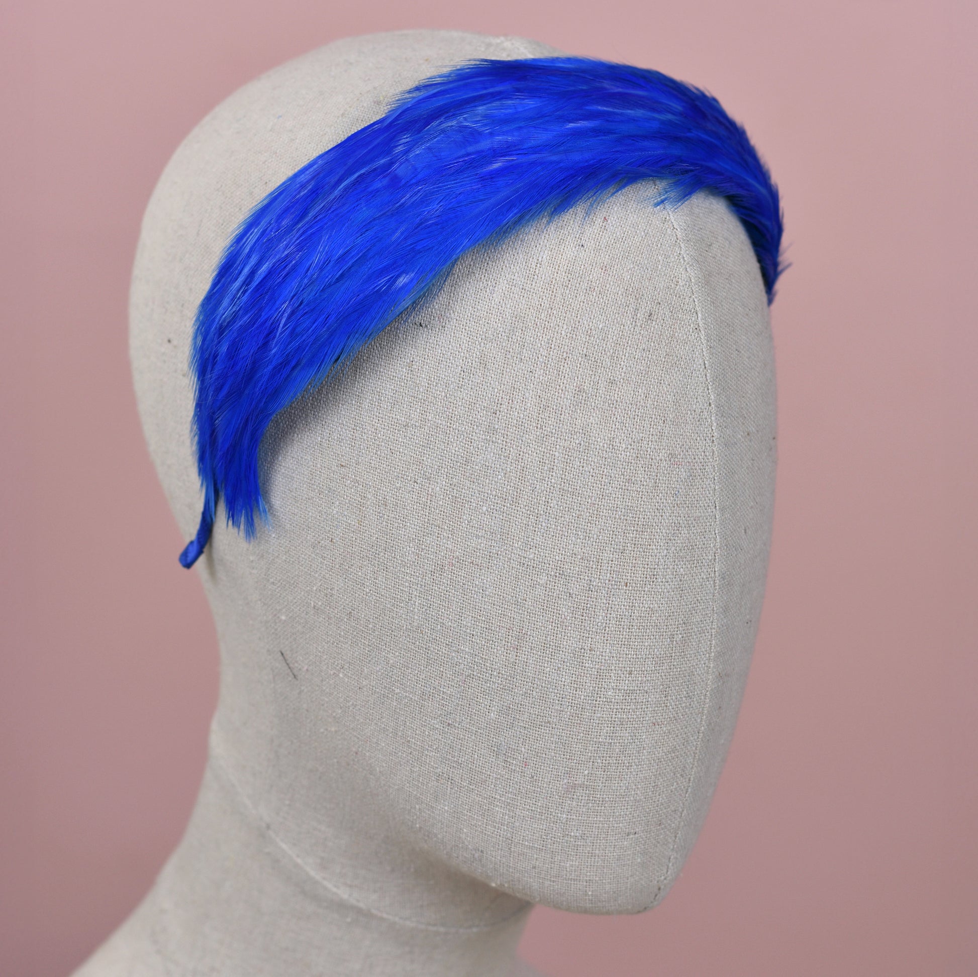 Elegant feather headband featuring hundreds of hand placed soft and sumptuous tiny rooster feathers wrapping across the crown of a narrow metal headband hand wrapped in matching satin ribbon.