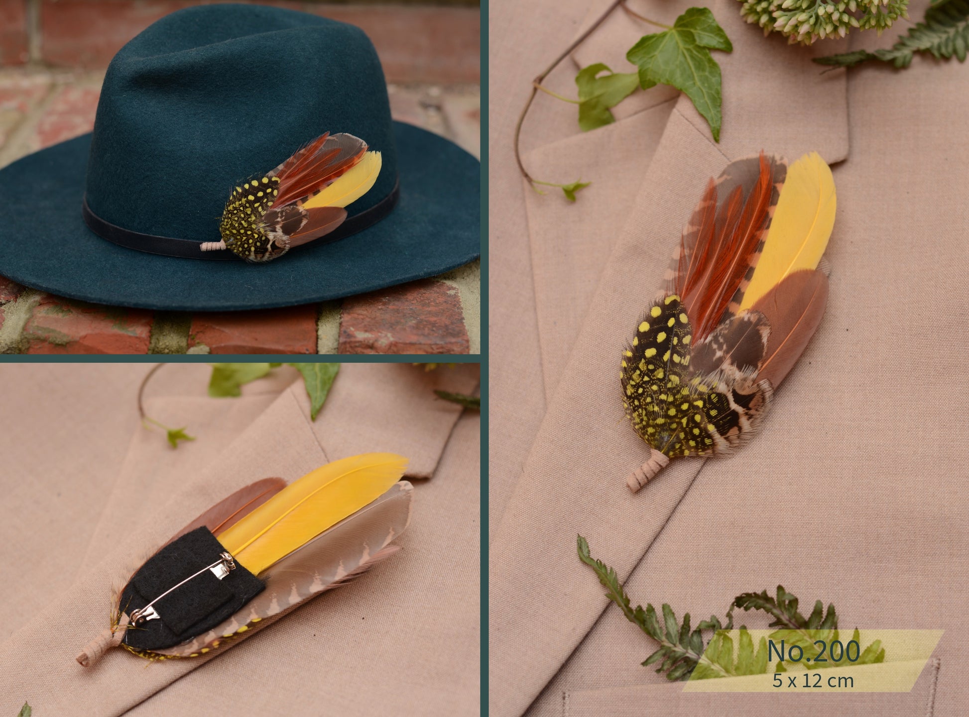 Feather lapel pin / feather hat pin featuring a variety of duck, rooster and guinea fowl feathers in shades of yellow, orange and rich browns, complemented by striking markings and textures. Perfect for fall and autumn events. Ideal feather boutonnieres for grooms and groomsman