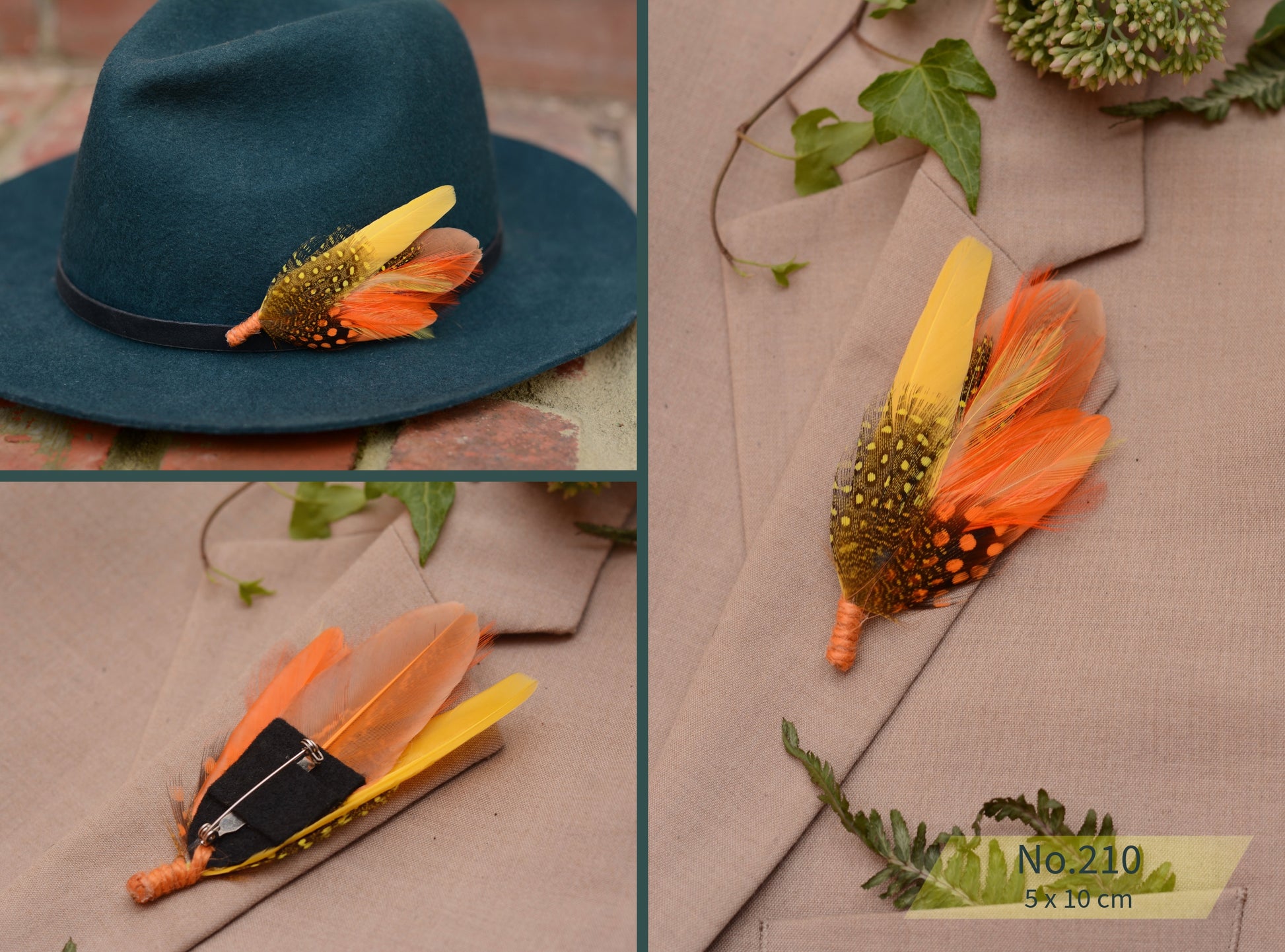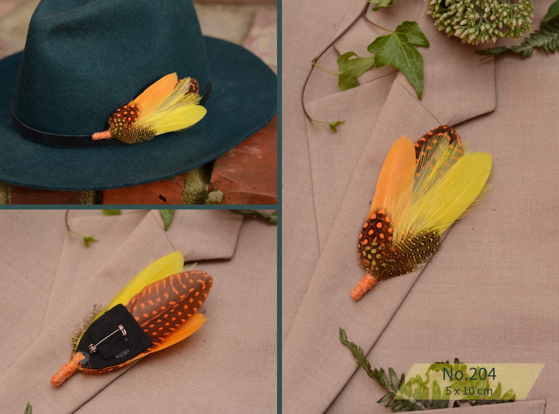 Feather Hat Pin / Broochs in Fall Colours Yellow and Burnt Orange