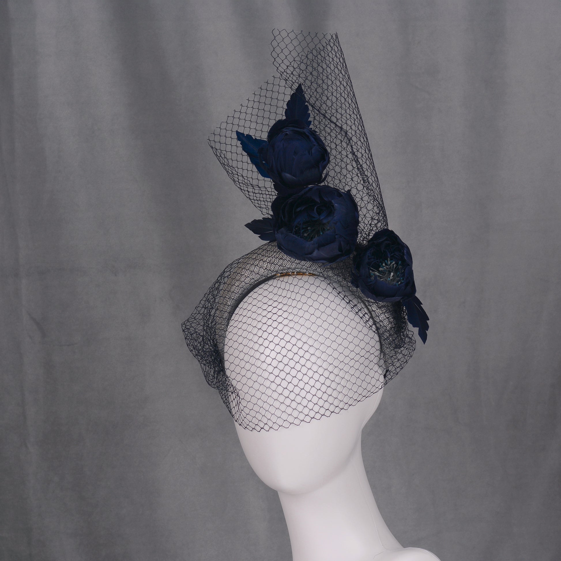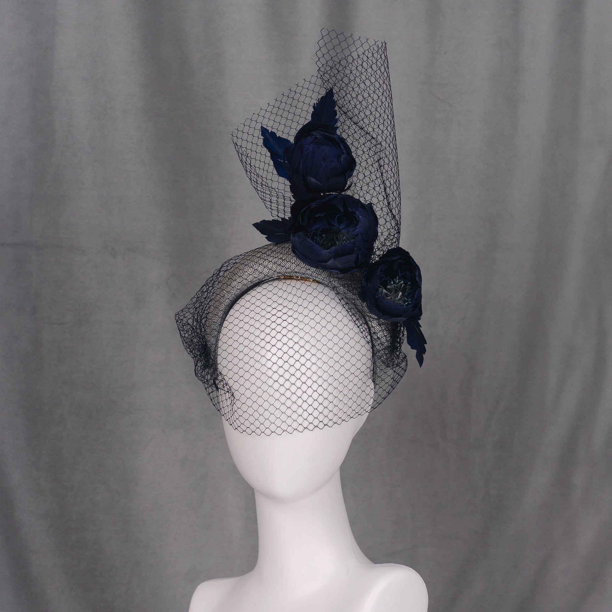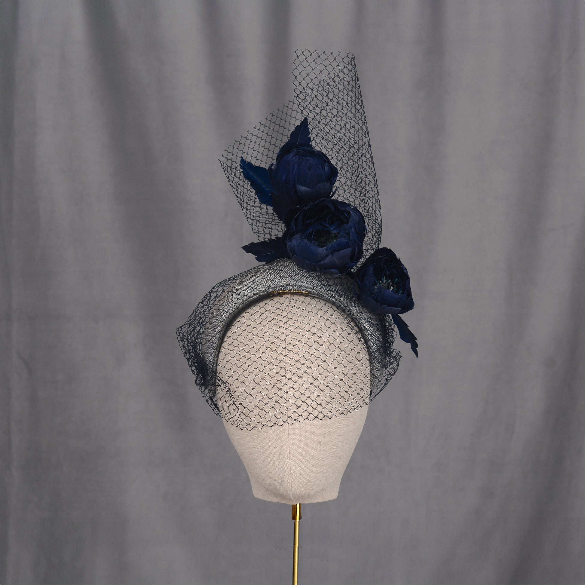A statement couture fascinator headpiece in a bandeau headband style. Featuring a hand-blocked, wired and stitched grey sinamay rounded bandeau base. Trimmed with a spray of hand-made goose feather peonies and leaves in shades of navy blue and a fine net veil fitted in a half-face style and extending up behind the flowers for height and drama!