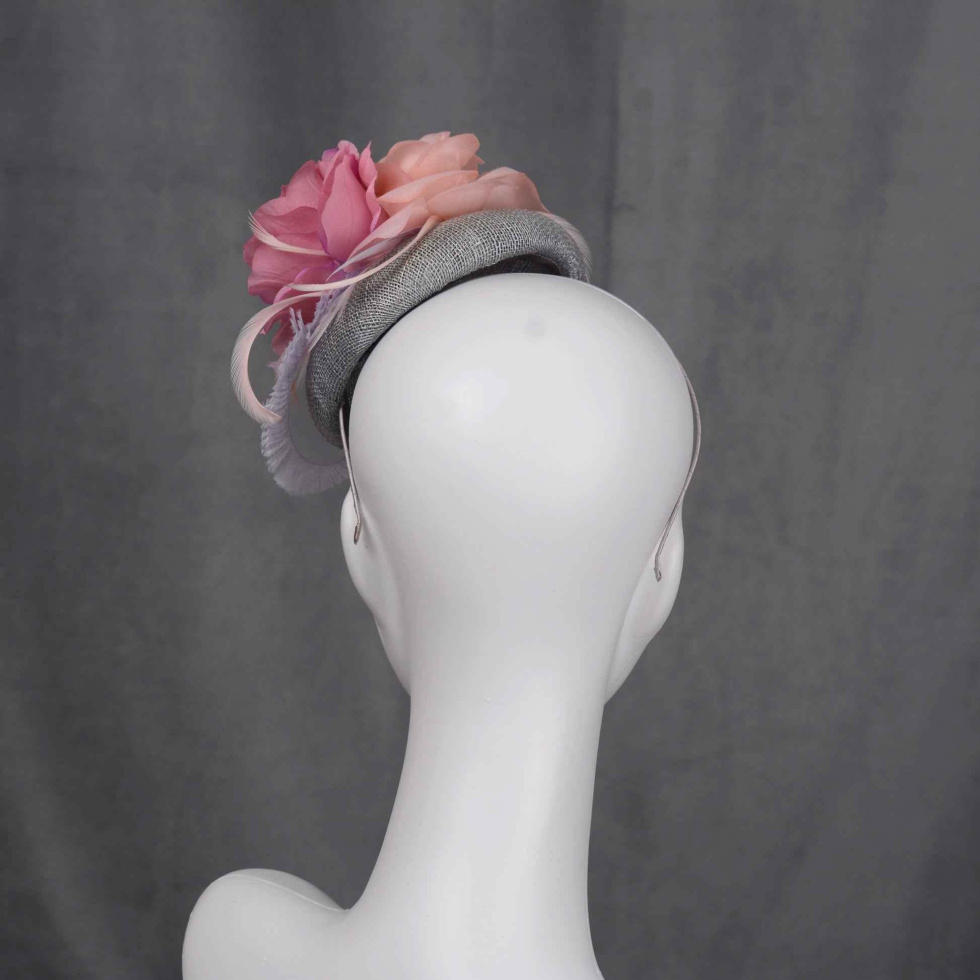 Grey and Pink Button Fascinator with Flowers and Feathers