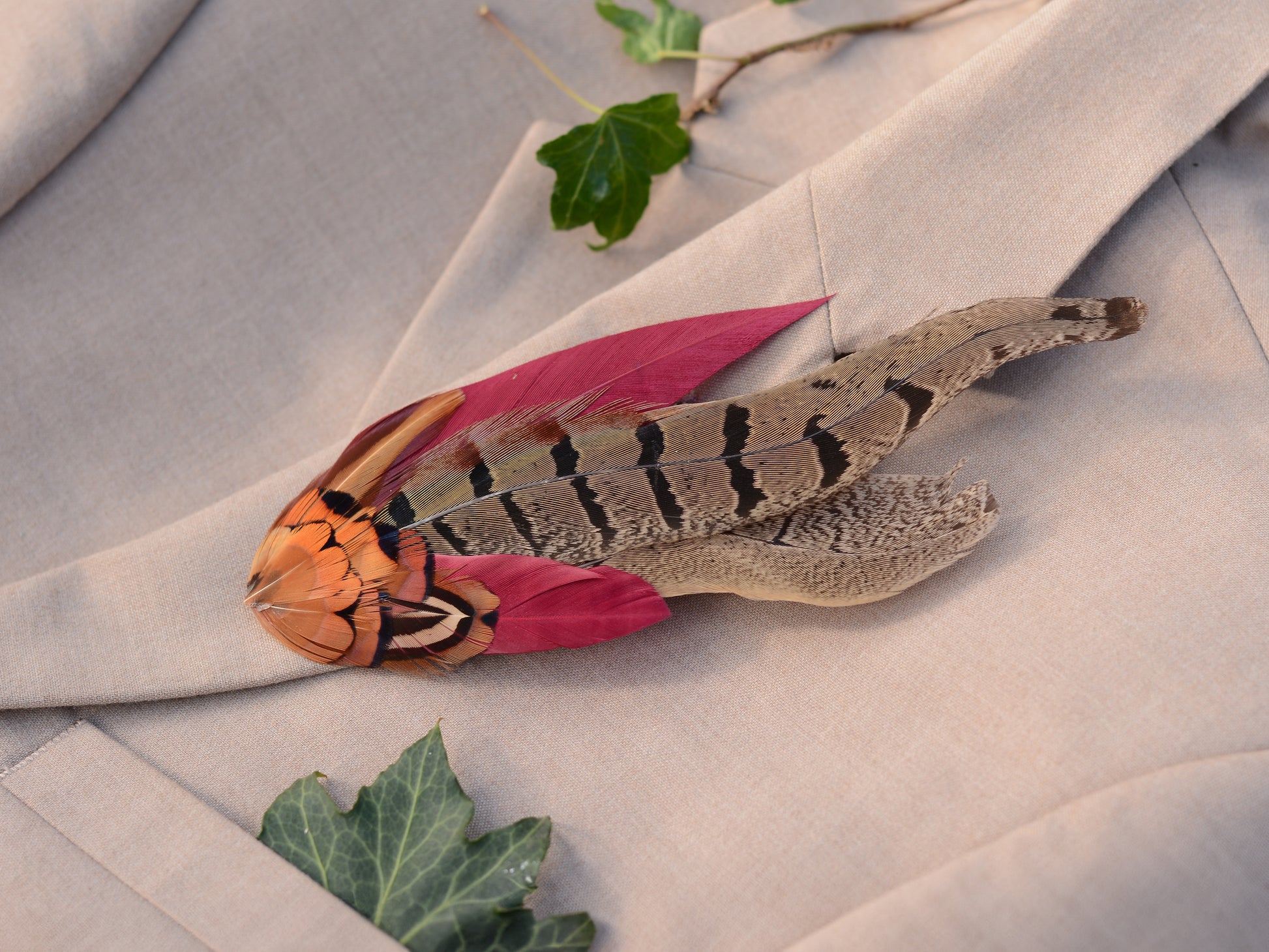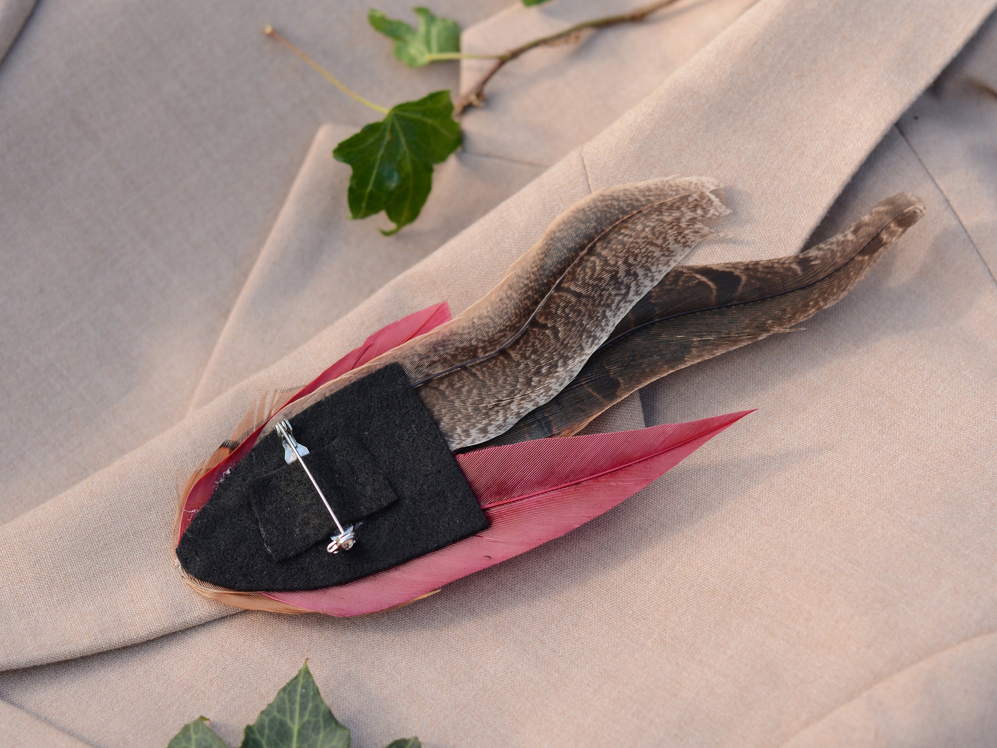 Large Copper Pheasant and Crimson Goose Feather Boutonniere / Hat Pin No.257