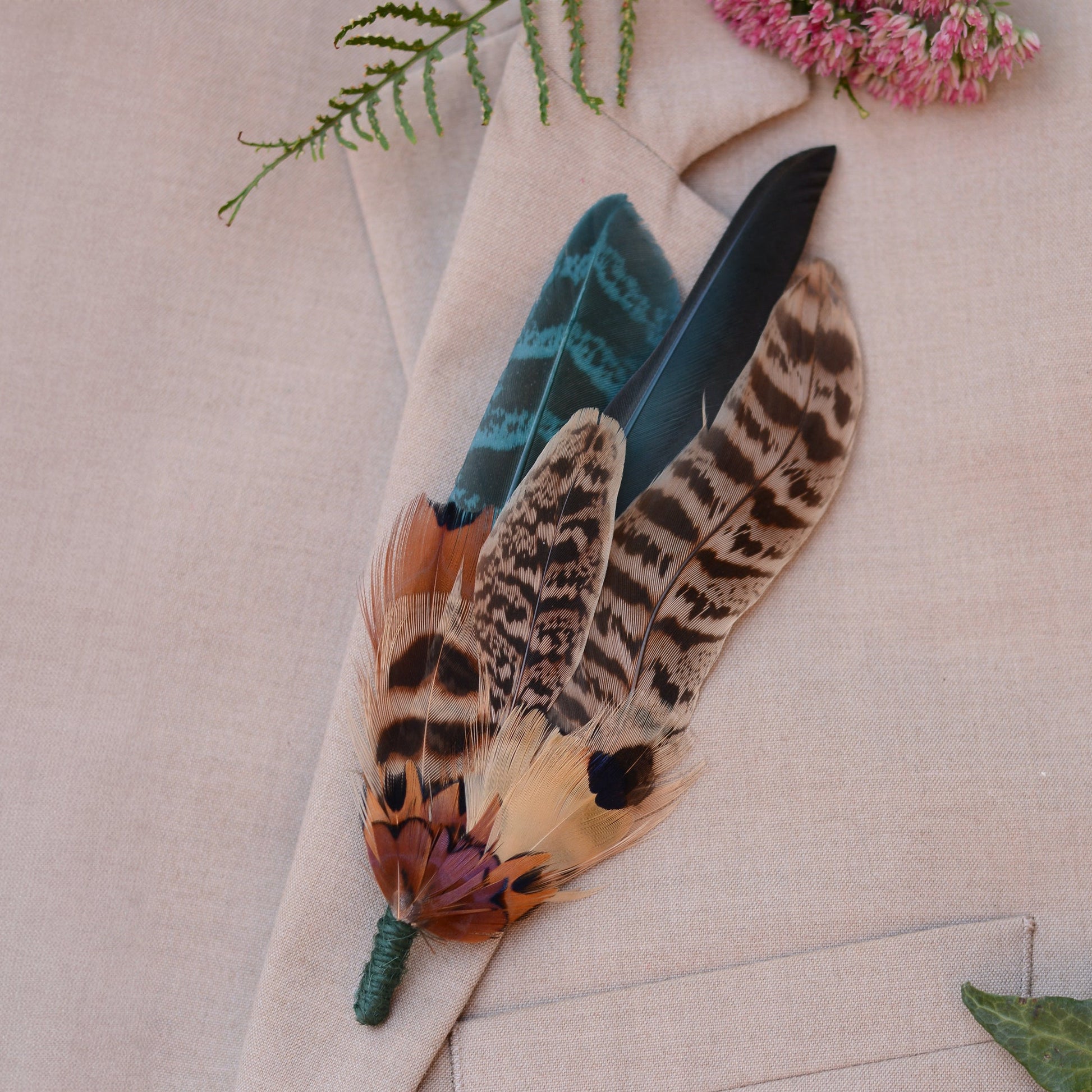 One of a kind feather lapel pin boutonniere featuring a mix of pheasant feathers in a stunning tonal mix of rich golds, browns, blondes, coppers paired with hand dyed wing feathers in teals and greens.