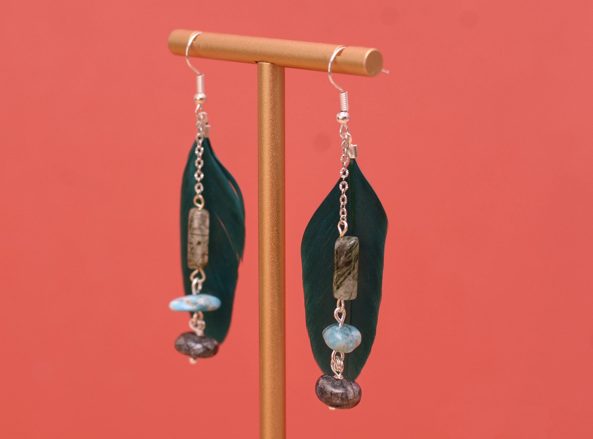 Teal Turquoise Drop Feather Earrings with Aquamarine Stone Chip Beads