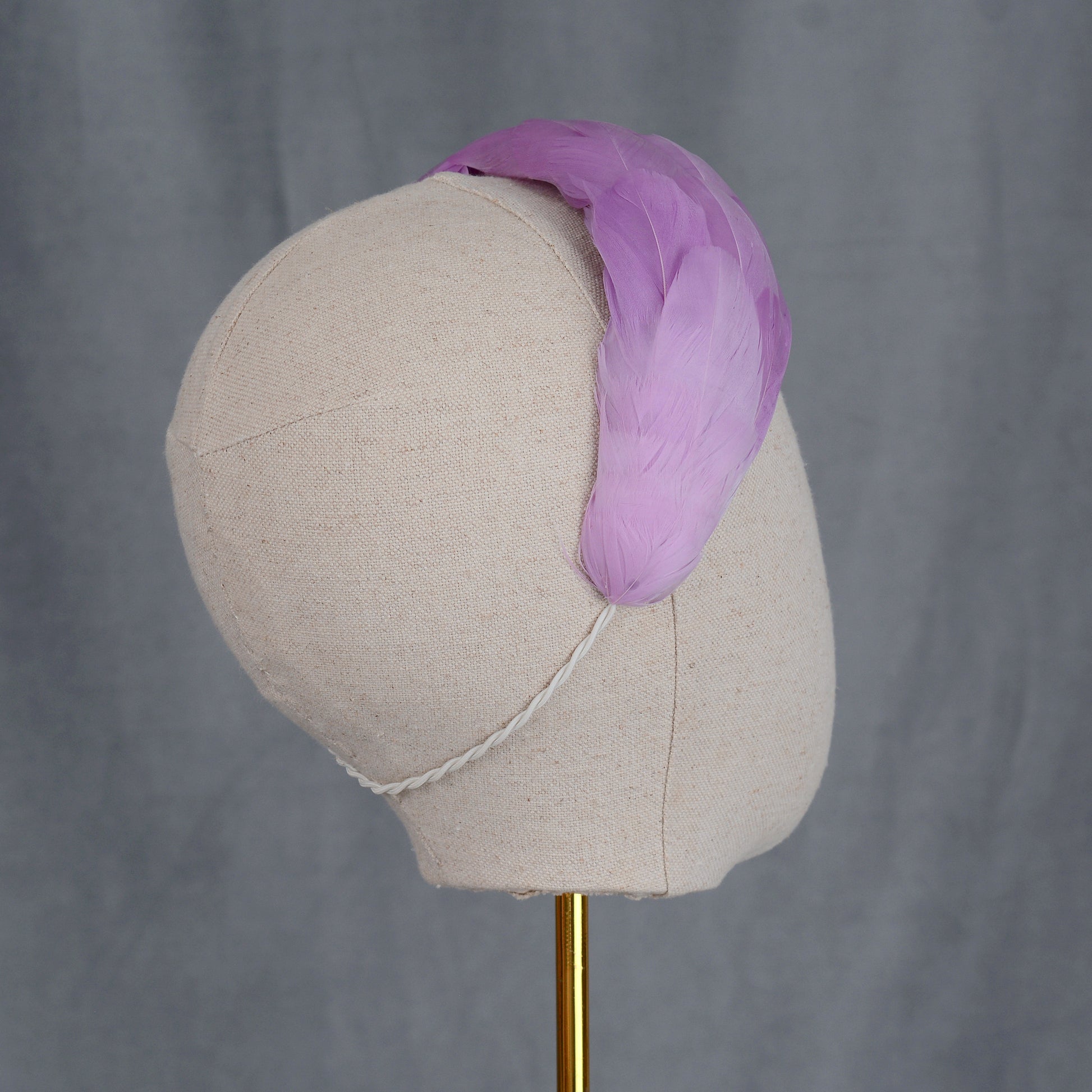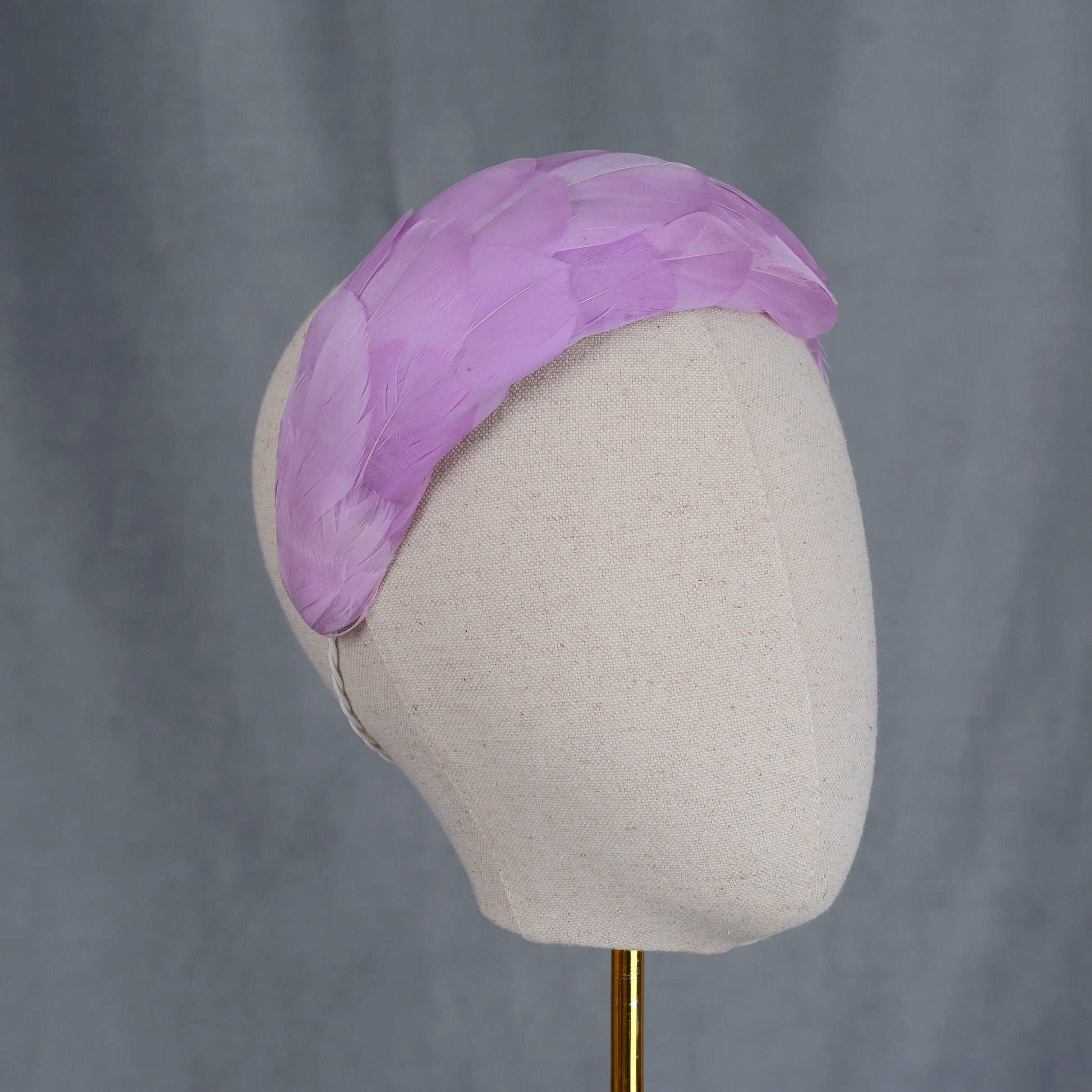 Elegant and classic couture feather fascinator bandeau headband featuring a hand-blocked and stitched 3d felt base covered with soft and sumptuous goose feathers in lilac purple. These feathers have been carefully selected for the softest and silkiest specimens with a beautiful shine.