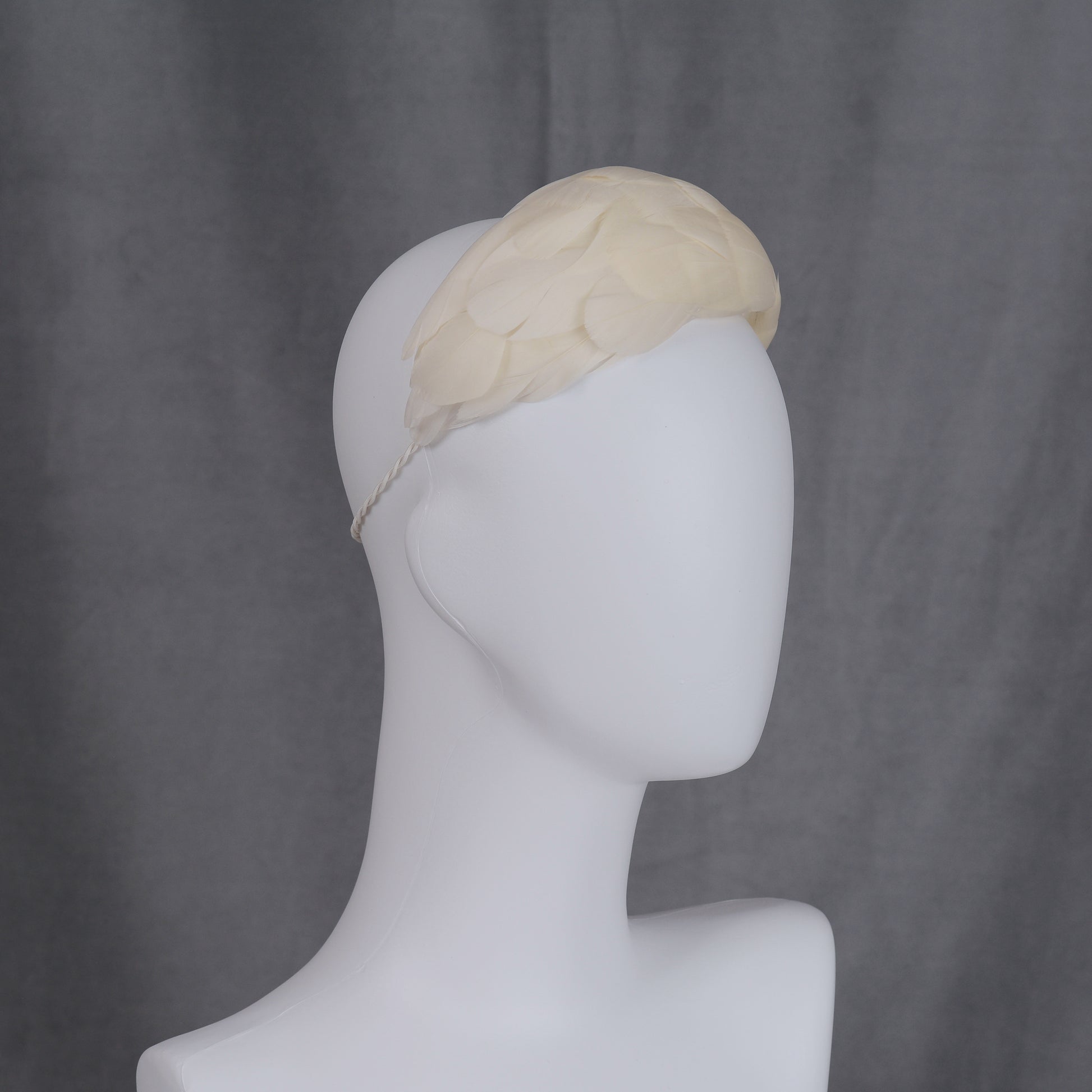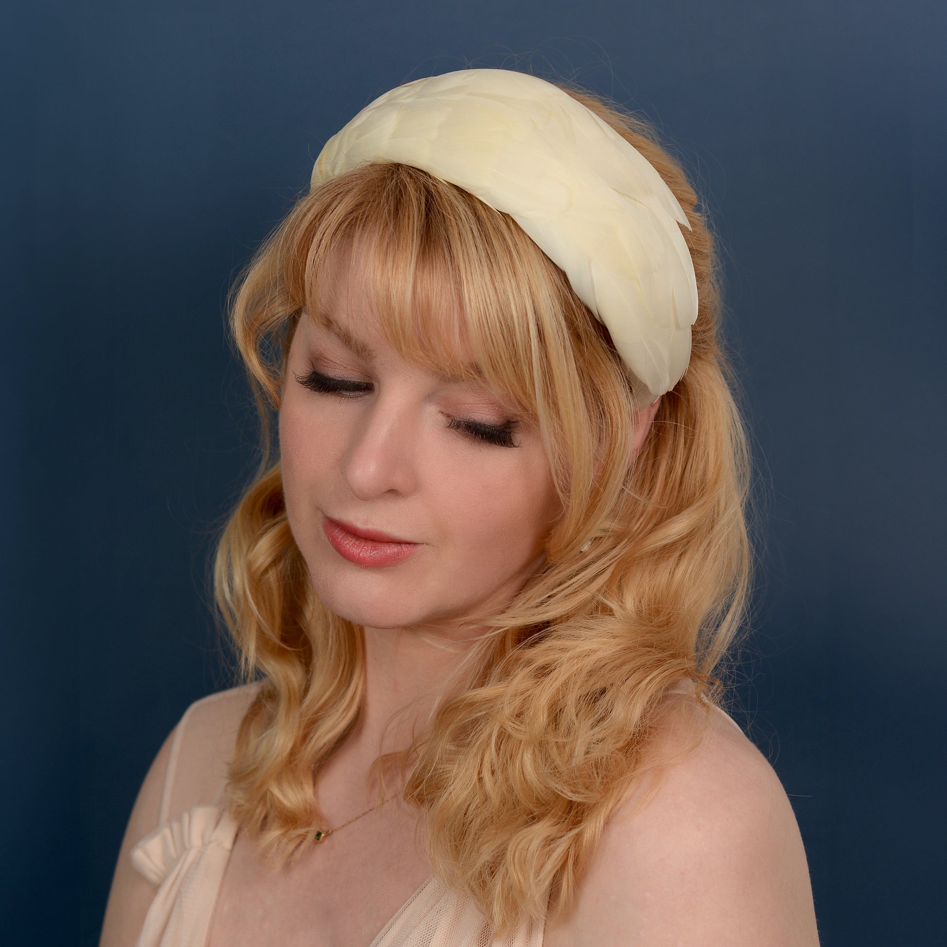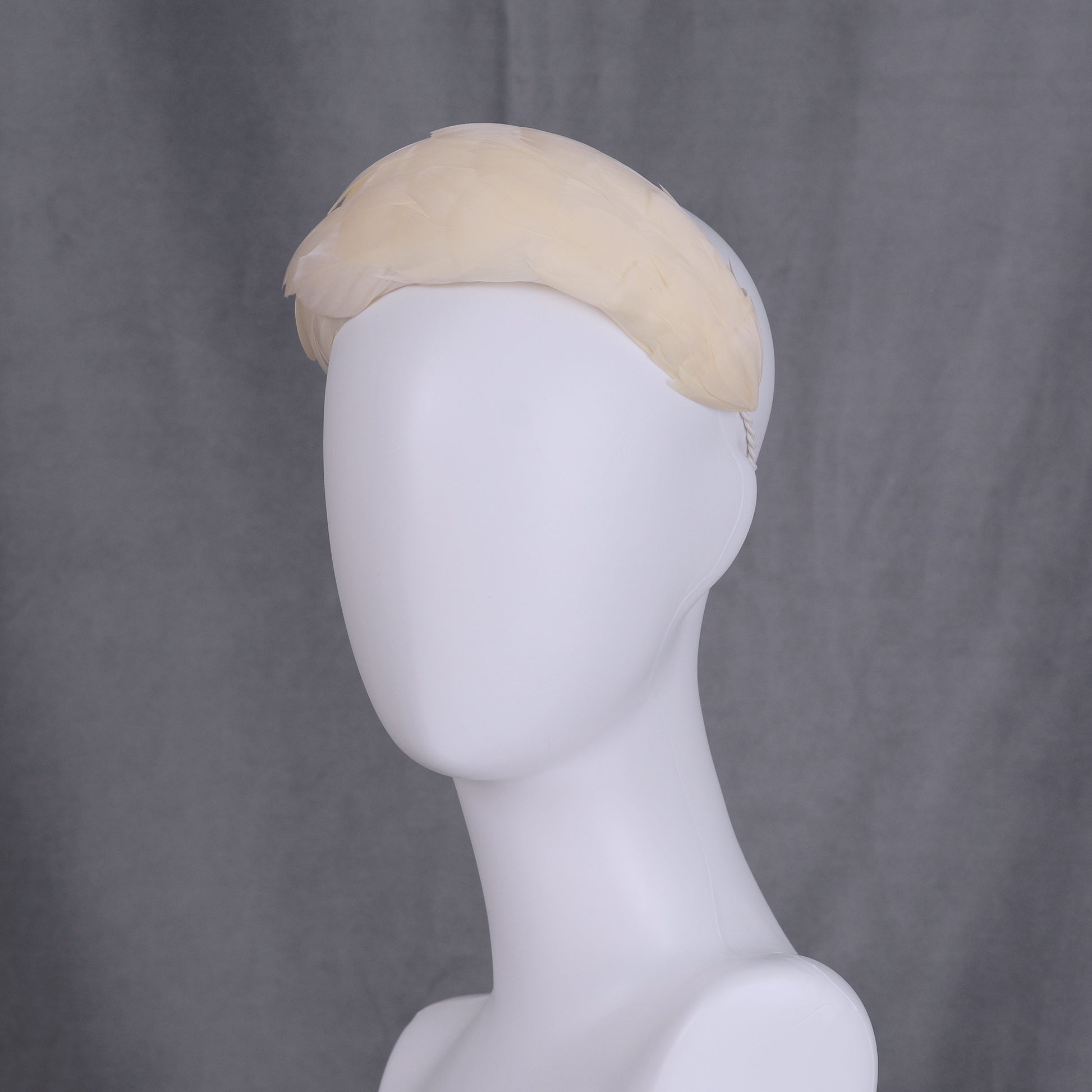 Elegant and classic couture feather fascinator bandeau headband featuring a hand-blocked and stitched 3d felt base covered with soft and sumptuous ivory goose feathers. These feathers have been carefully selected for the softest and silkiest specimens with a beautiful shine.