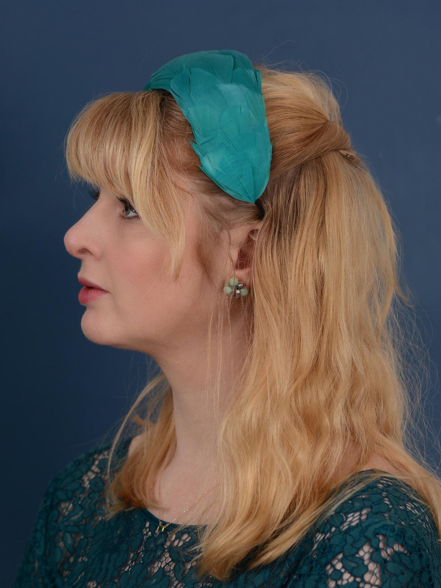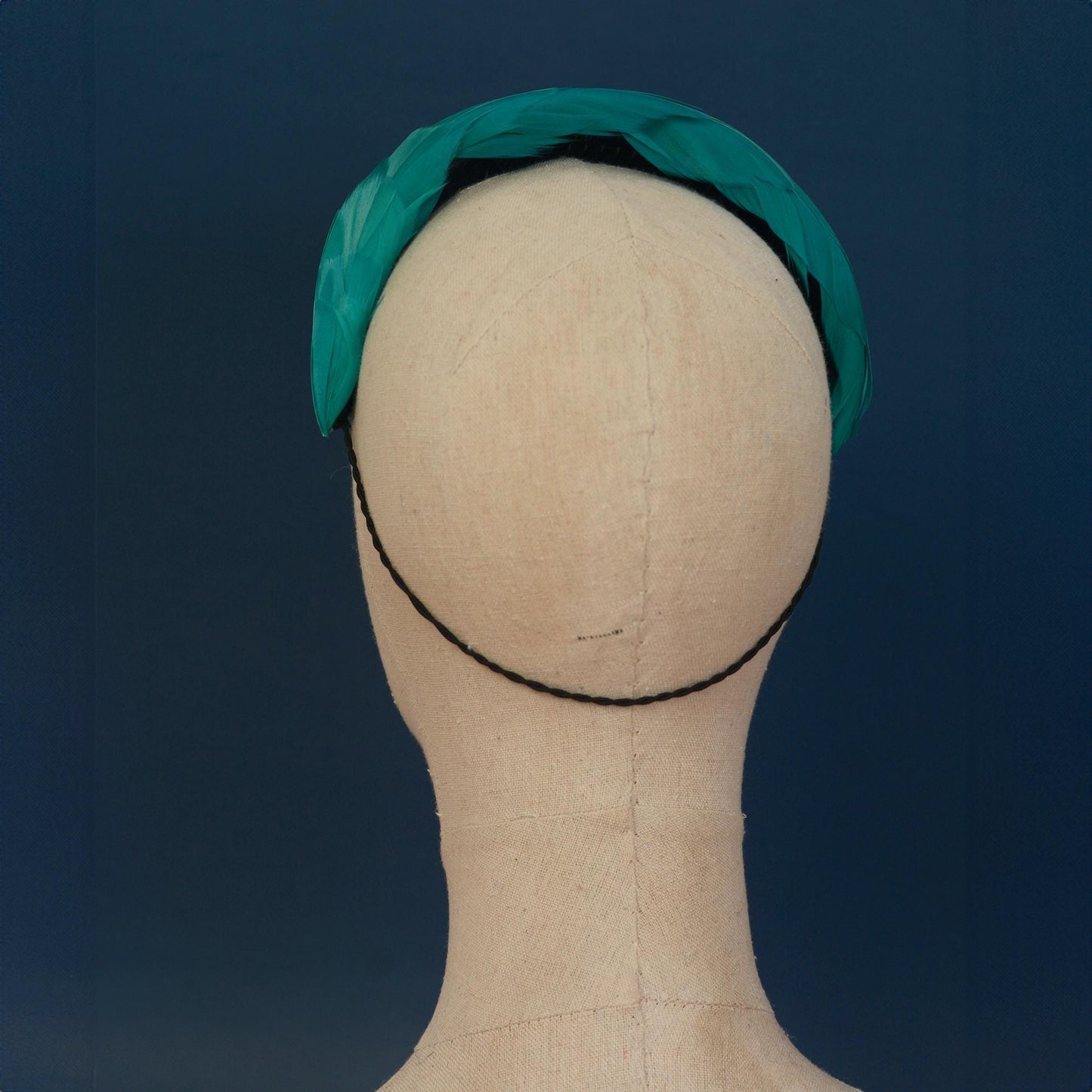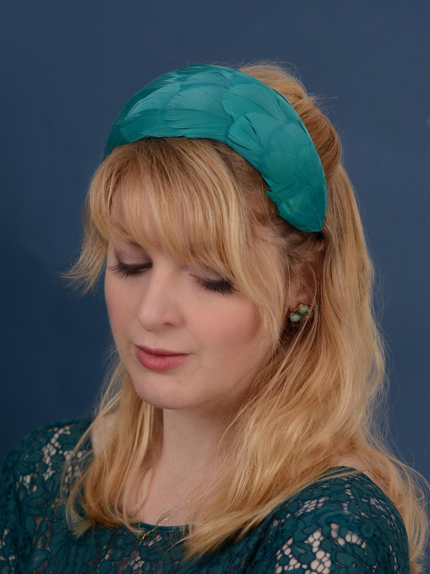 Elegant and classic couture feather fascinator bandeau headband featuring a hand-blocked and stitched 3d felt base covered with soft and sumptuous goose feathers in a rich teal. These feathers have been carefully selected for the softest and silkiest specimens with a beautiful shine.