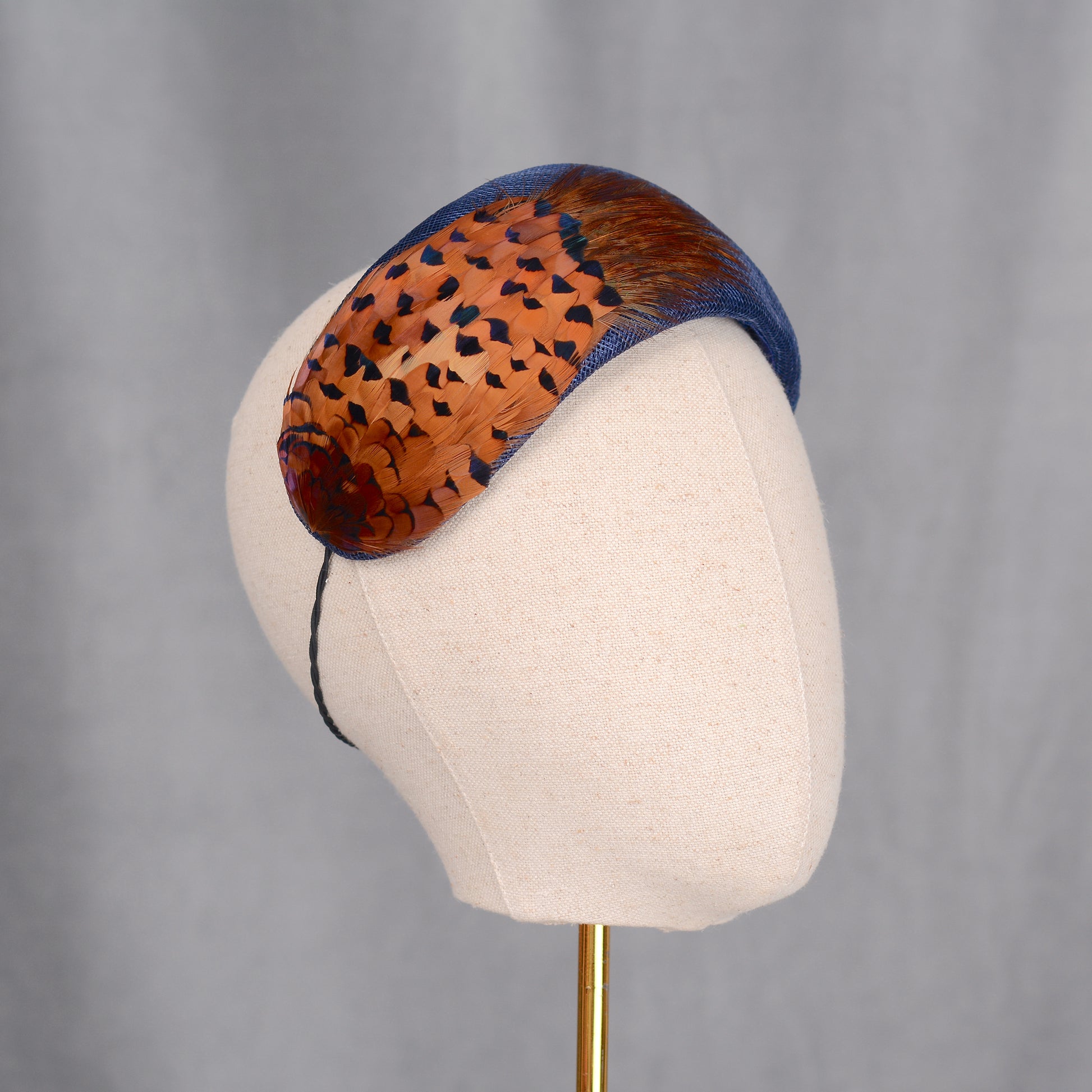 One of a kind elegant and classic feather fascinator bandeau style headband featuring an 8cm wide hand-blocked and wired navy blue sinamay base trimmed with a spray of stunning pheasant feathers in coppers, russet browns and deep black all with stunning natural colourations, varied markings and beautiful iridescence.