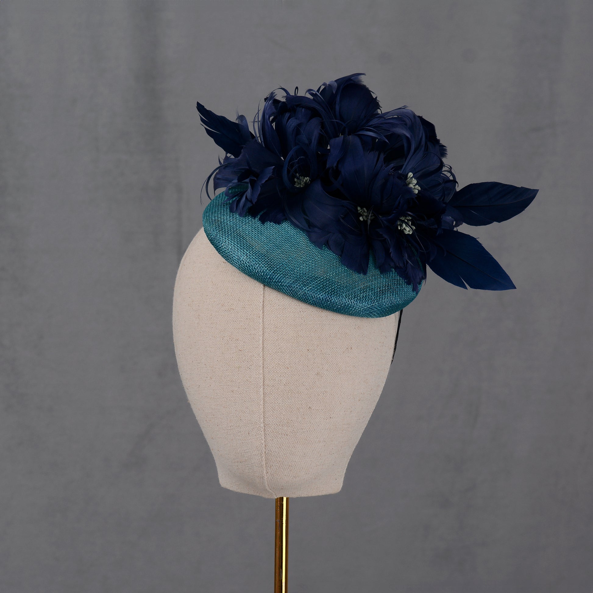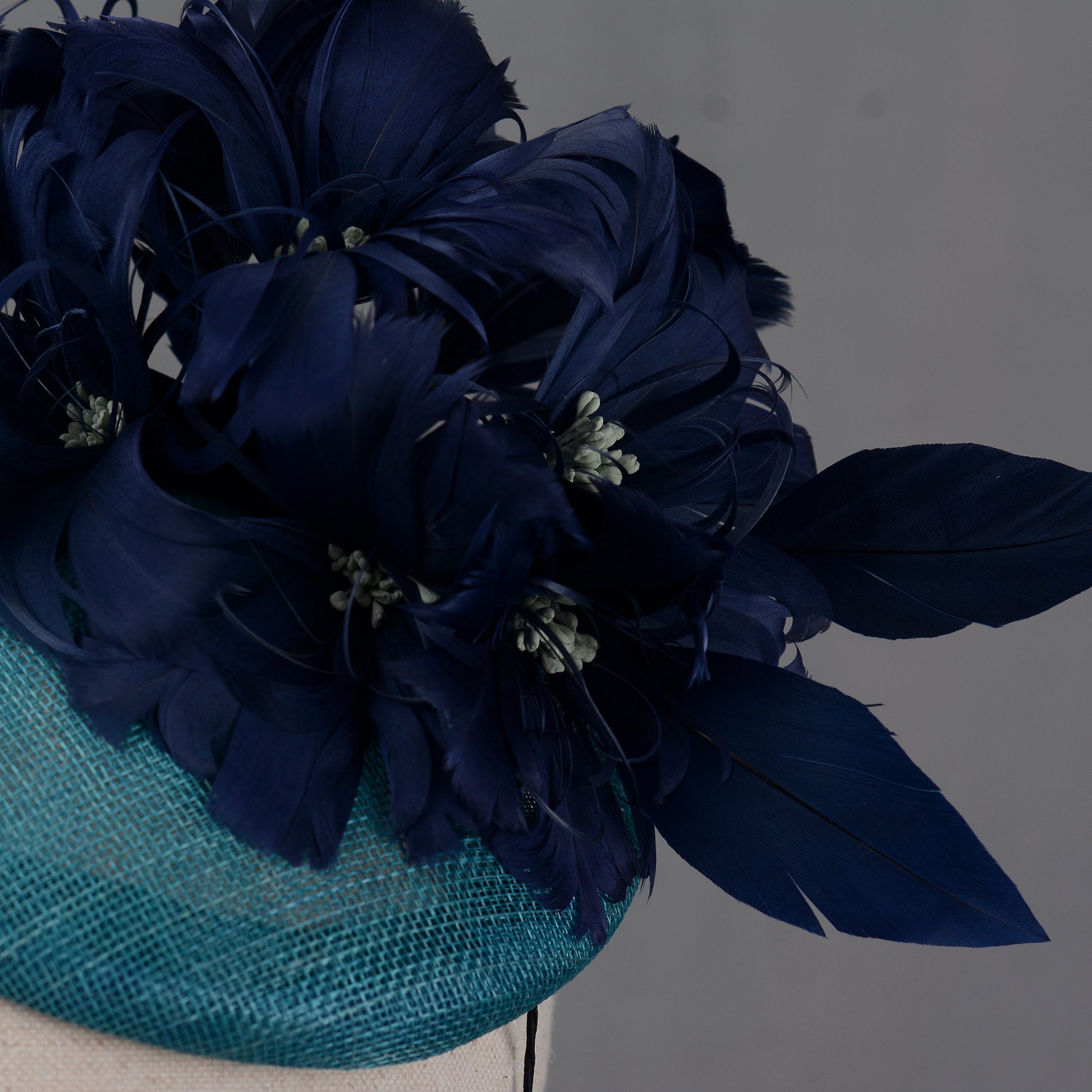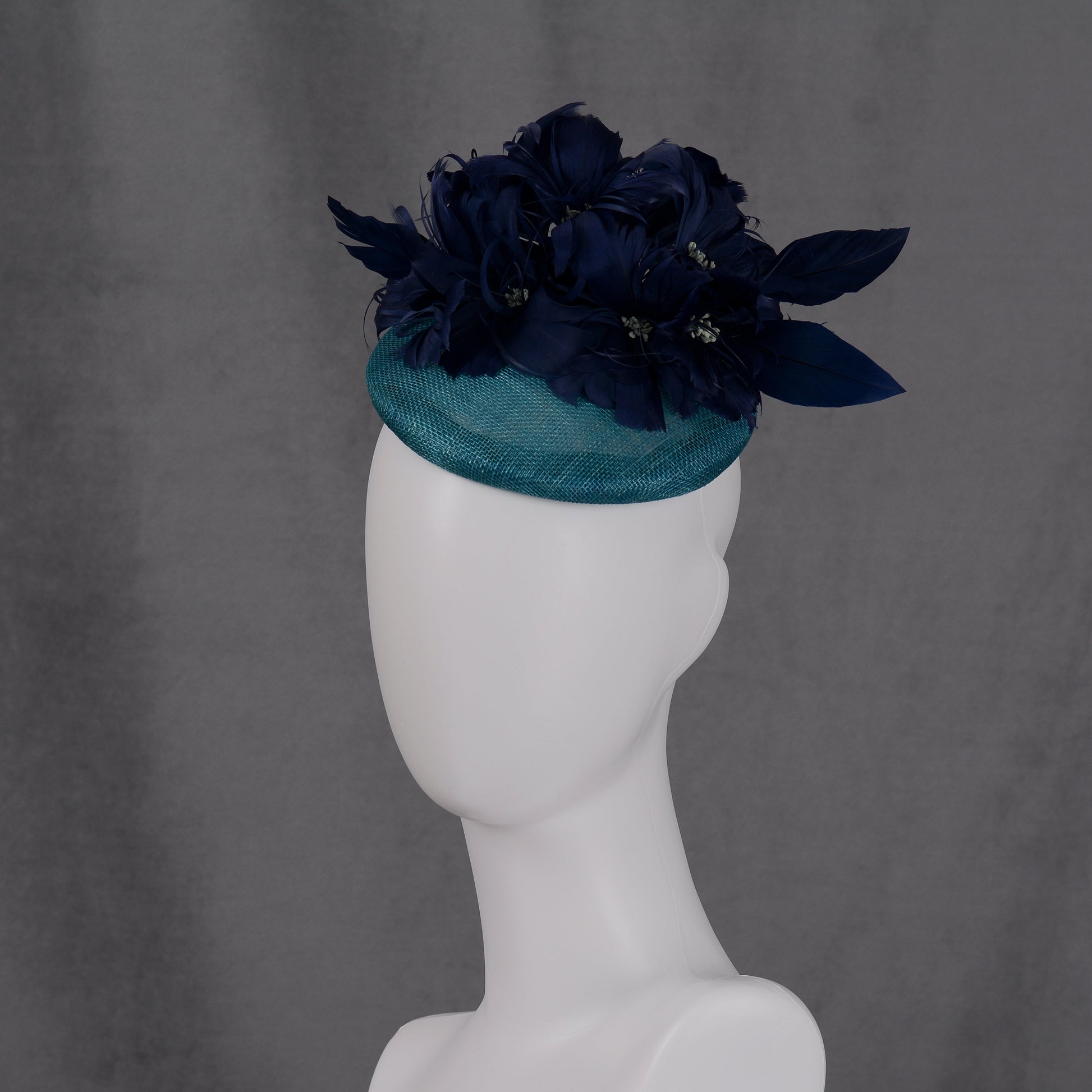 Ready-to-wear fascinator features a 16cm diamter teal sinamay button base trimmed with a generous spray of feather flowers crafted from hand-dyed goose feathers in shades of navy blue contrasted with grey blue stamens. Beautifully elegant line and interest from every angle.