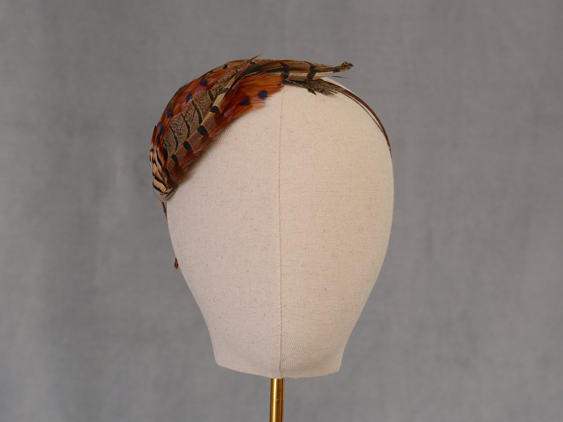 Beautiful pheasant feather headpiece featuring a side perching design crafted in stunning pheasant feathers in copper and rich browns. This is a one off piece showcasing carefully selected and paired feathers with unique markings, colouration and textures that catch the light beautifully.