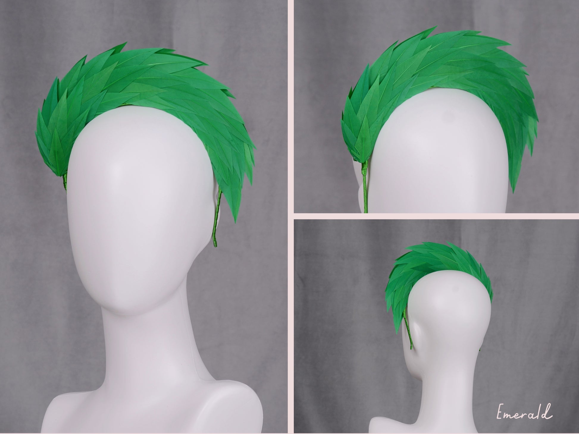 Mounted to the side of a narrow metal headband hand wrapped in colour matching satin ribbon.