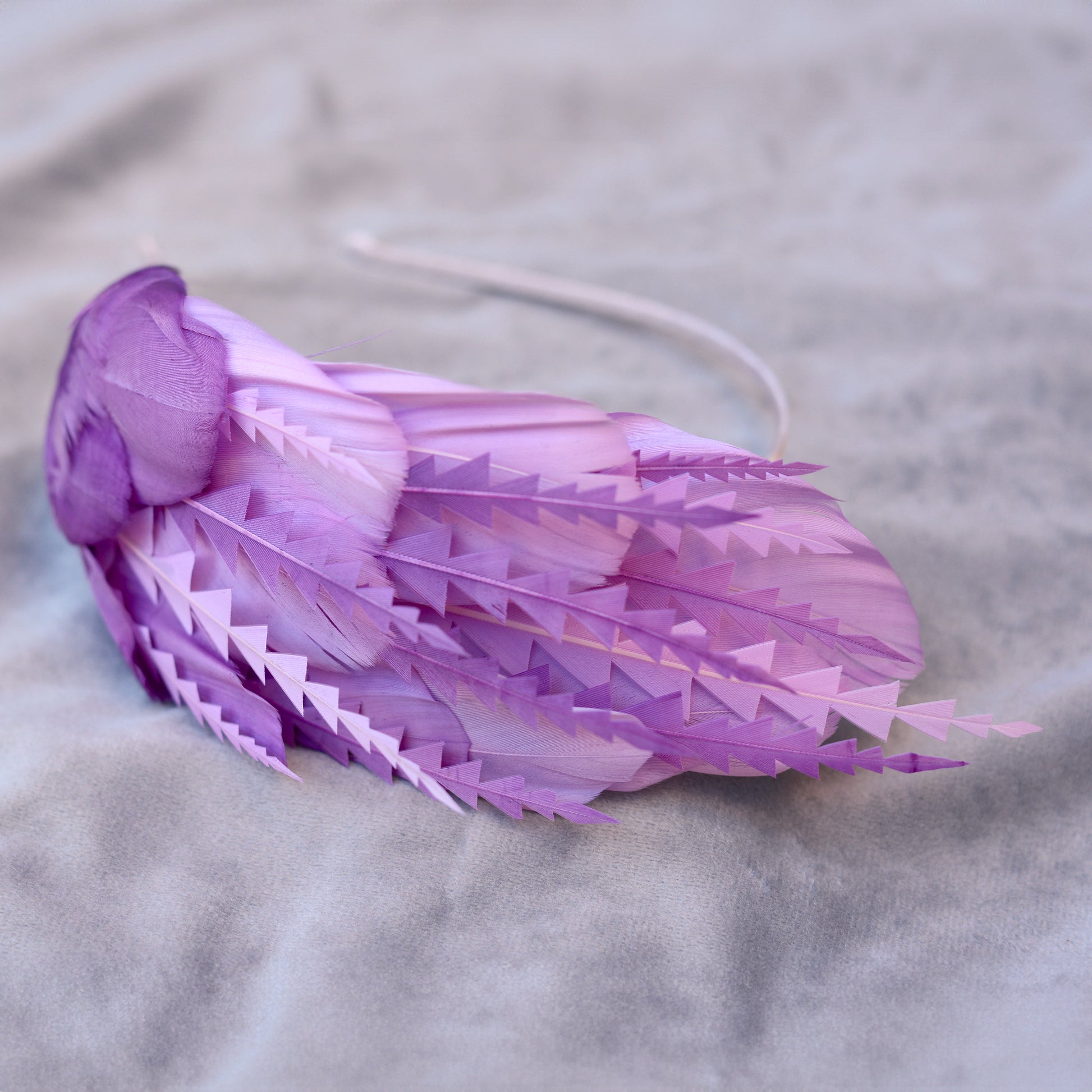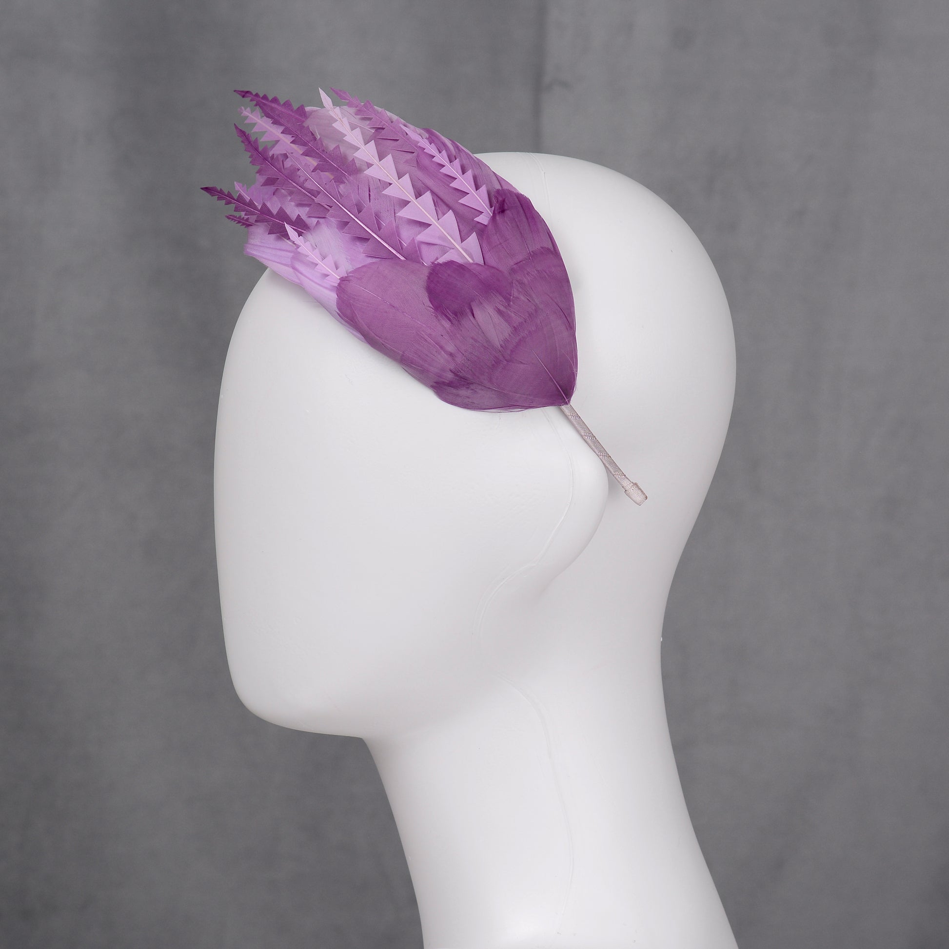 This beautiful feather headpiece features a side-perching design crafted in soft and sumptuous goose feathers in ombre lavender and mauve purple. Carefully selected high-quality goose feathers have been hand dyed before being hand curled, cut and shaped to add intricate texture, delicate floating details, and contrast.
