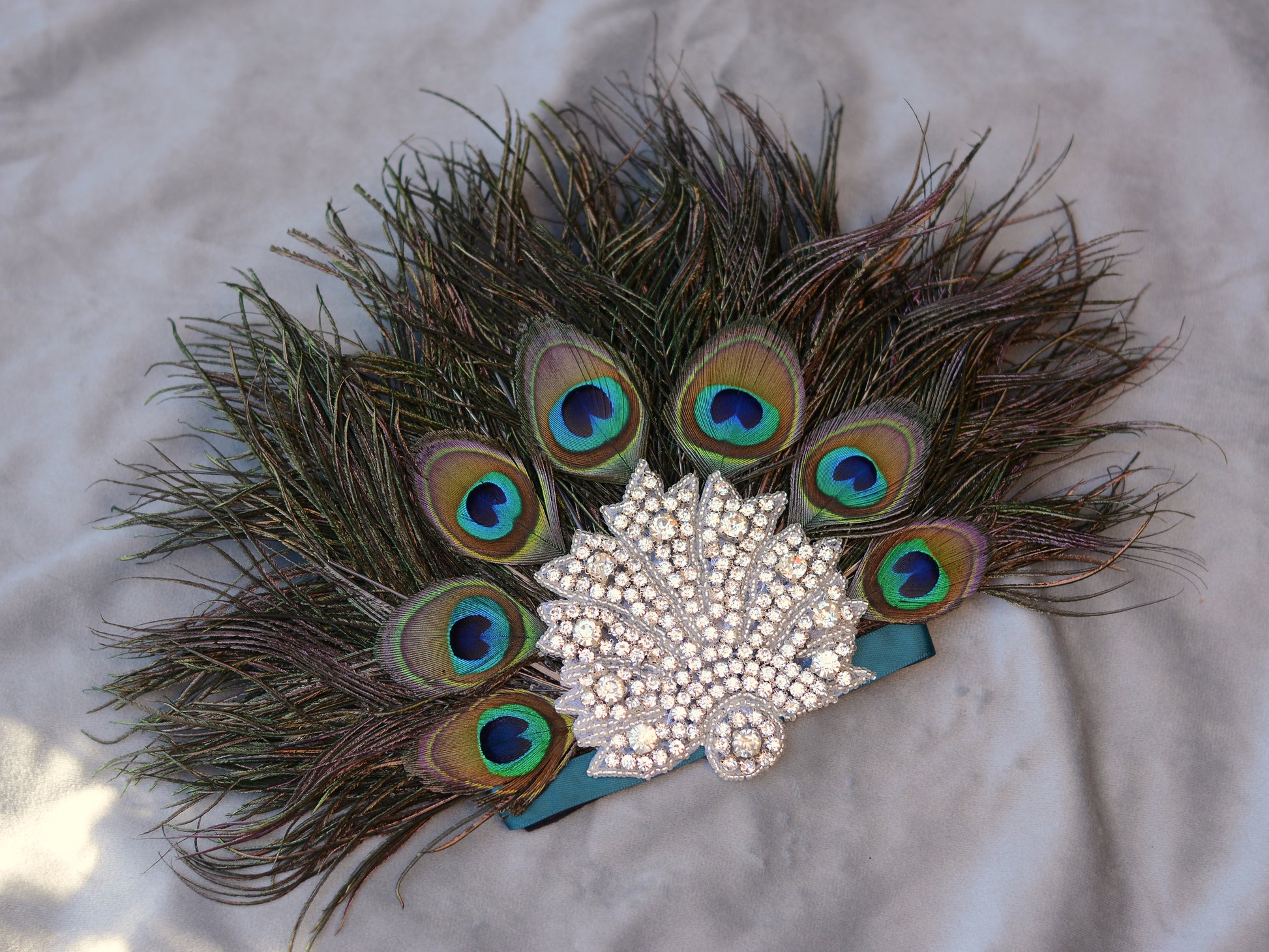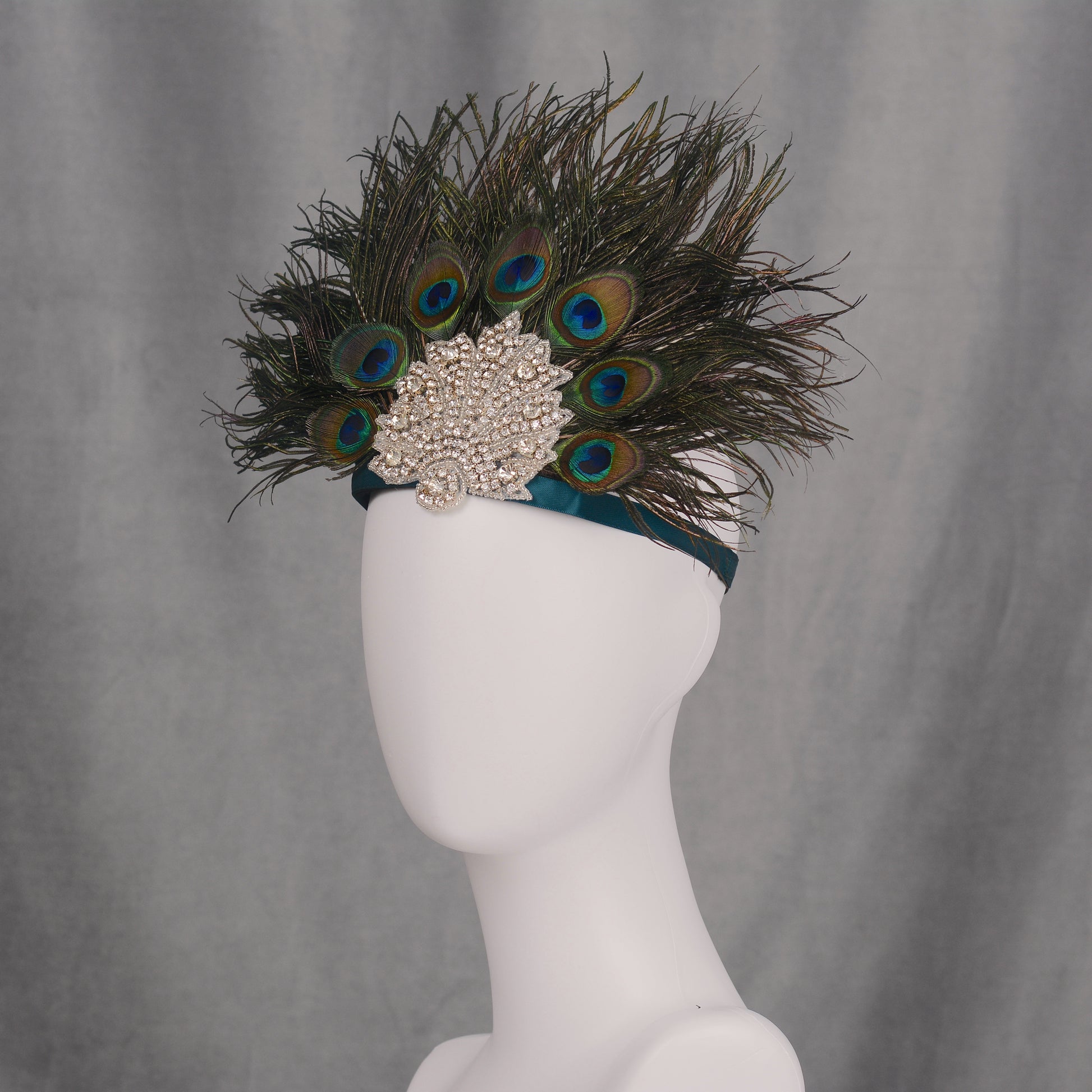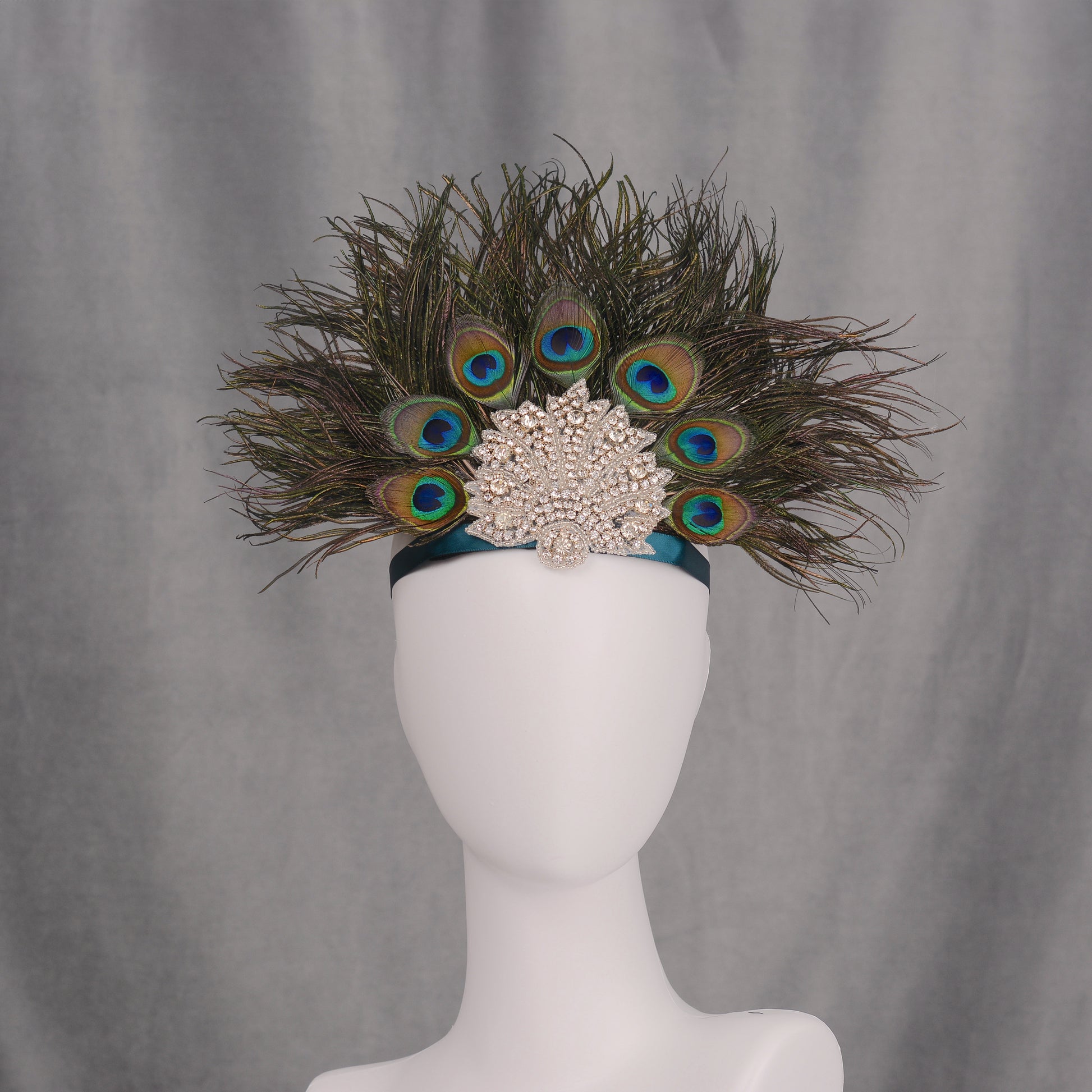 A bold and beautiful feather headpiece with an art deco flapper vibe perfect for 1920s Great Gatsby themed parties, masquerade balls, festivals or a bohemian bridal look.