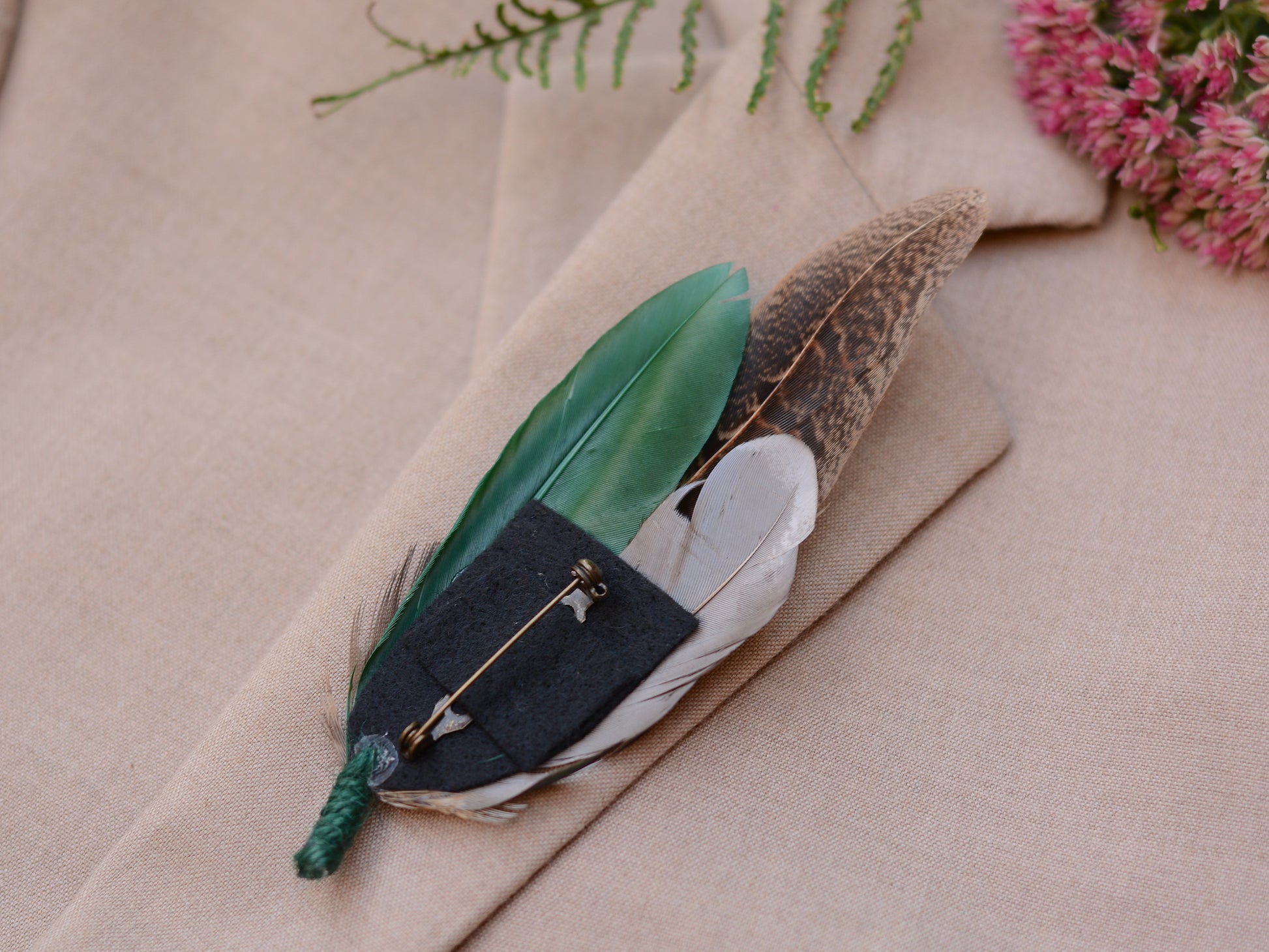 This one-of-a-kind feather lapel pin / feather hat pin blends pheasant and duck feathers in a rich harmony of greens, browns, and monochrome tones. Each piece showcases a natural tapestry of markings, iridescence, and textures, tied together with green twine at the base. Measuring around 4.5 x 12cm, it’s perfect for adorning jackets, coats, or hats. A wonderfful choice for a grooms boutonniere that can be kept as memento long after your wedding day.