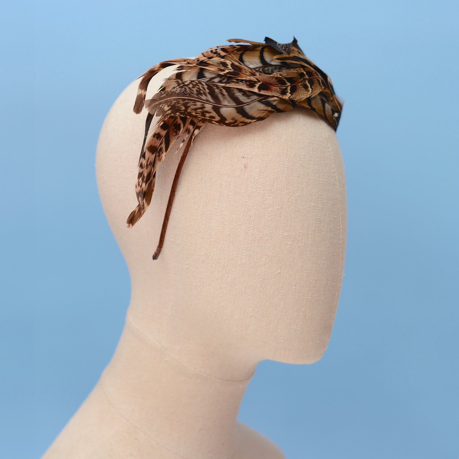 Mounted on a narrow metal headband hand wrapped brown satin ribbon to compliment the feathers.