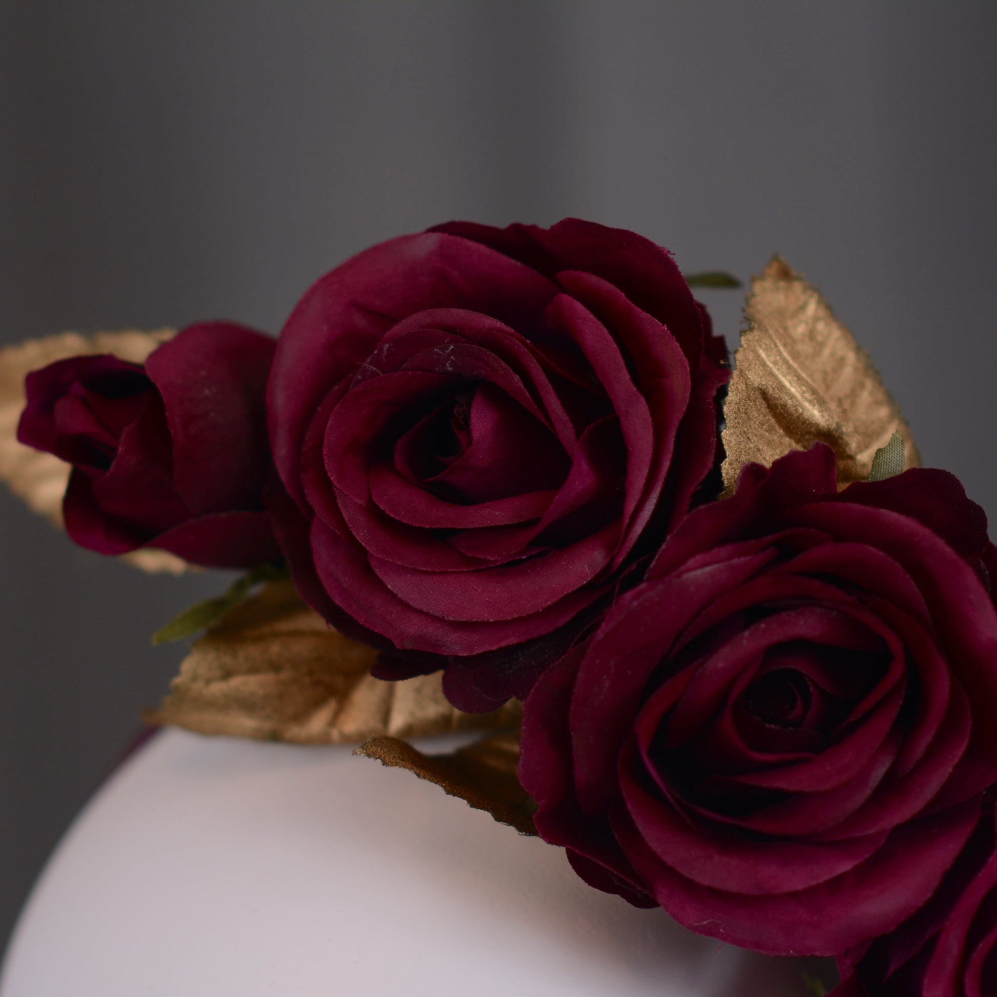 Bold and sculptural one of a kind floral headpiece. Featuring realistic rose buds and blooms in rich shades of plum purple arranged in a side perching style and framed with antique gold leaves. Lightweight and easy to wear.