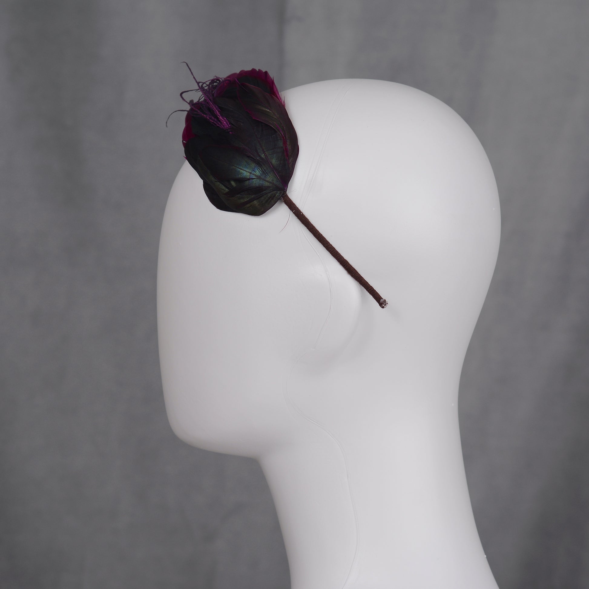 Mounted on a narrow metal headband hand wrapped plum satin ribbon to compliment the feathers.