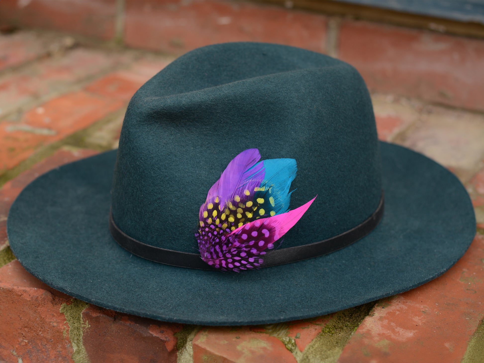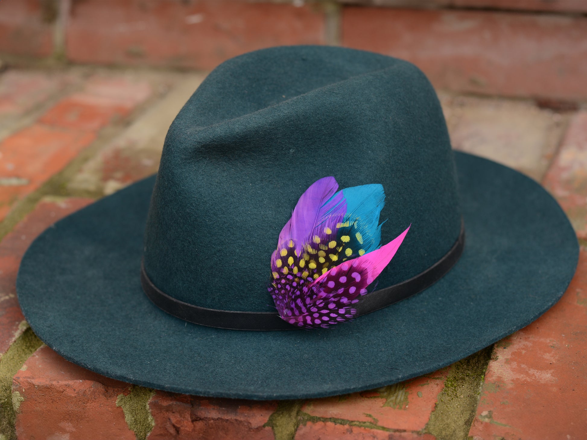 One of a kind feather hat pin / lapel pin boutonniere featuring vibrantly dyed feathers in shades of purple, pin, turquoise blue and yellow with striking spotted markings in deep blacks.