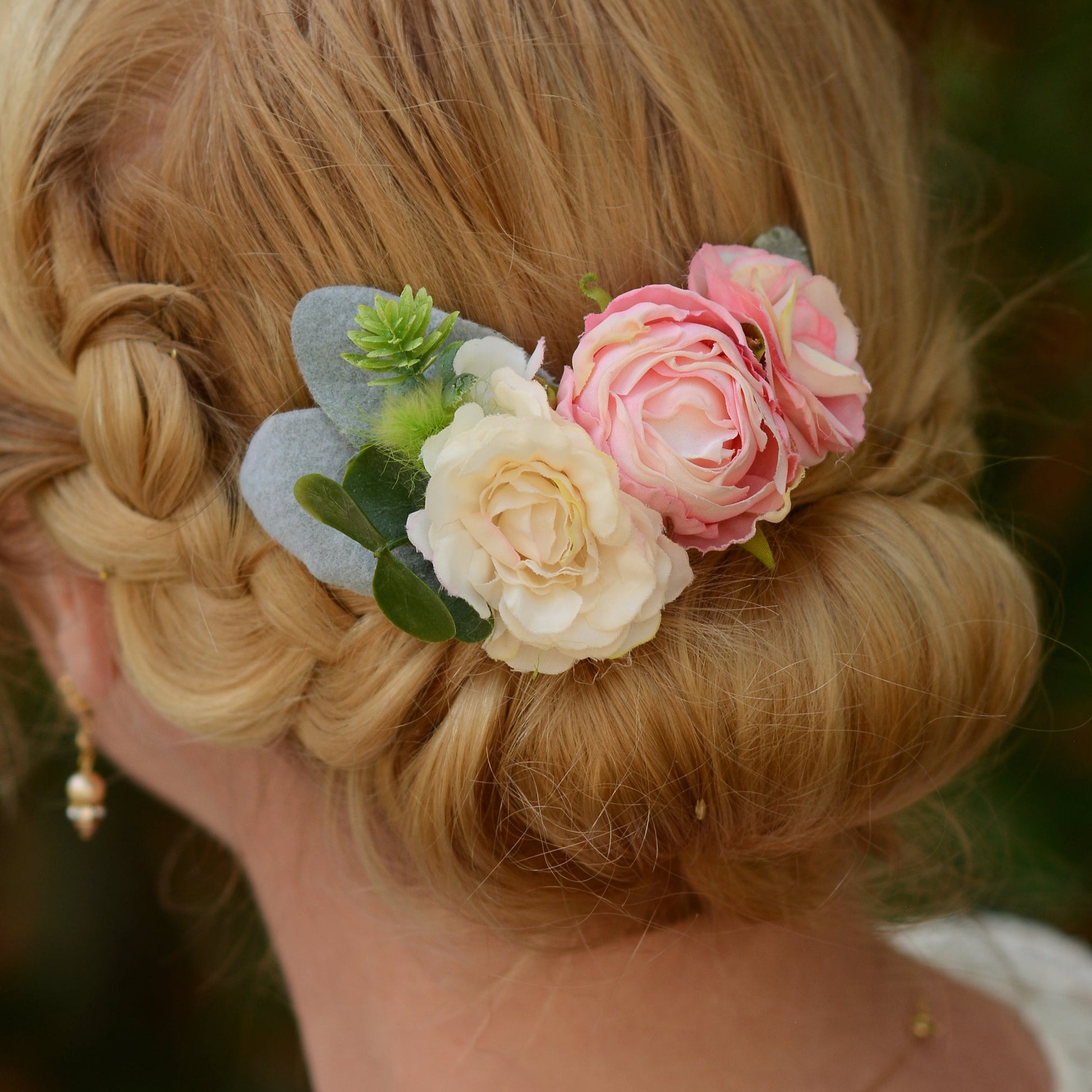Realistic flower hair clip featuring a trio of blooms in ivory and blush pink including roses and ranunculus with sprays of silvery greenery and fluffy dried green seed head.