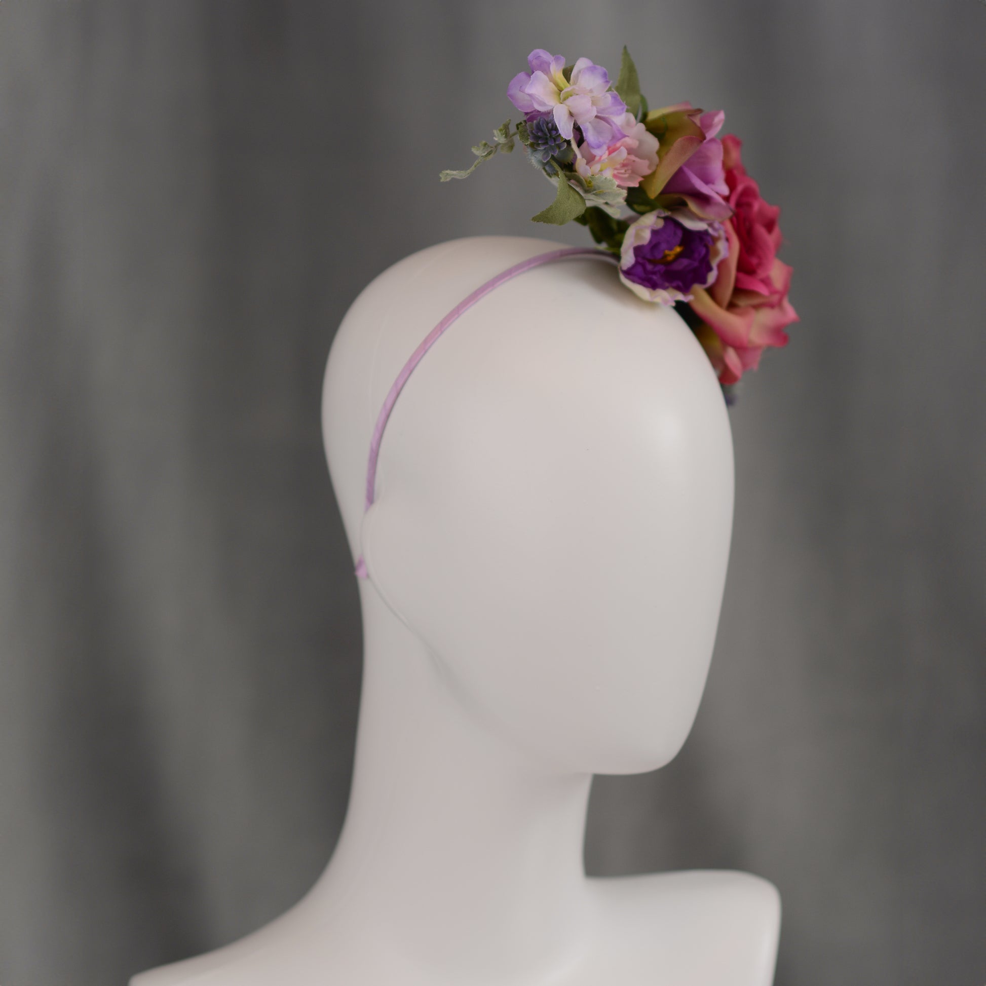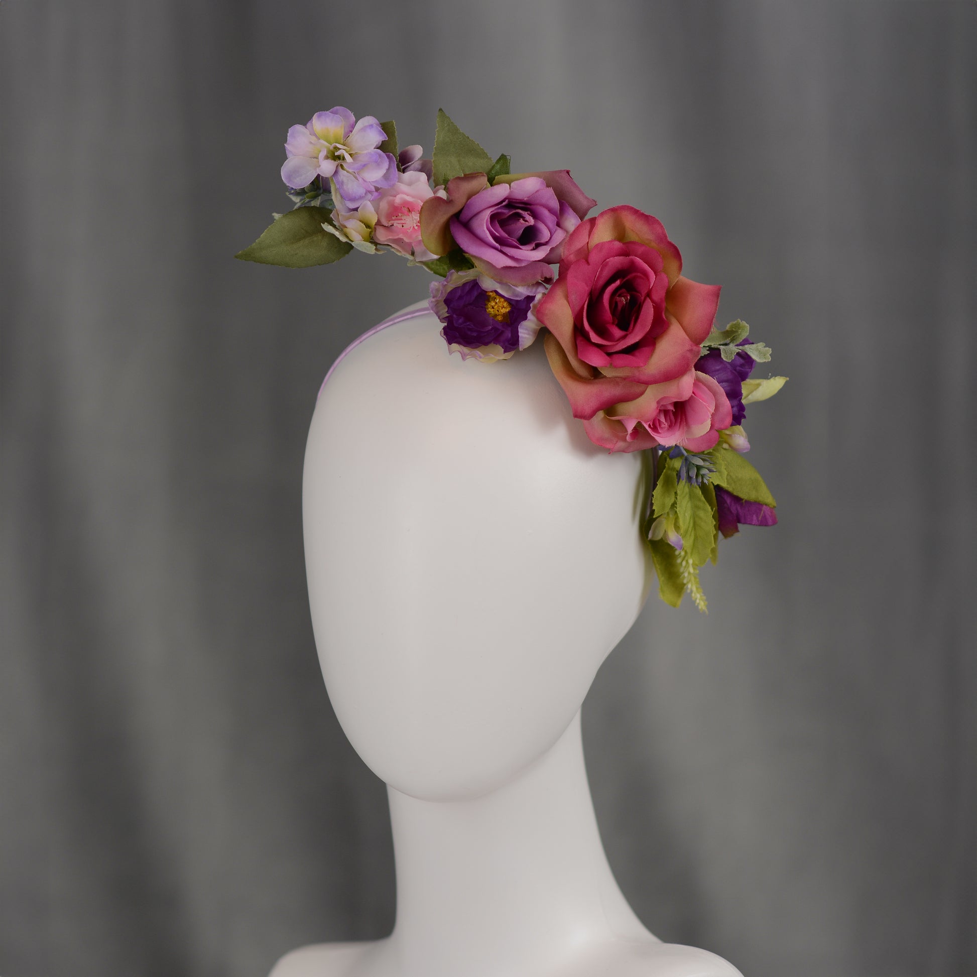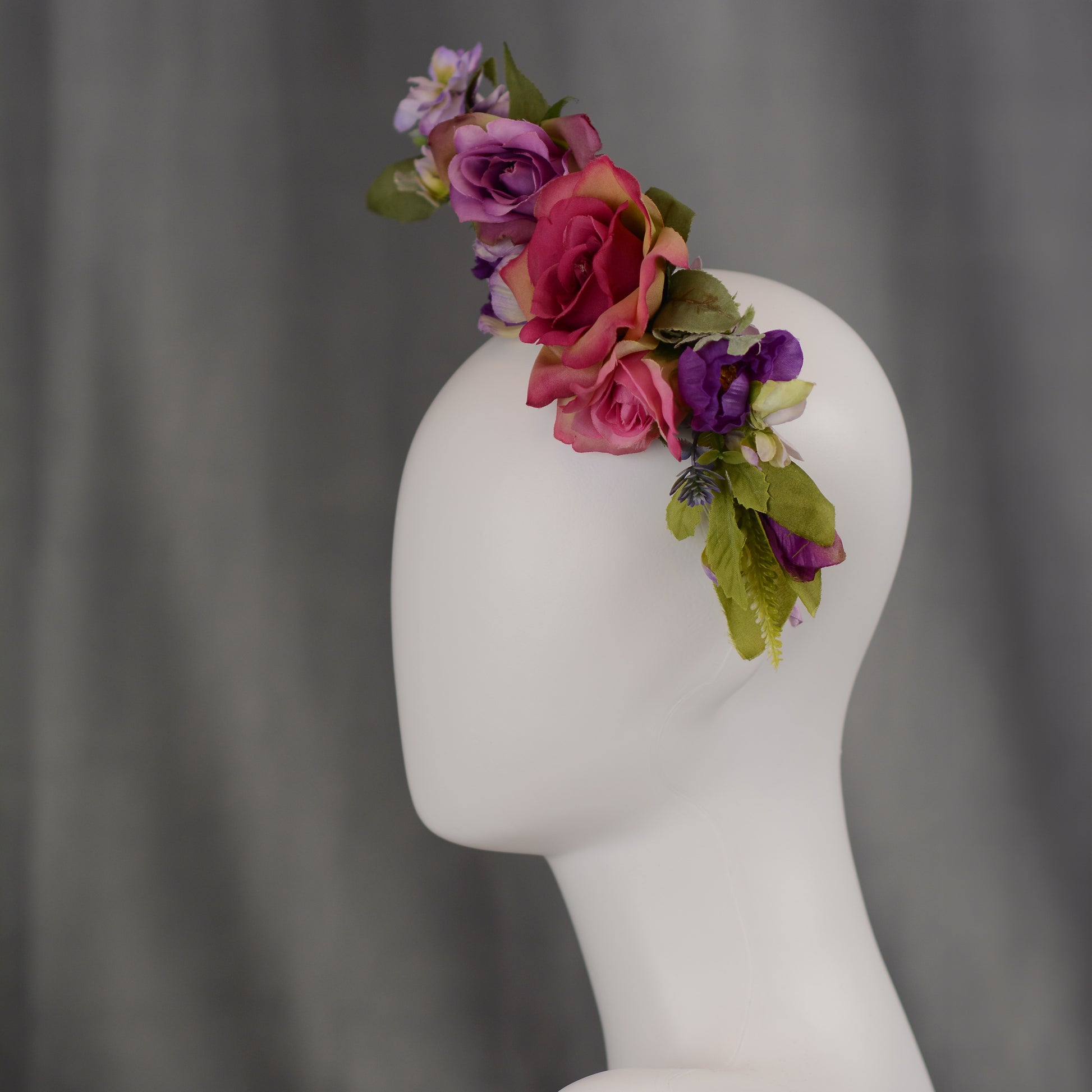 Bold and dramatic one of a kind sculptural floral headpiece. Featuring a stunning sweep of realistic roses, ranunculus, sweet peas and hydrangea blossom in beautiful shades of pink and purple framed with green leaves.