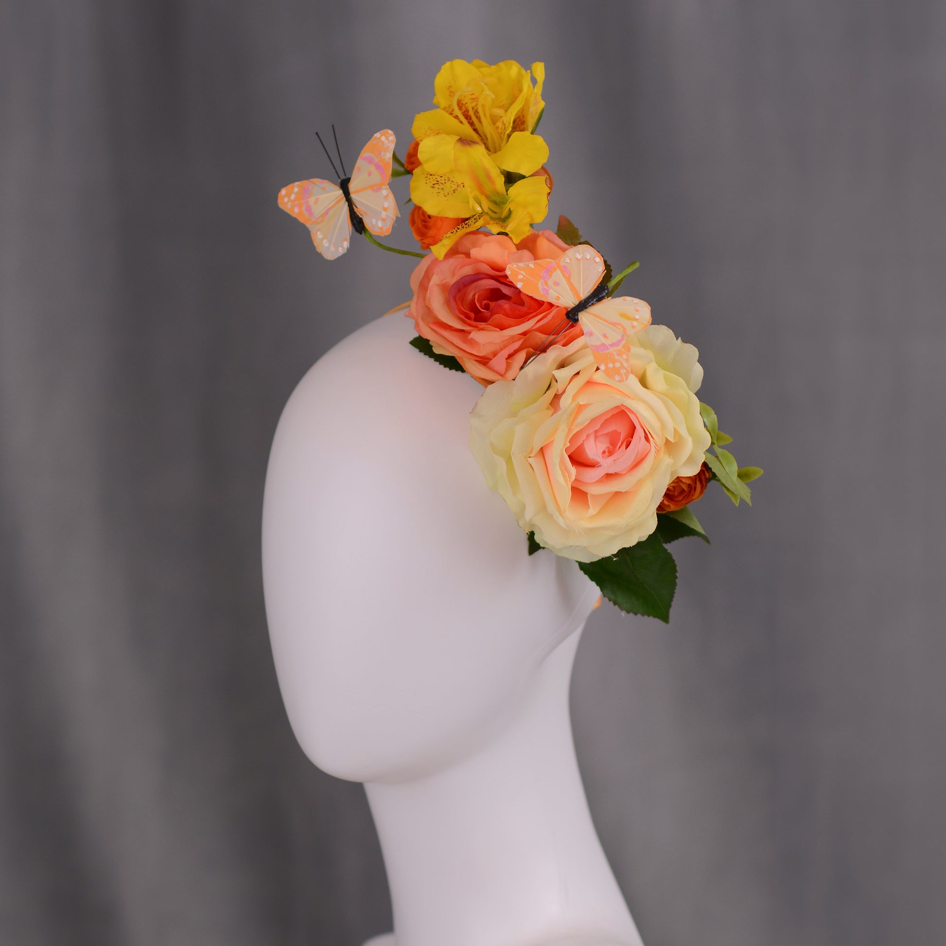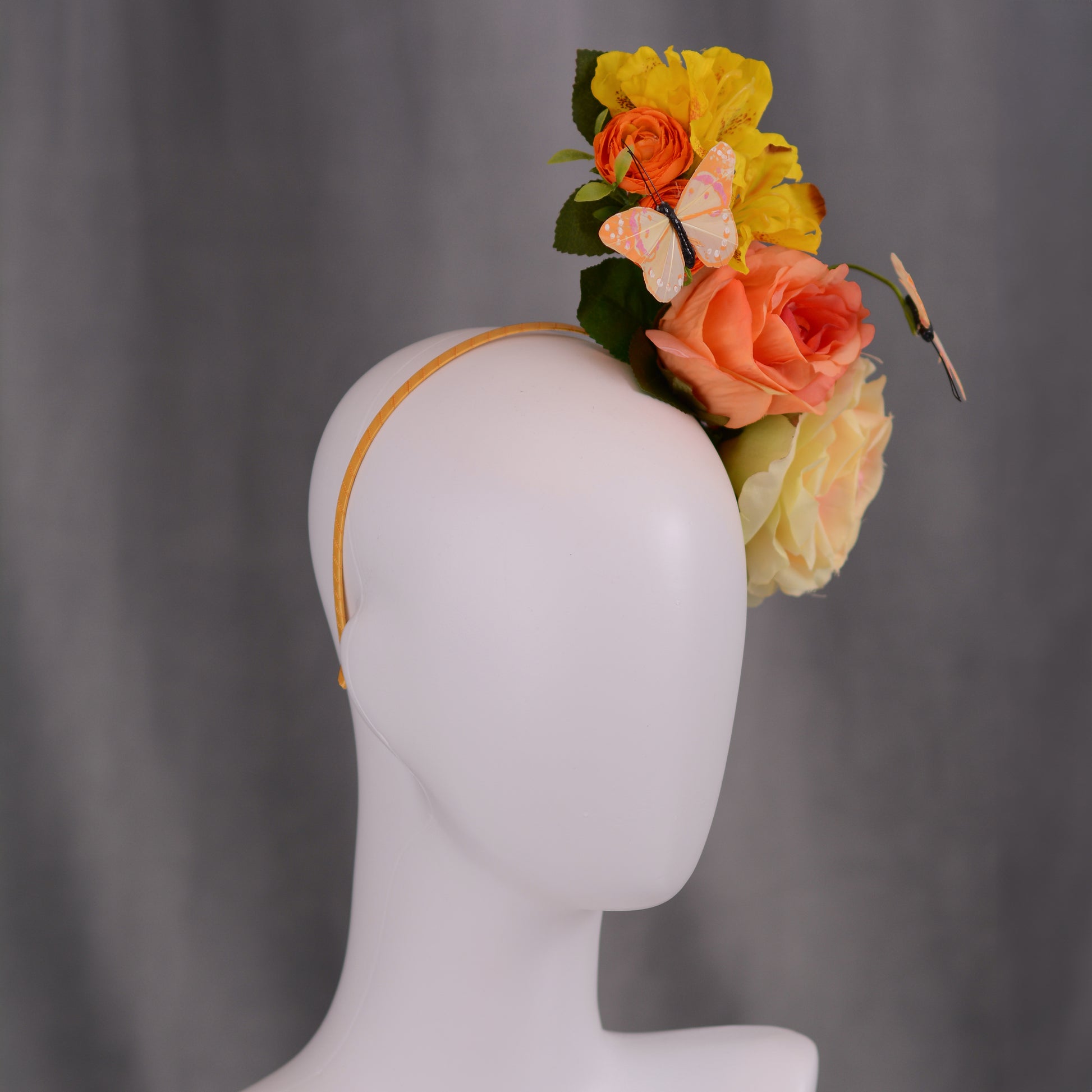 Bold and one of a kind sculptural floral headpiece. Featuring realistic roses and ranunculus in sunset shades of yellow and orange with yellow butterflies framed with greenery.