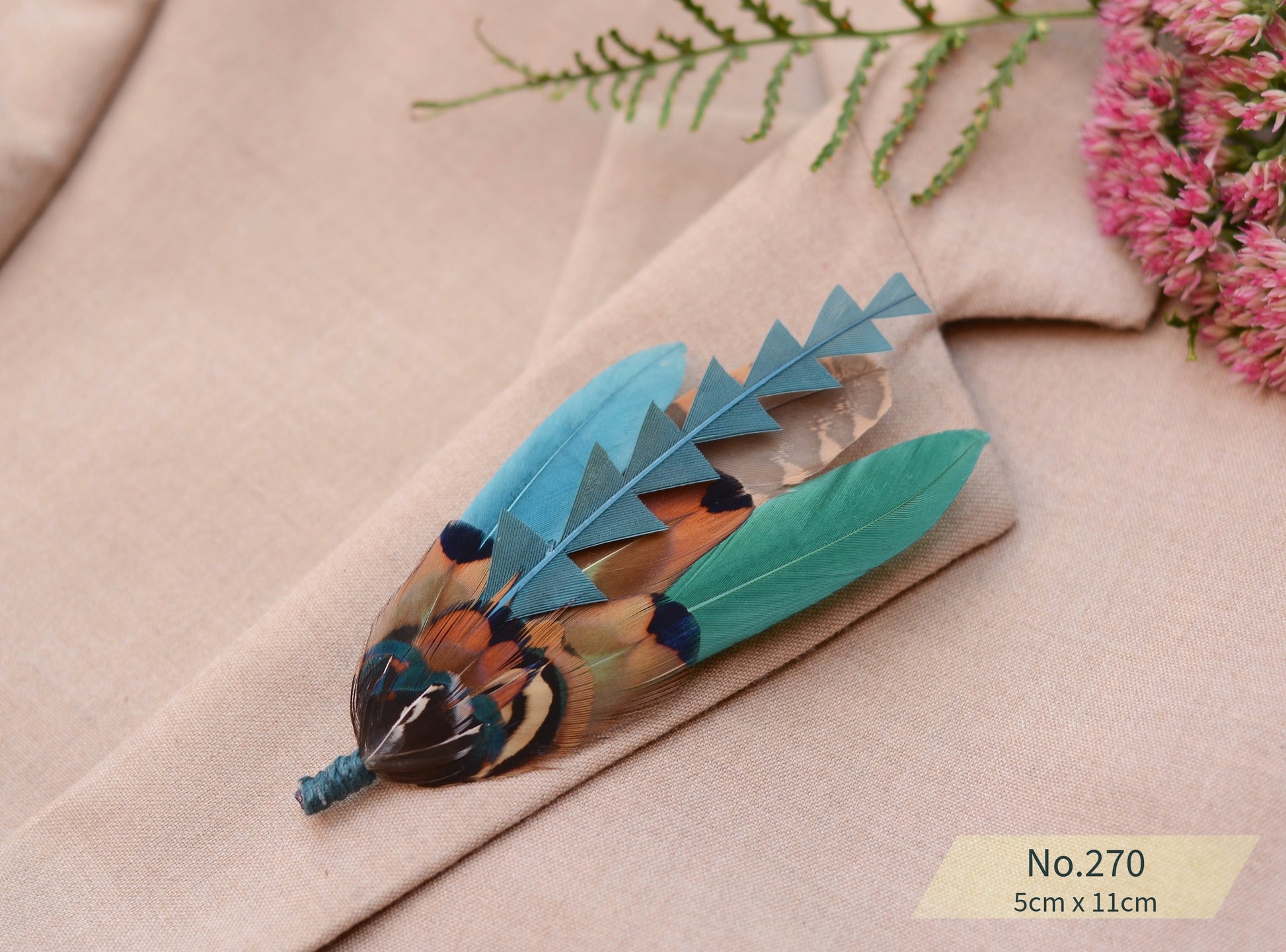Feather lapel pin boutonniere featuring a mix of pheasant feathers in a stunning tonal mix of bright coppers, deep blacks, rich golden browns and iridescent navy blues, complemented with beautiful duck and rooster feathers dyed in shades of teal turquoise and green. This piece features a beautiful variation in tones, textures and shapes. Finished with teal blue twine at the base.