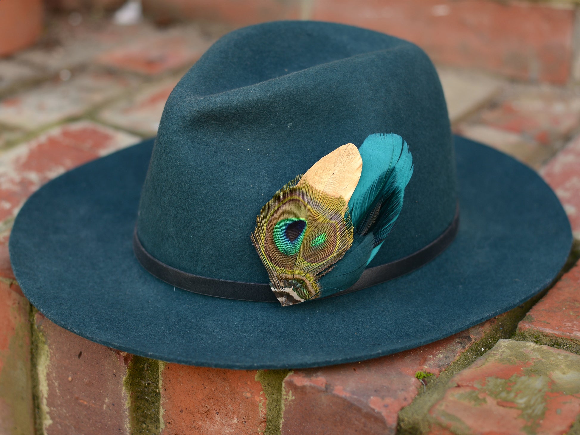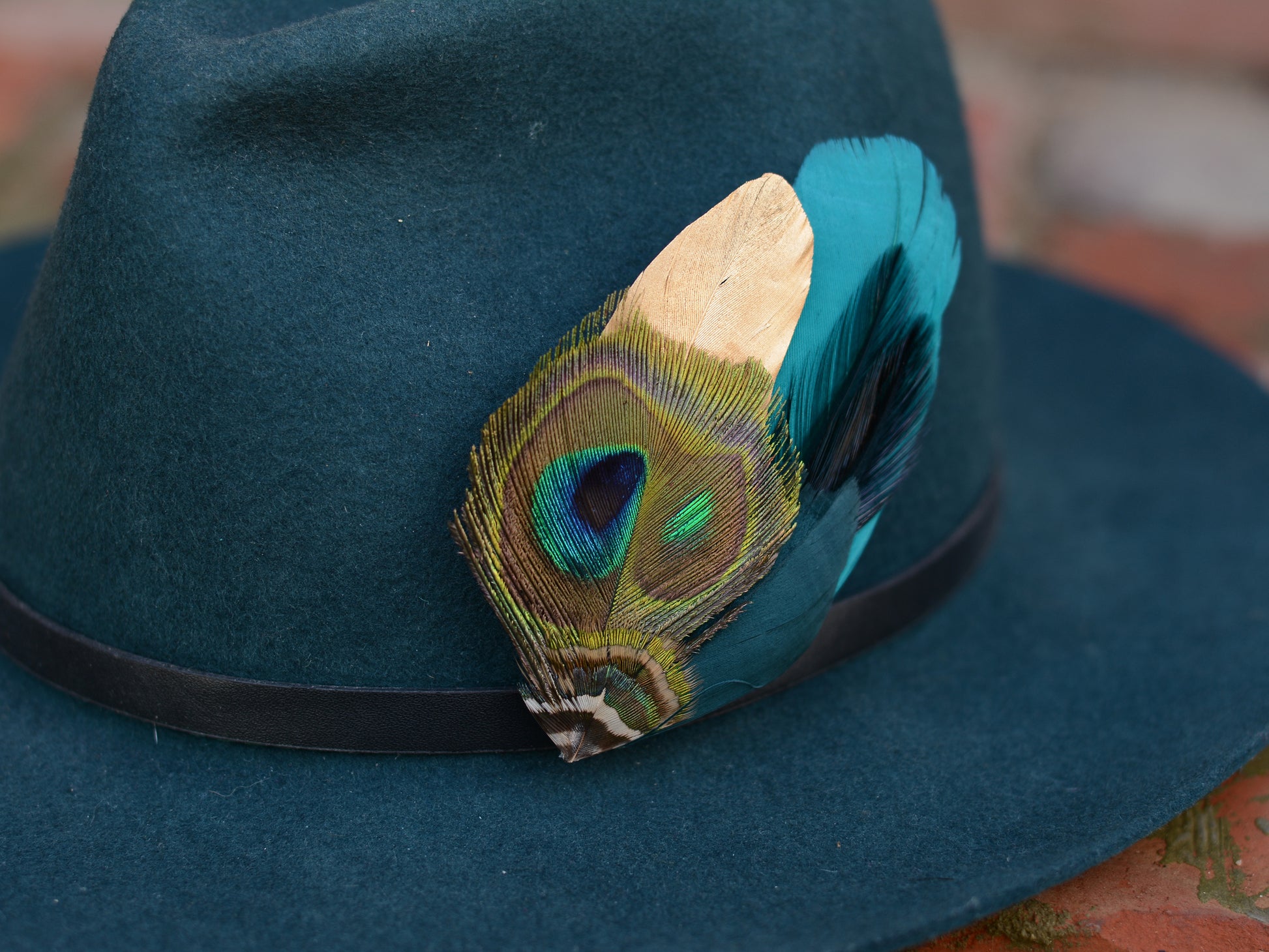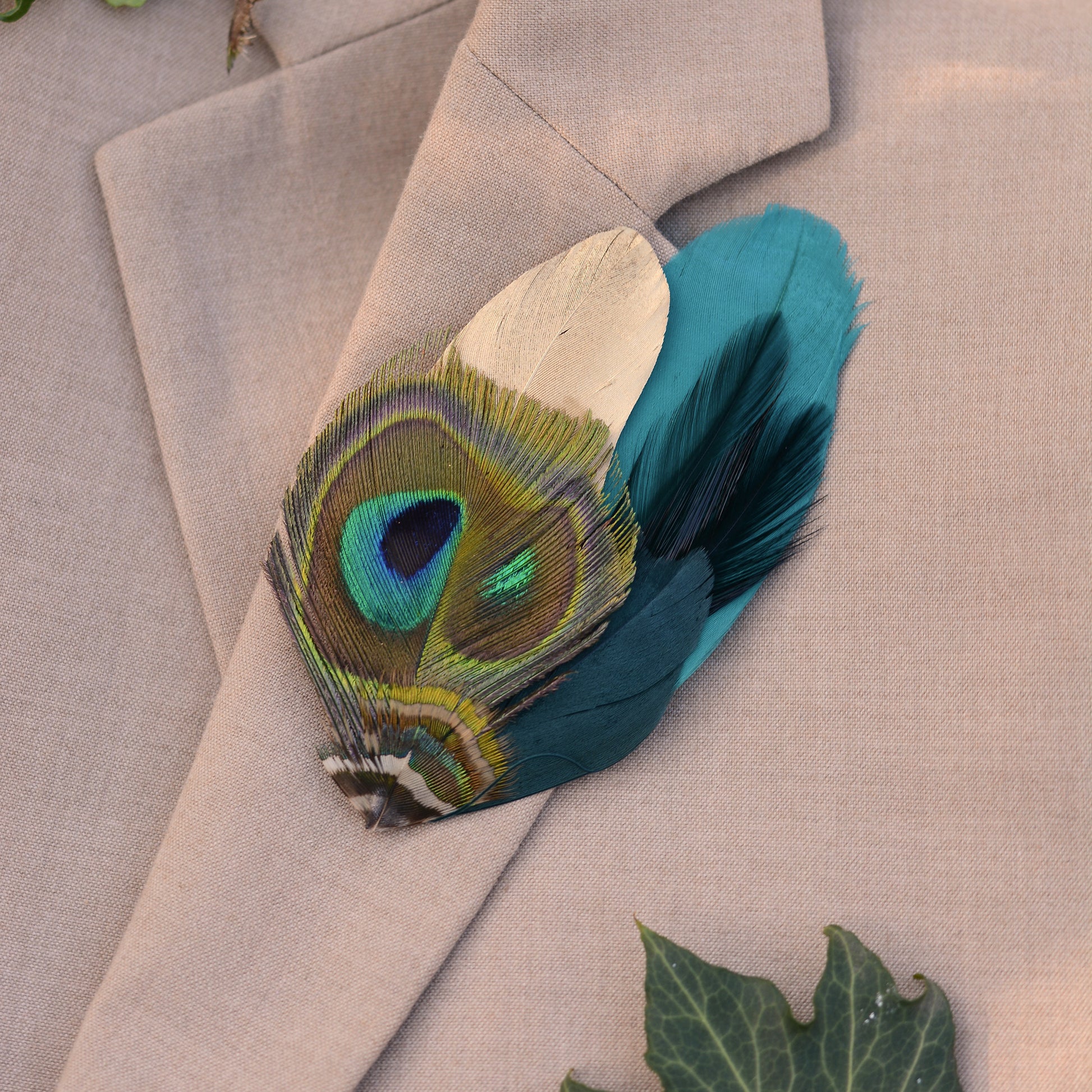 One of a kind feather hat pin / lapel pin boutonniere featuring a mix of goose and peacock feathers in a stunning tonal mix of rich turquoise, navy, golds and greens featuring a beautiful variation in iridescence, textures and shapes.