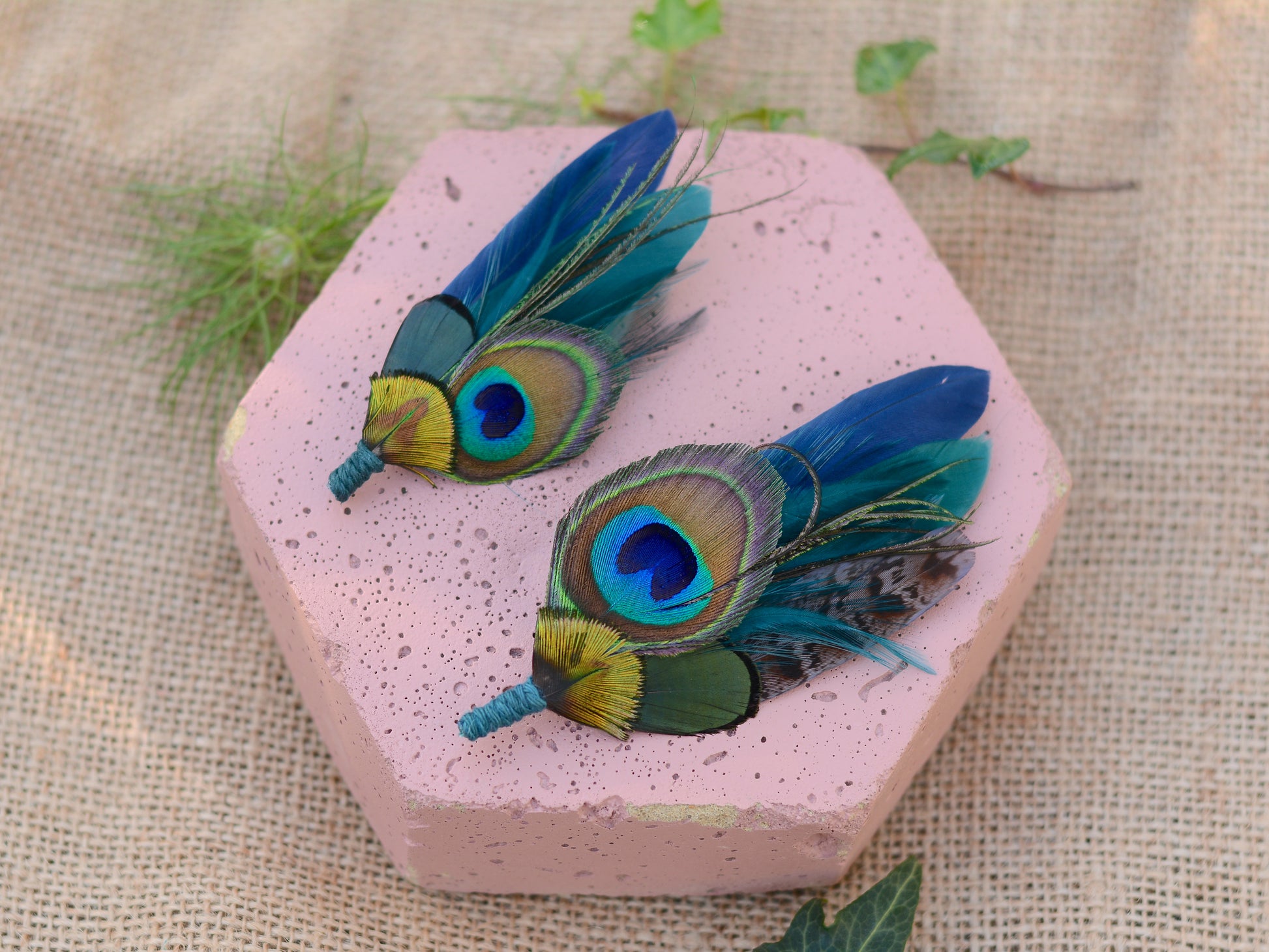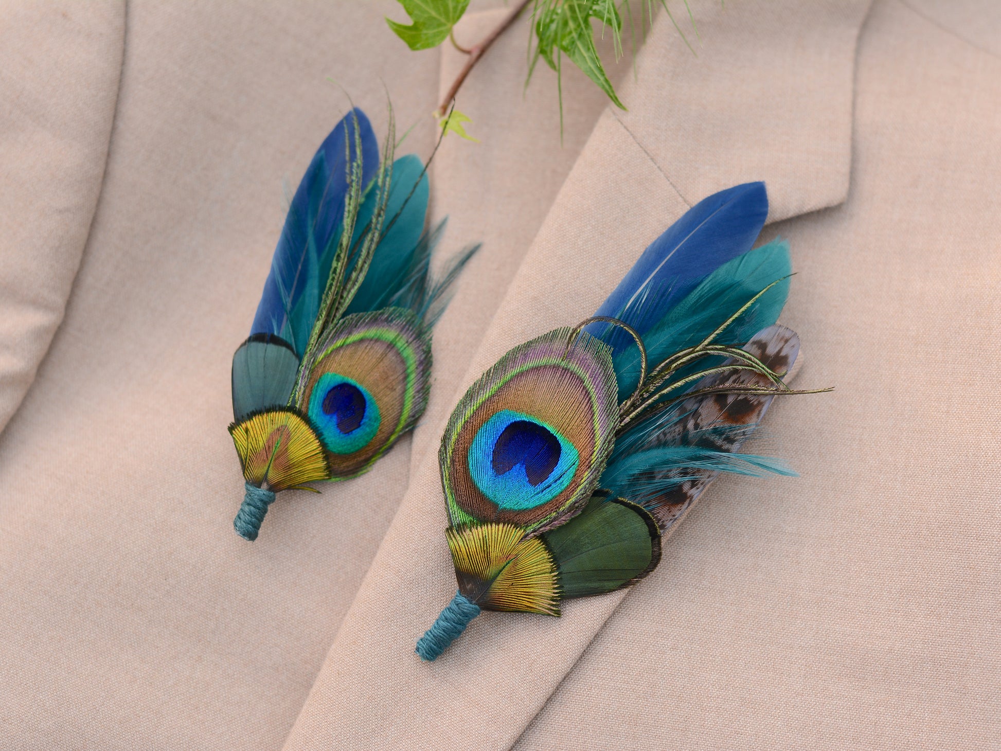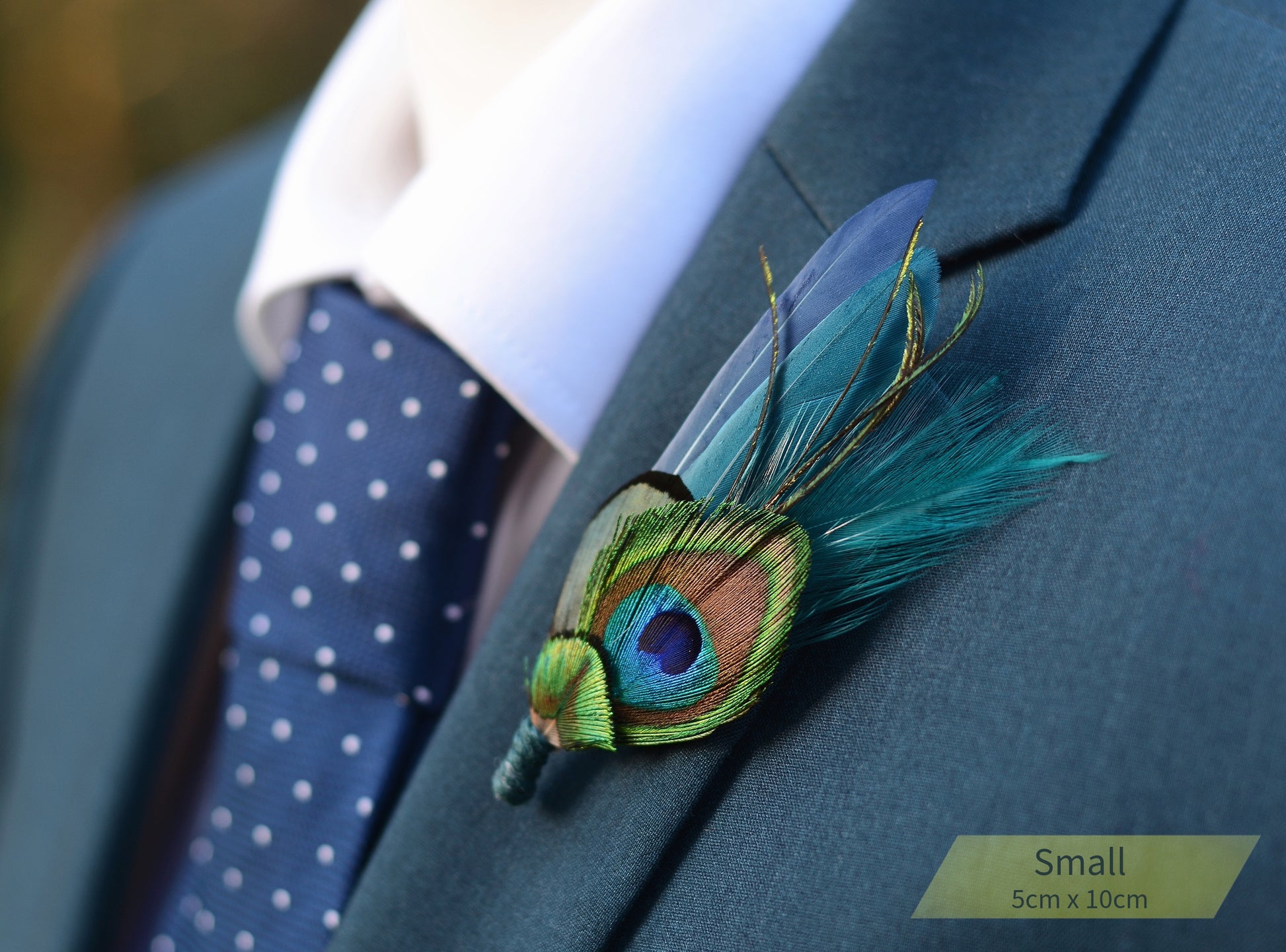Stunning feather hat pin / boutonniere featuring a mix of peacock, pheasant and duck feathers in a stunning tonal mix of rich iridescent golds, greens, turquoise and blues. Finished a the base with blue -green twine.