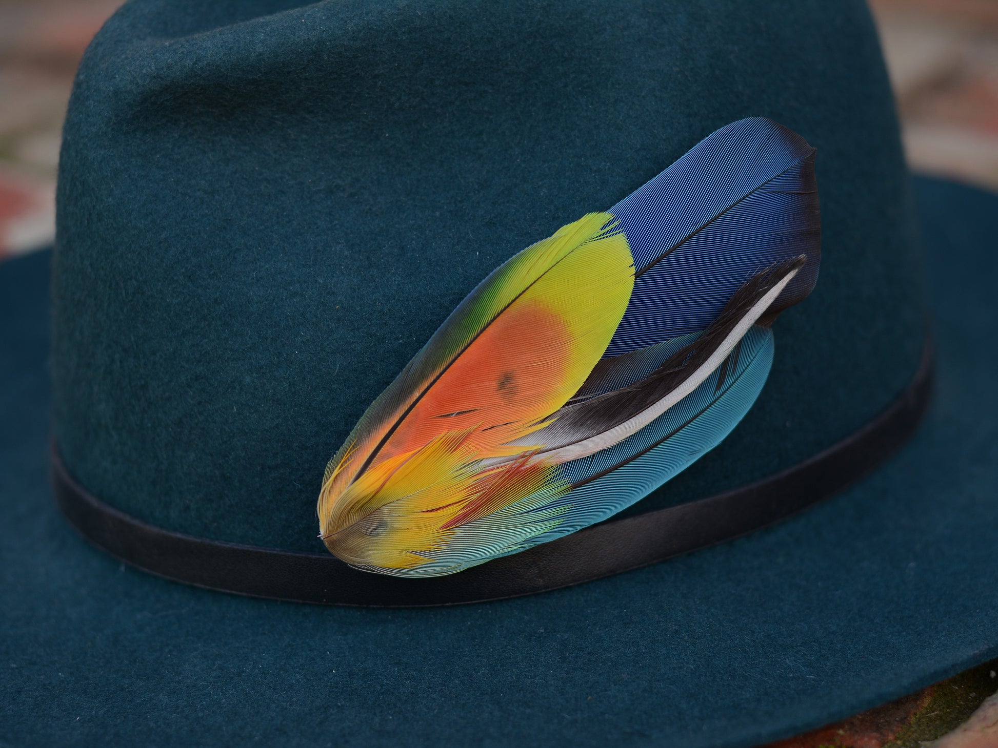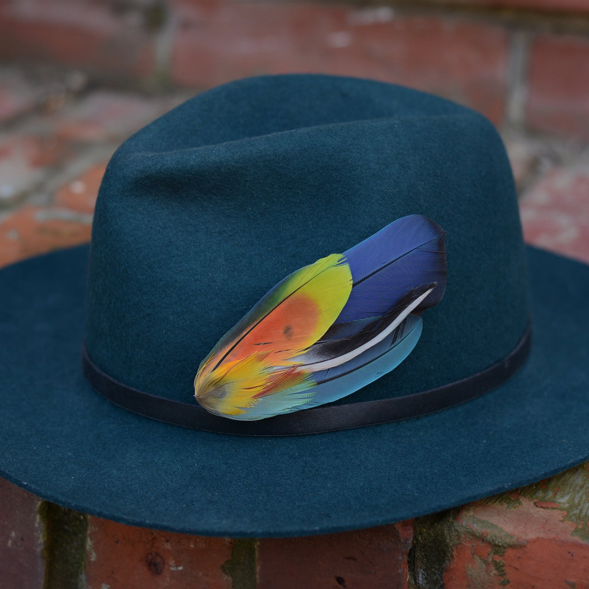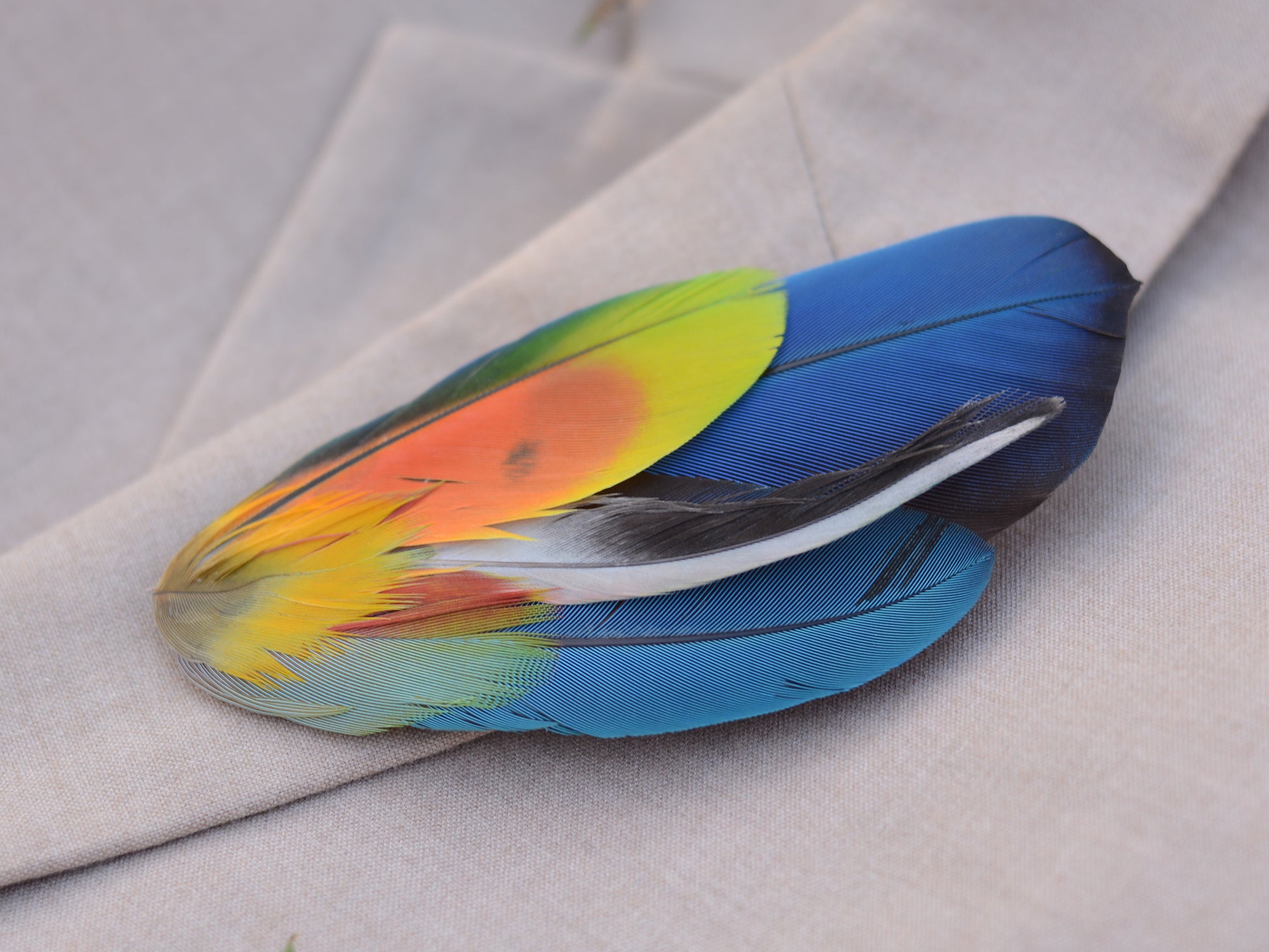 One of a kind feather hat pin boutonniere featuring a mix of naturally shed ethically sourced parrot feathers in a stunning vibrant tonal shades ob lue, green, yellow, orange and red with beautiful markings.