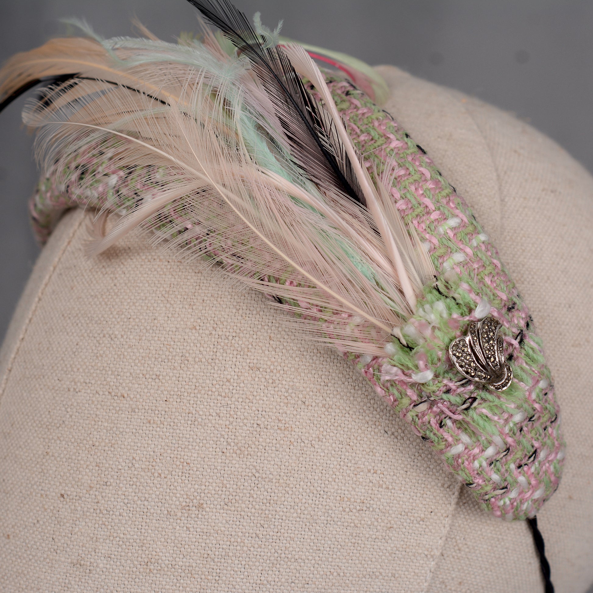 Elegant and classic couture feather fascinator bandeau headband featuring a hand-blocked and stitched buckram base covered and lined with a beautiful tweed in ivory, pink, mint green and a hint of black. Topped off with a feather spray mount in shades to match the tweed and a vintage silver marquisite button detail.