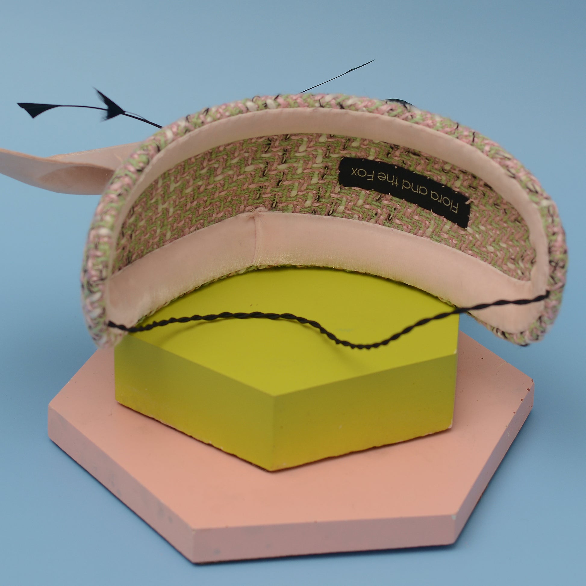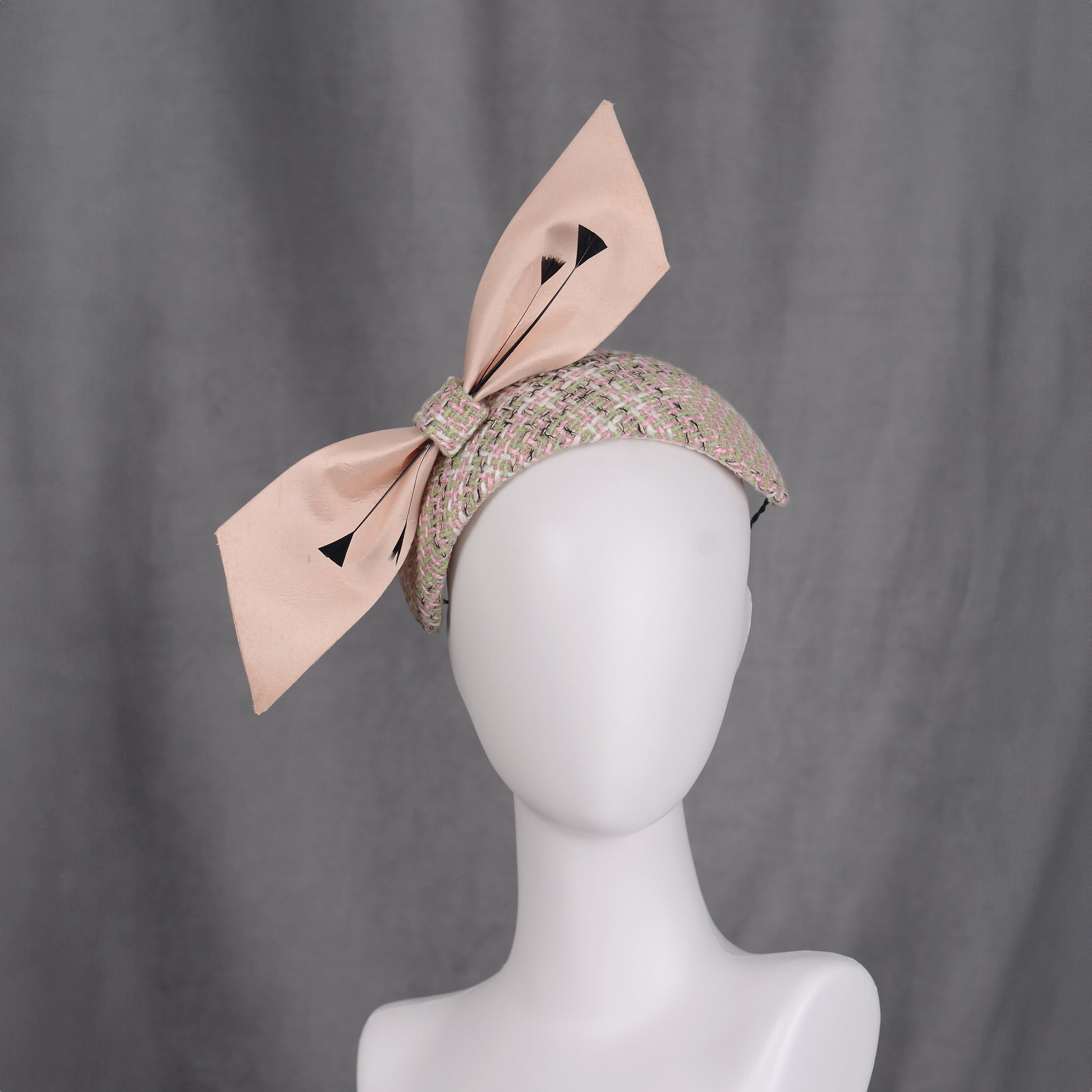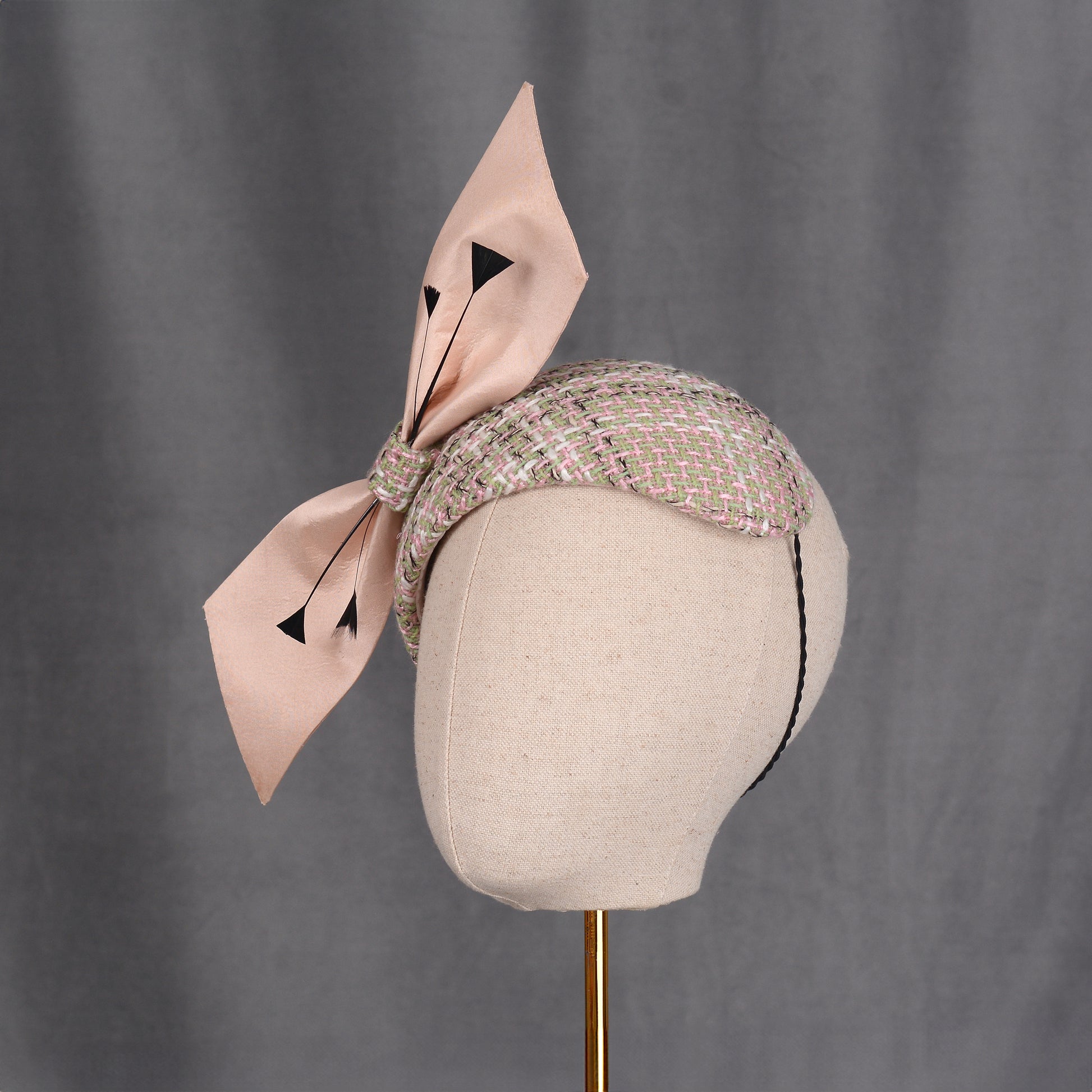 Elegant and classic couture feather fascinator bandeau headband featuring a hand-blocked and stitched buckram base covered and lined with a beautiful tweed in ivory, pink, mint green and a hint of black. Topped off with a giant angular bow in pale blush pink accented with black feather work perfectly accenting the tones in the tweed.